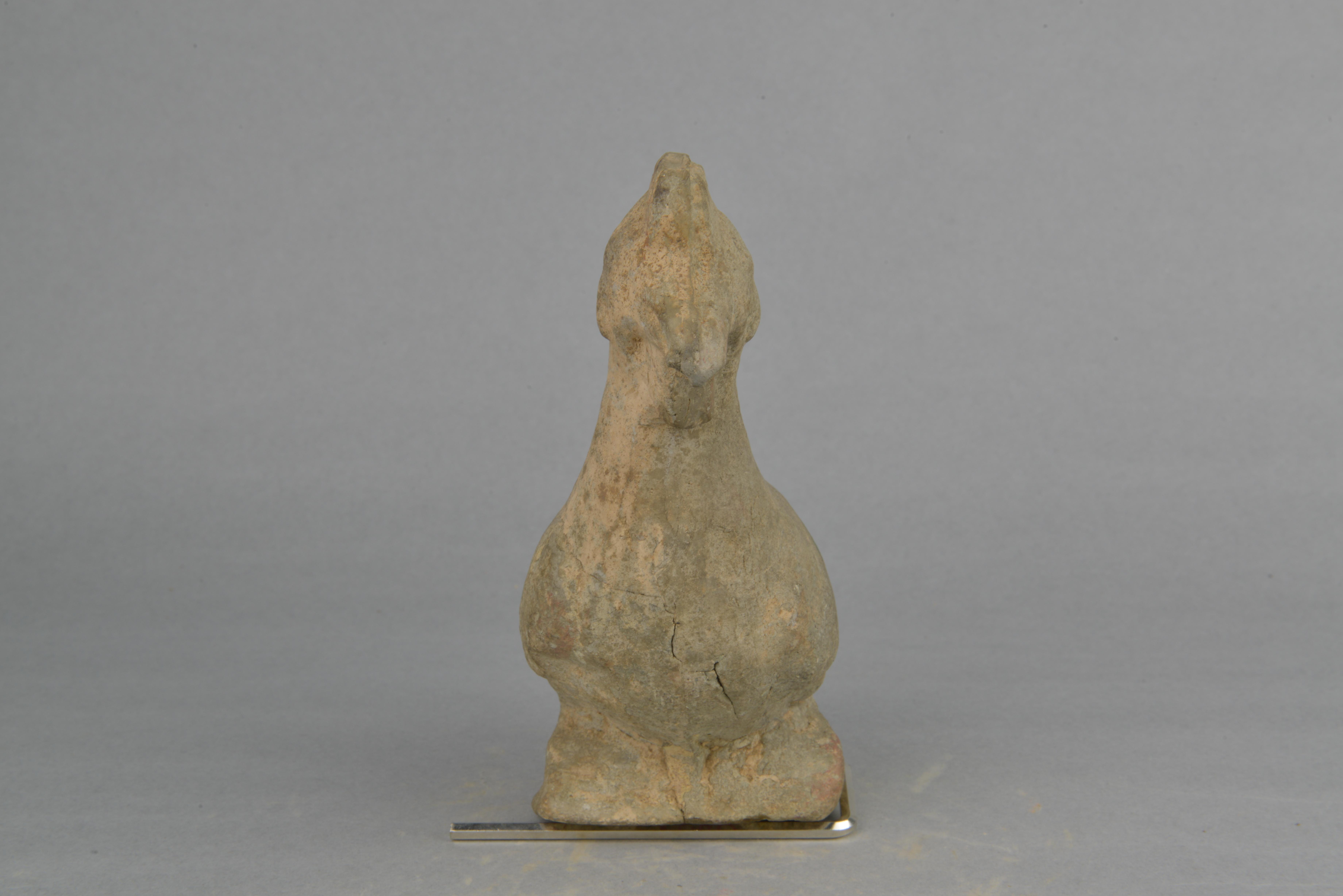 泥质灰陶。站立状,头顶有冠,颈下有重冠,双翅刻划不明显,双爪合并作长方形。