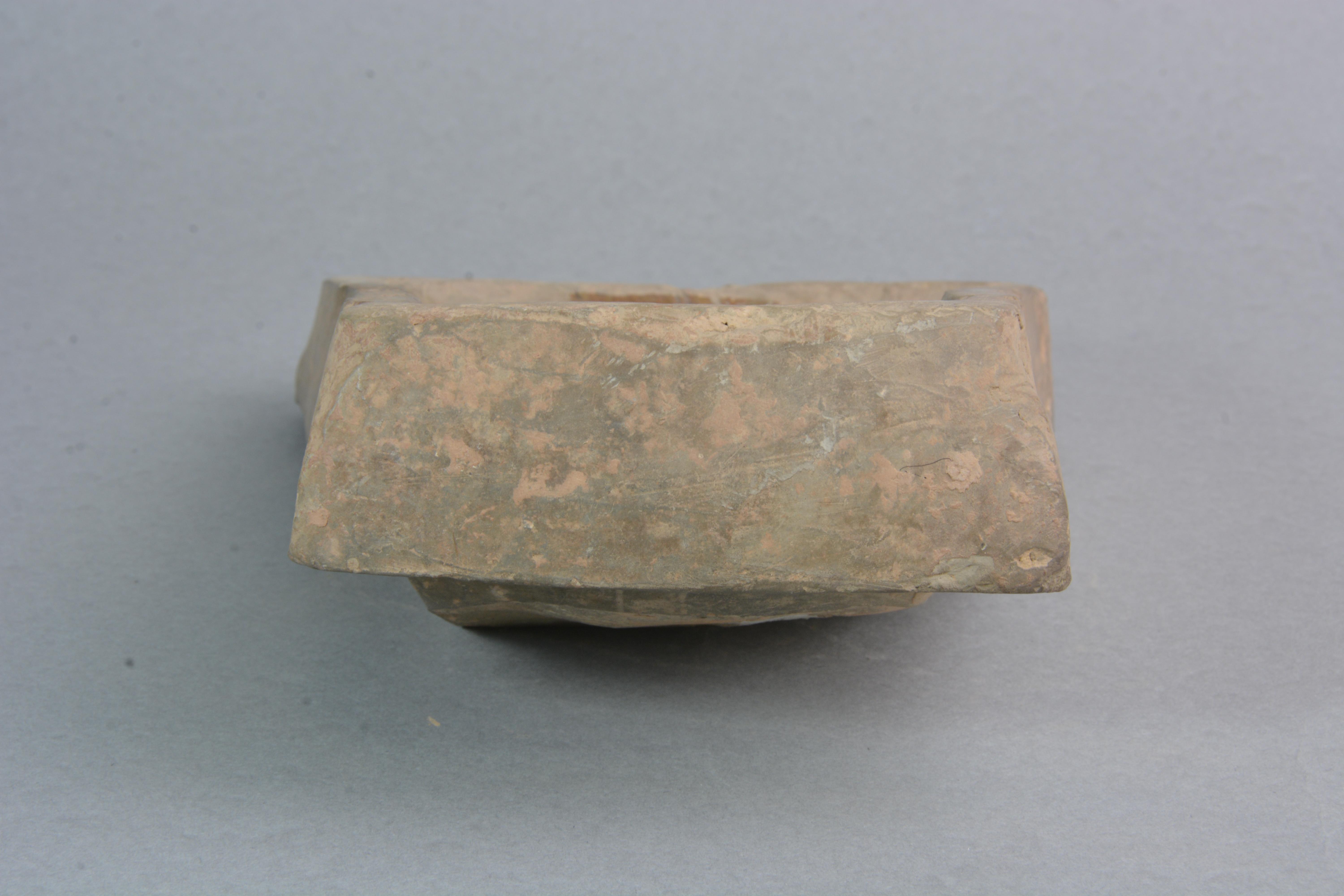 泥质灰陶。形如簸箕,上窄下宽,三面有沿,尾端两侧向外撇,砚底有斜台。
