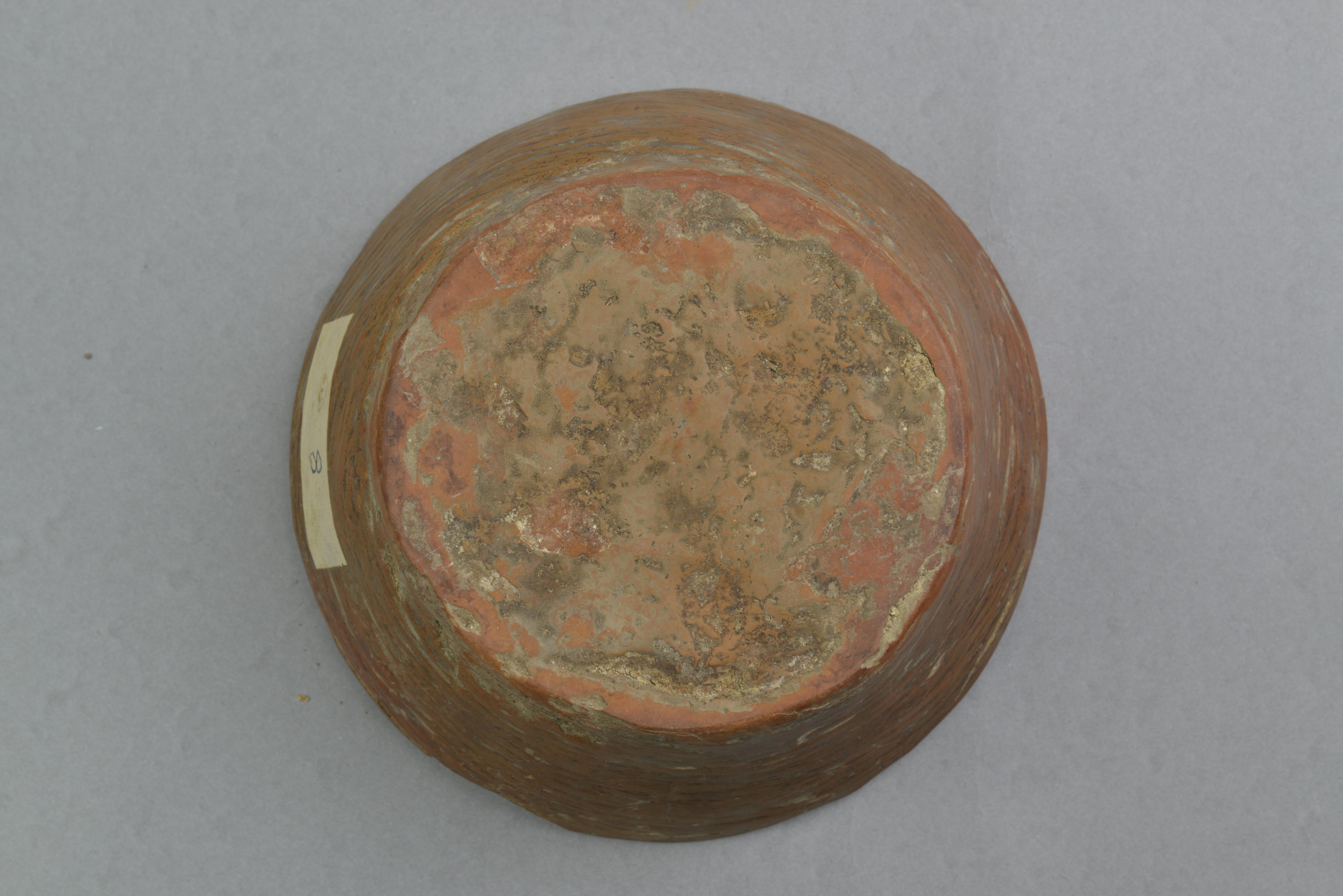 泥质红陶,侈口,斜腹,平底。腹部饰篮纹。