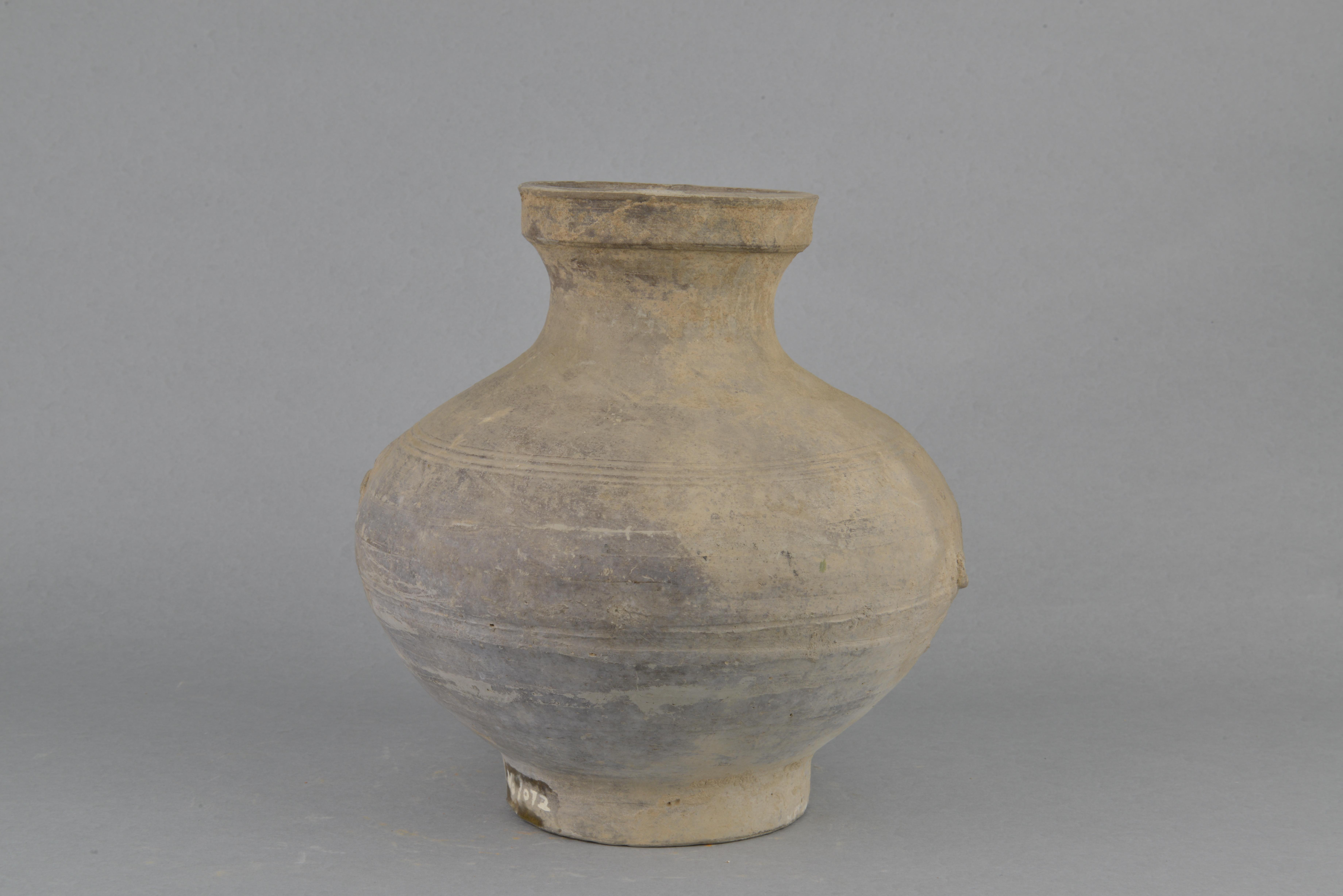 泥质灰陶。敞口,方唇,束颈,鼓腹,平底,腹上部饰三周凹弦纹,腹中部有对称的铺首衔环。