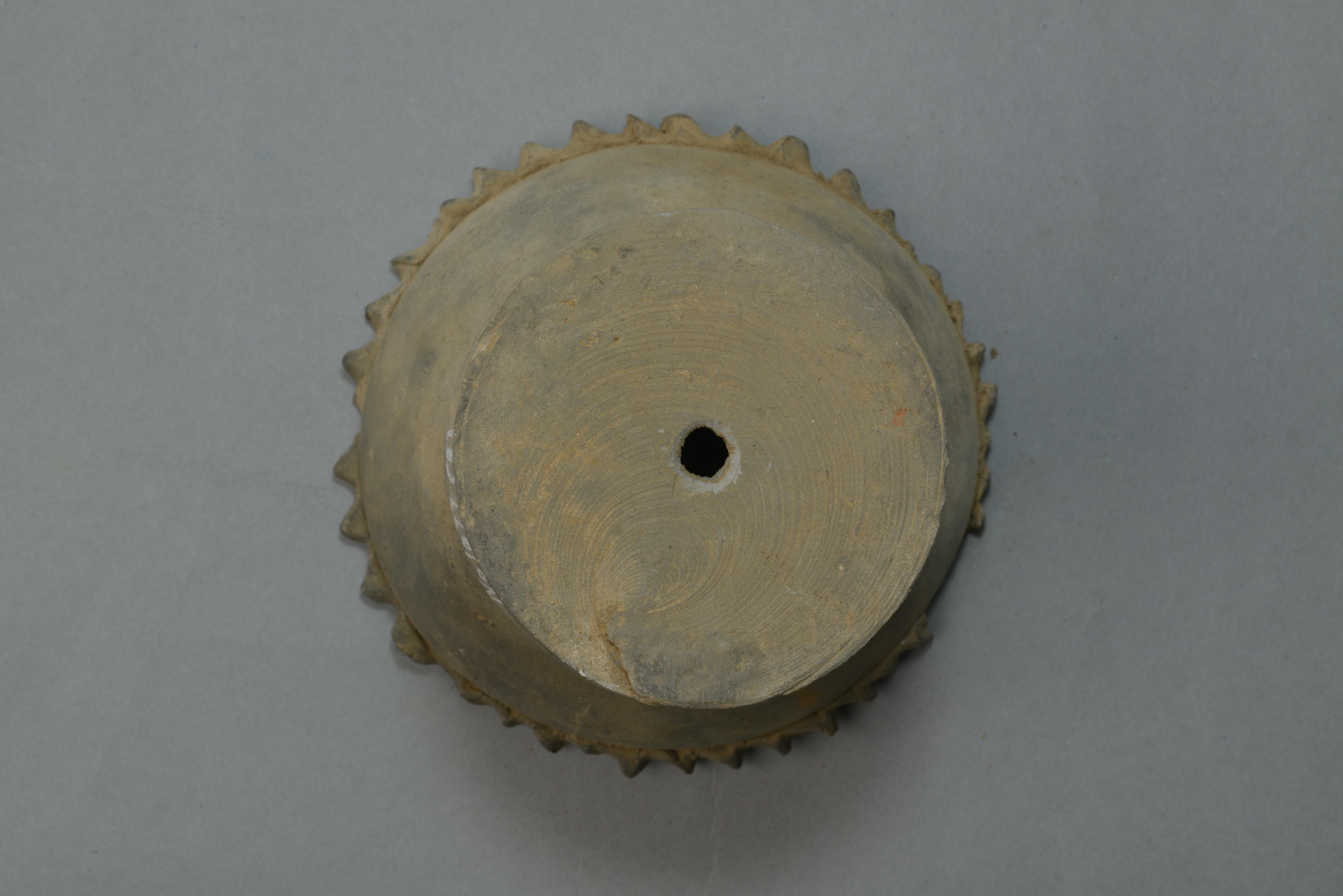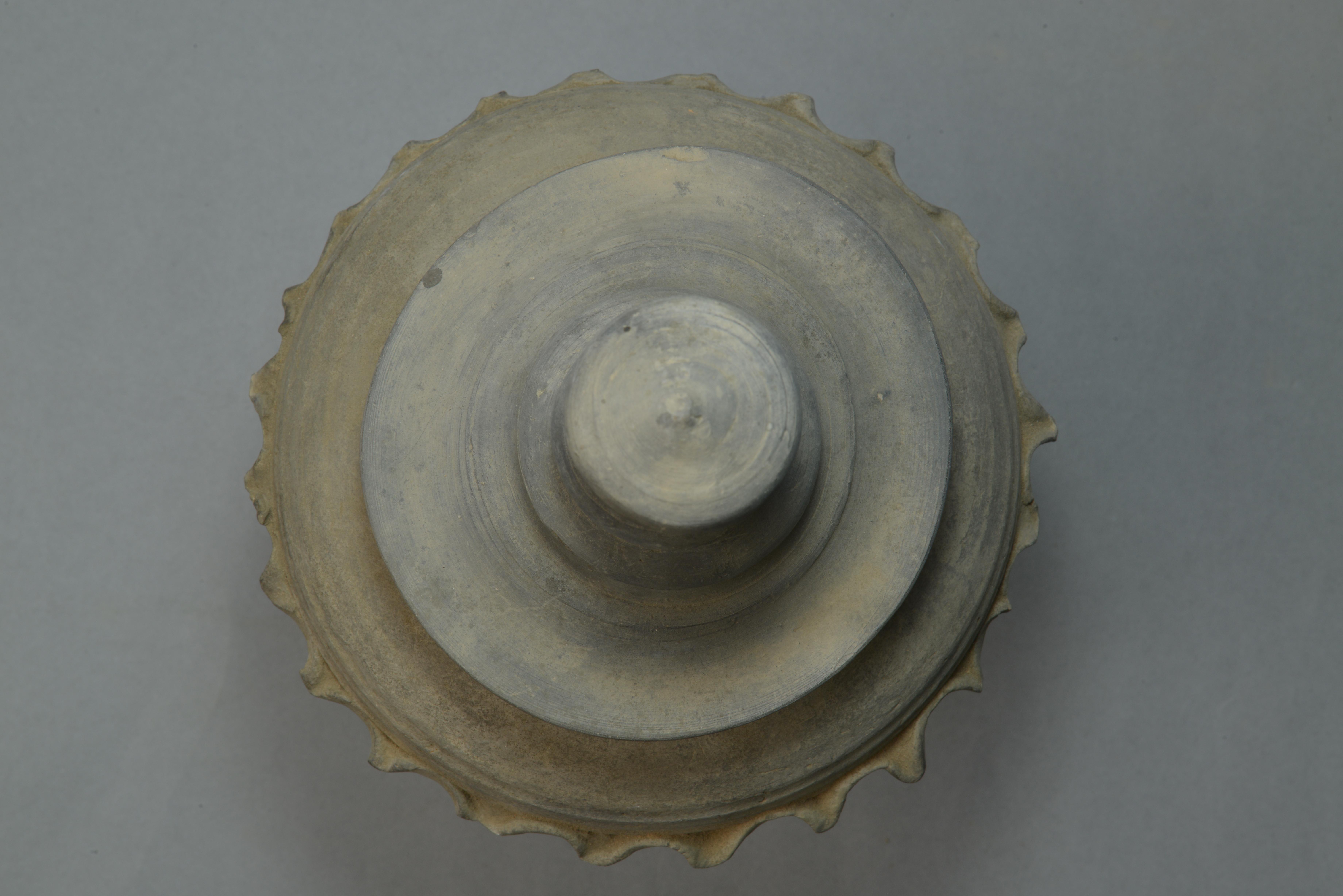 泥质灰陶。由盖、罐、座三部分组成,盖若塔刹状,出宽沿,子母口,罐为直口,鼓腹,平底,腹部饰瓦纹,腹中部加一道堆塑花边,座为束腰喇叭状,口沿加一道堆塑花边。