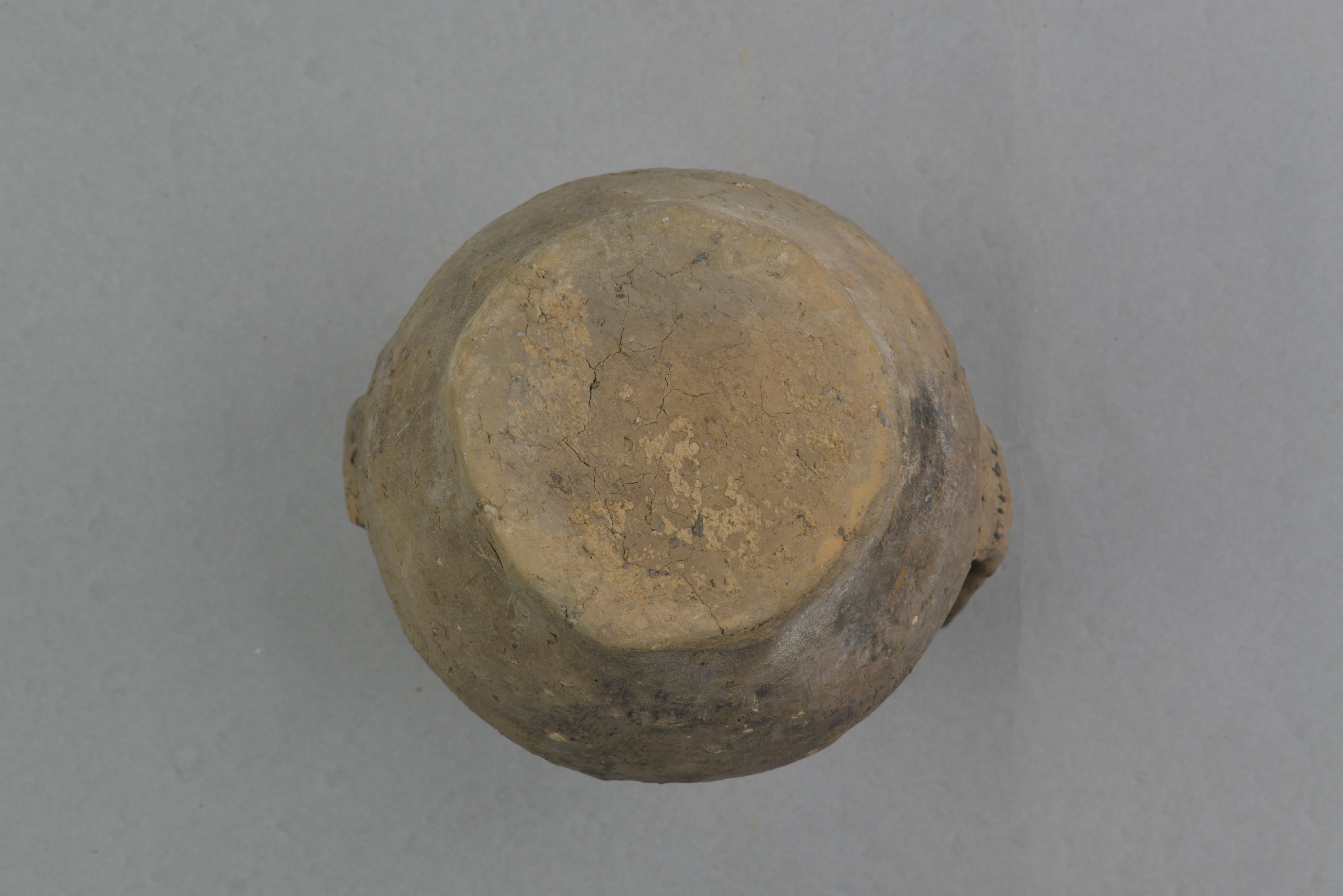 夹砂红陶。马鞍形口,束颈,鼓腹,平底。口腹间作对称双耳。颈部刻划“N”形字符。