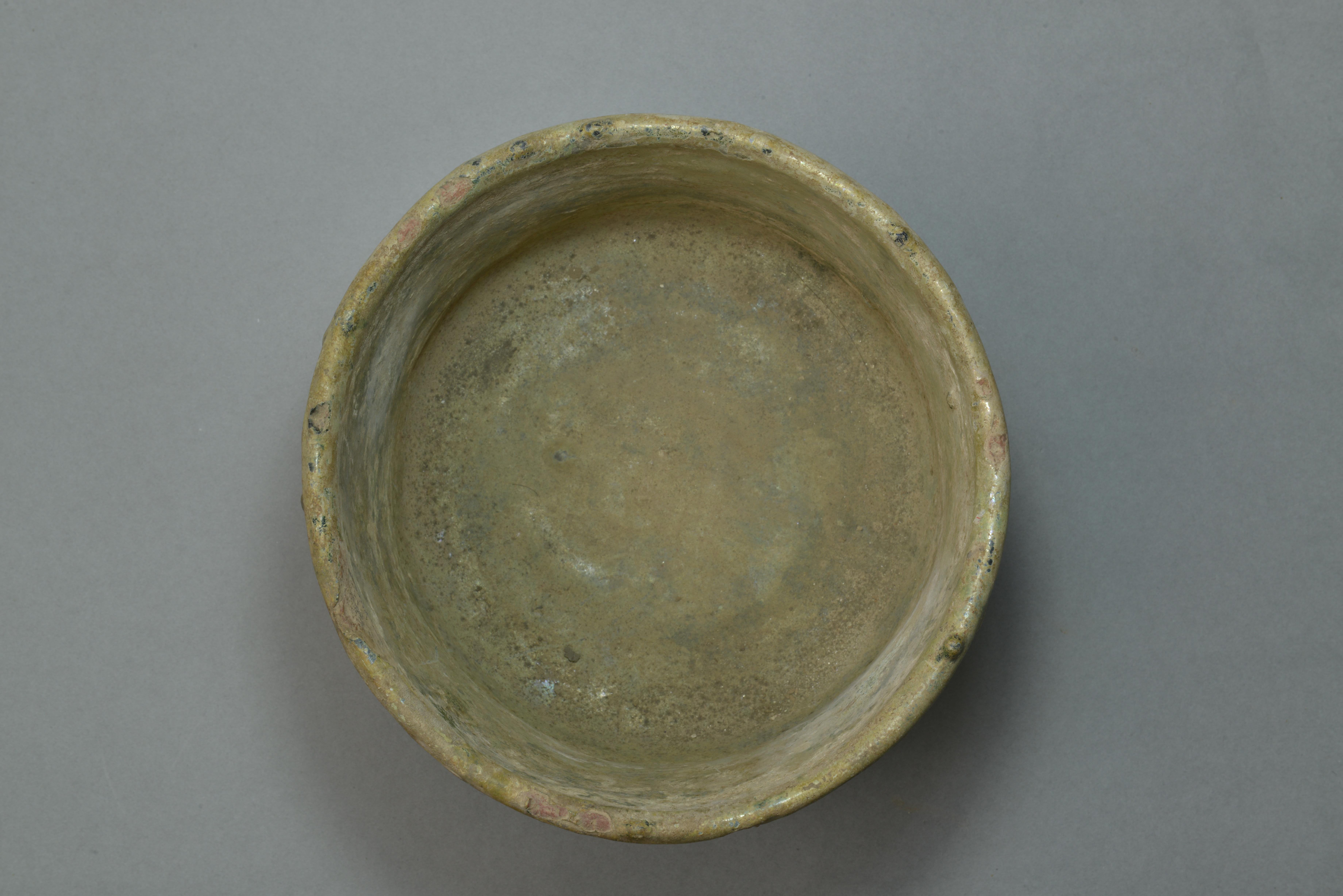 直口,筒形腹,平底,三熊足。腹上下各饰一道凸弦纹,其内浅浮雕饰博山、虎、羊等神兽。器内外皆施绿釉,底部露夹砂红陶胎。