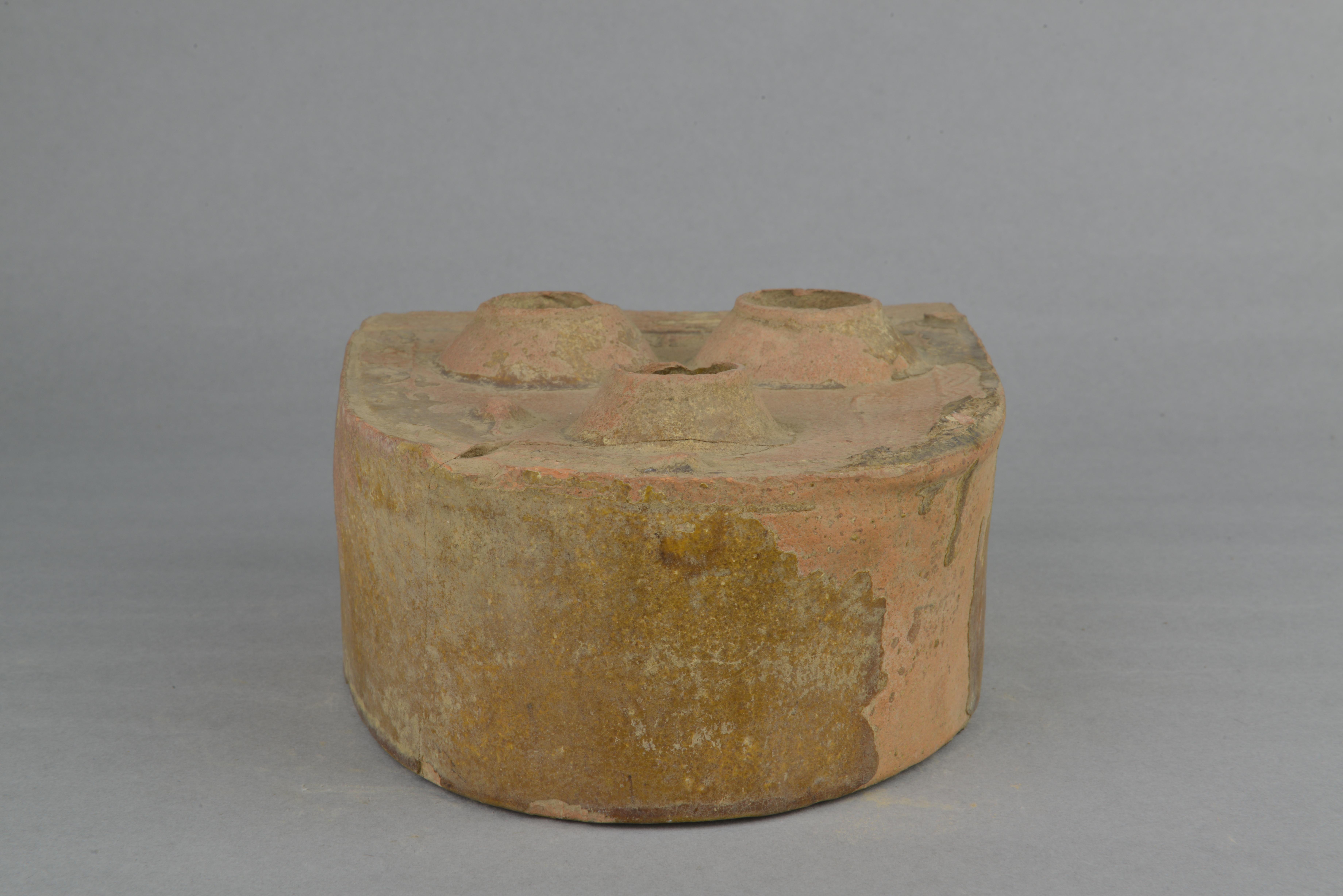 灶面前方后圆,有三个连釜火口,火口后方有一个小烟突。灶面上模印火钩,鱼,勺等物,周边模印菱形纹,灶面前部有遮烟檐,前壁有一方形通地火门,火门一侧为一跪形人,另一侧为一陶罐,外围饰菱形纹。器表施黄釉,器内露红陶胎。