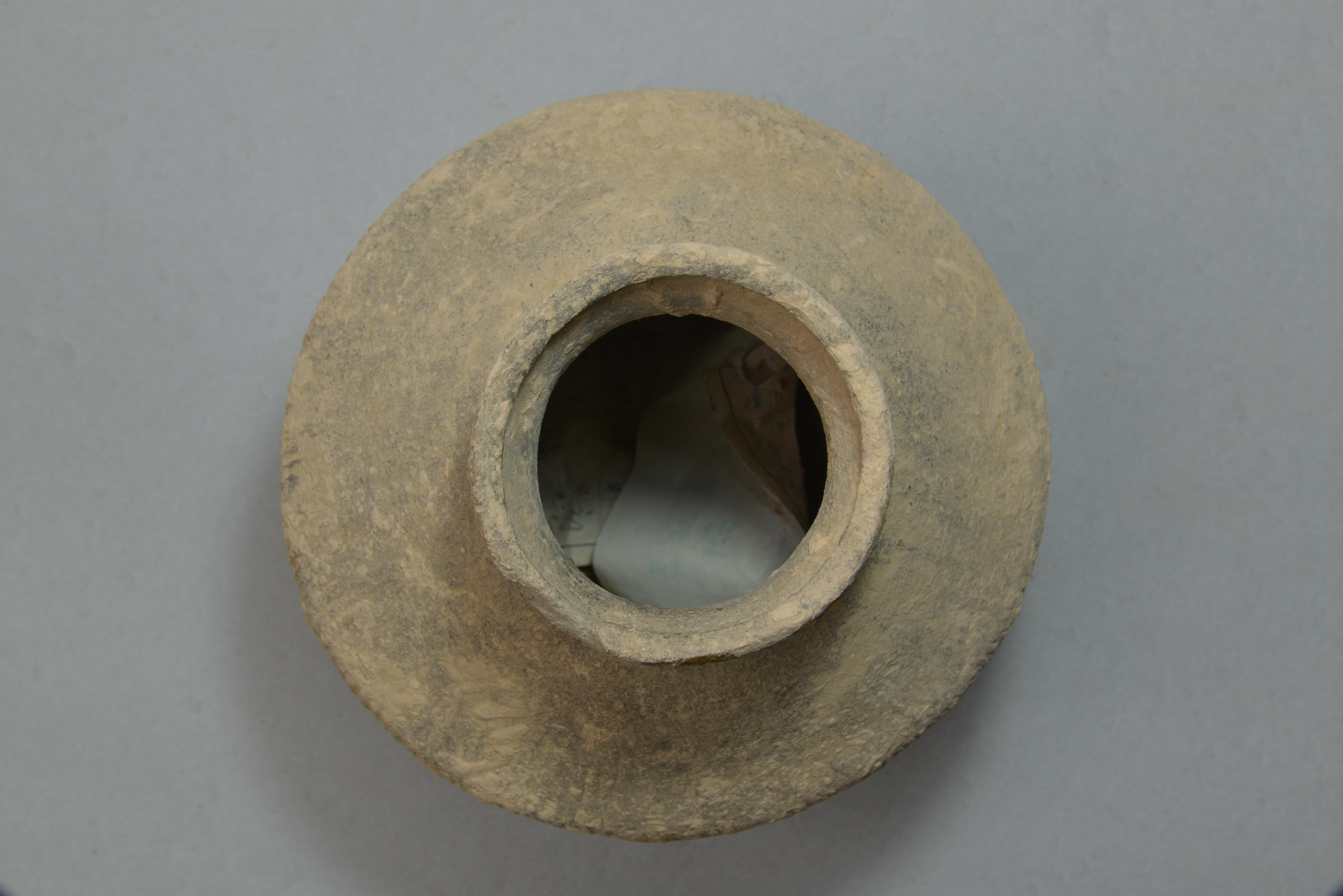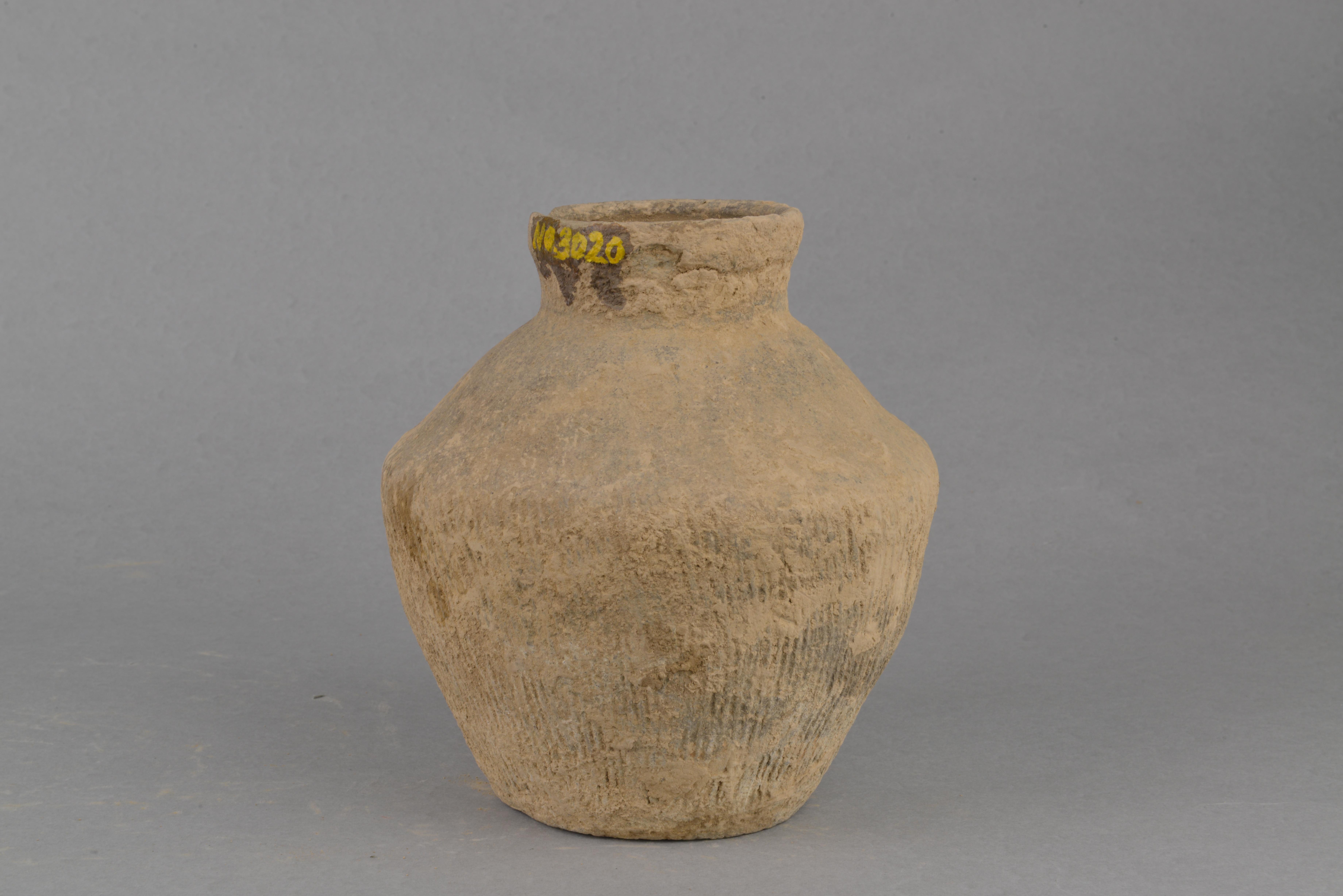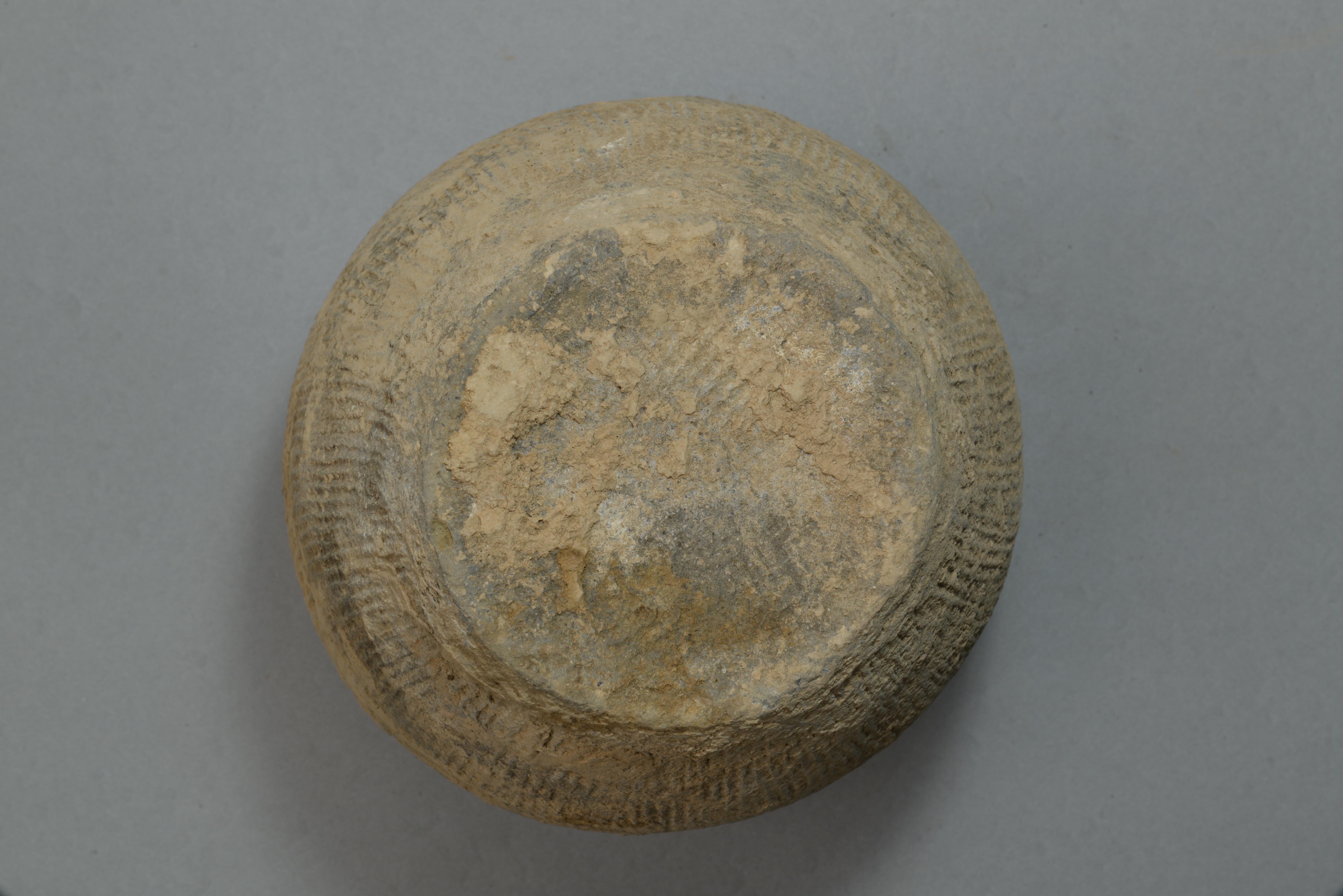 夹砂灰陶。敞口,短颈,折肩,斜腹,平底。腹部满饰竖绳纹,底部饰交叉绳纹。