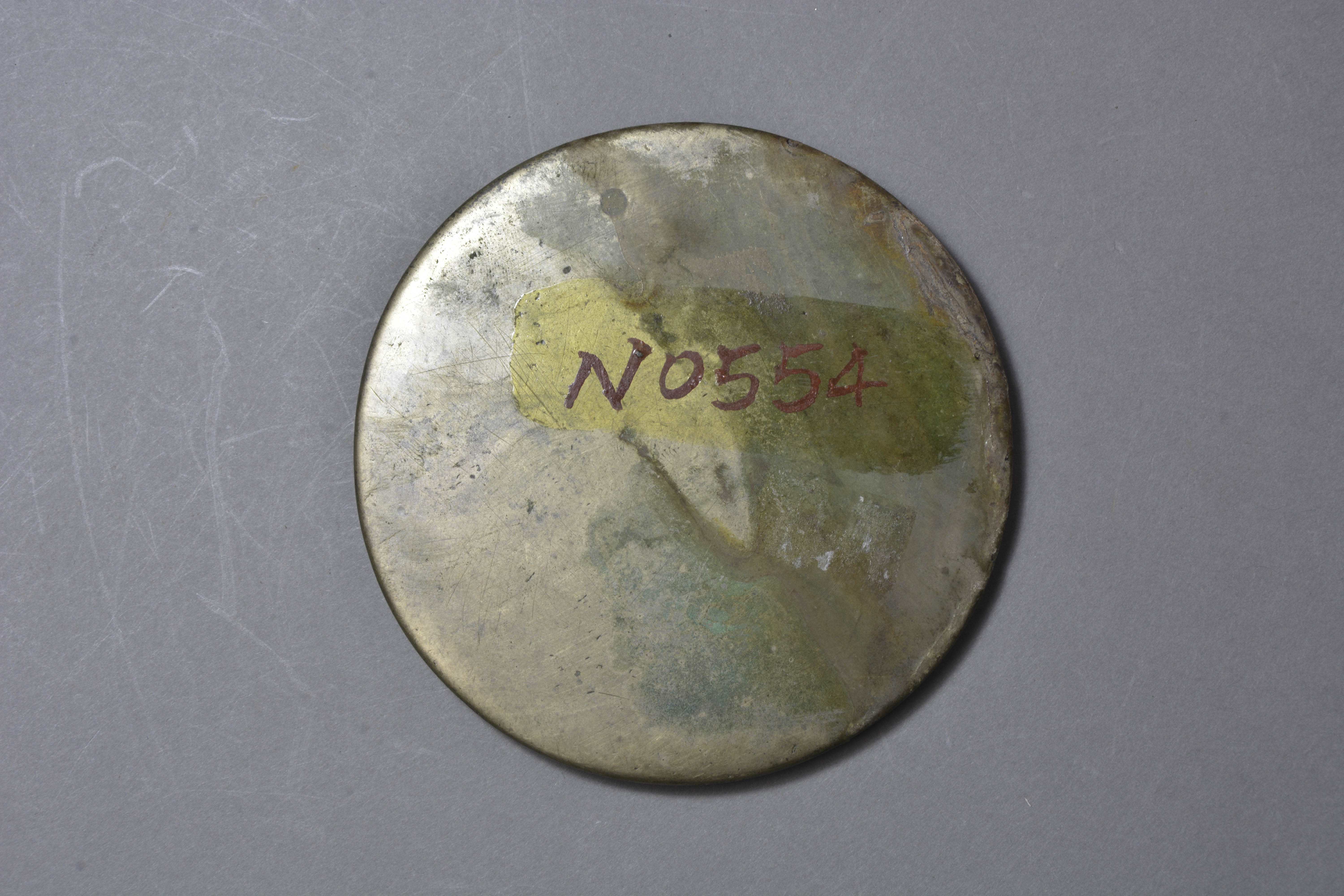 圆形,圆钮,圆钮座。座外以内向八连弧纹带,两周细弦纹间有铭文”内而清而以昭明光而象夬而日之月心而不 泄兮“,最外一周短斜线纹。素缘。面微凸。