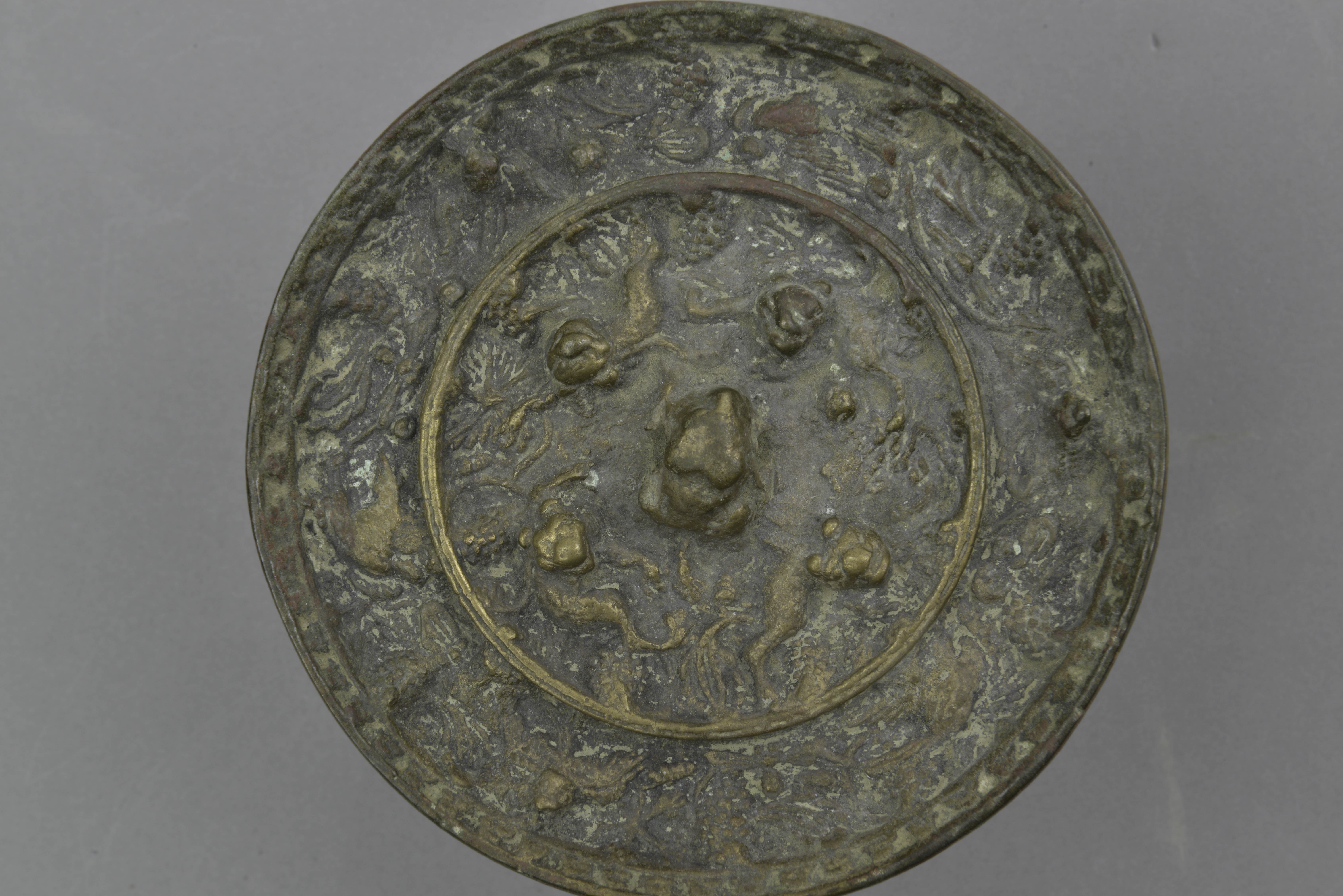 圆形,伏兽钮。一周凸棱纹将镜背分为两区。内区葡萄枝叶缠绕,四瑞兽或俯或仰,有的侧转身躯攀援旋绕于枝蔓丛中。外区葡萄串交错排列,不同形态的瑞兽禽鸟环绕其中。云花纹缘。