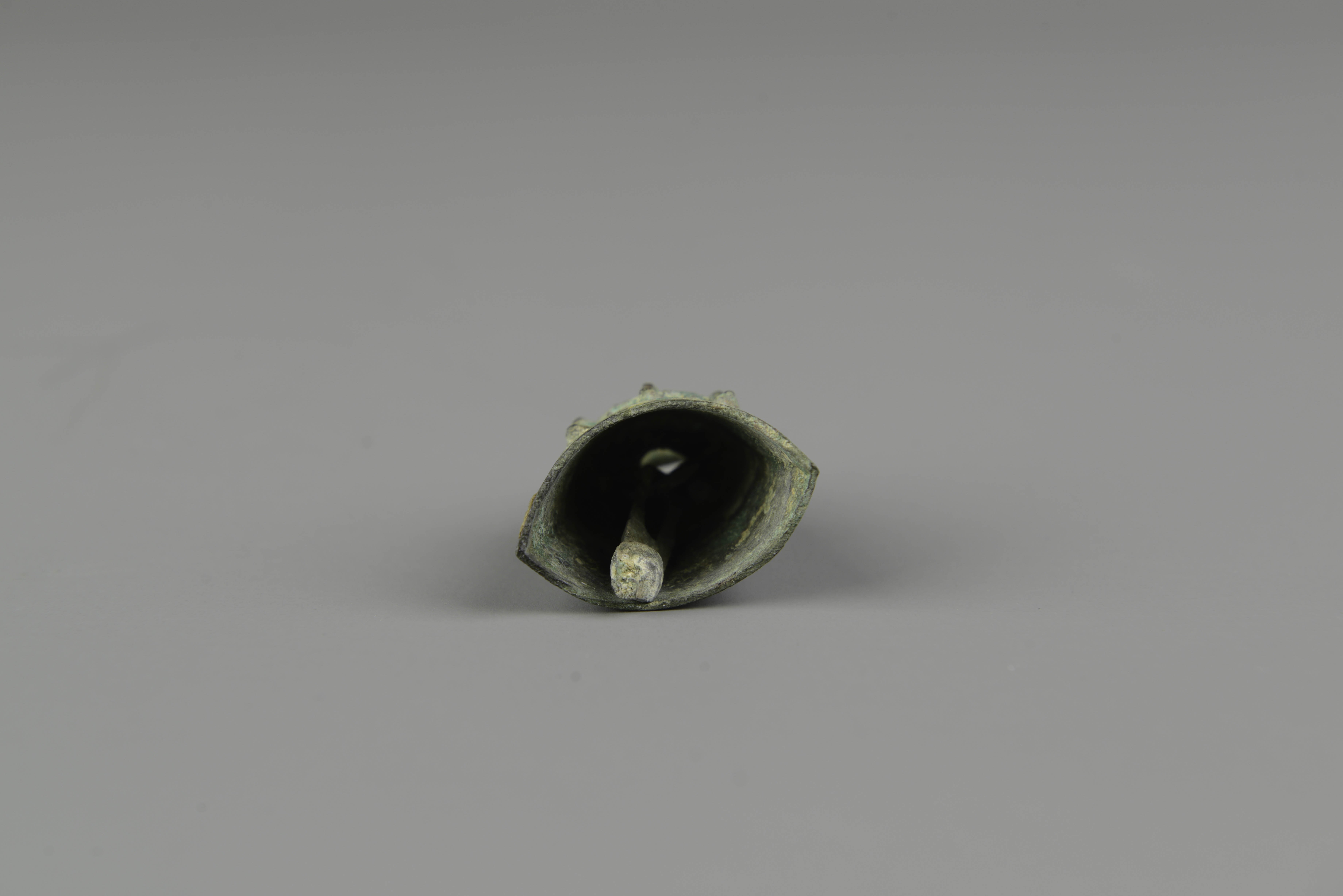 器壁特薄,形体矮小。截面为椭圆形,顶部有半环形钮,钮下有一小穿孔与腹部贯通,孔上衔接一铃舌,摇之即响。铃身正面、背面饰方格纹分割的乳钉纹。