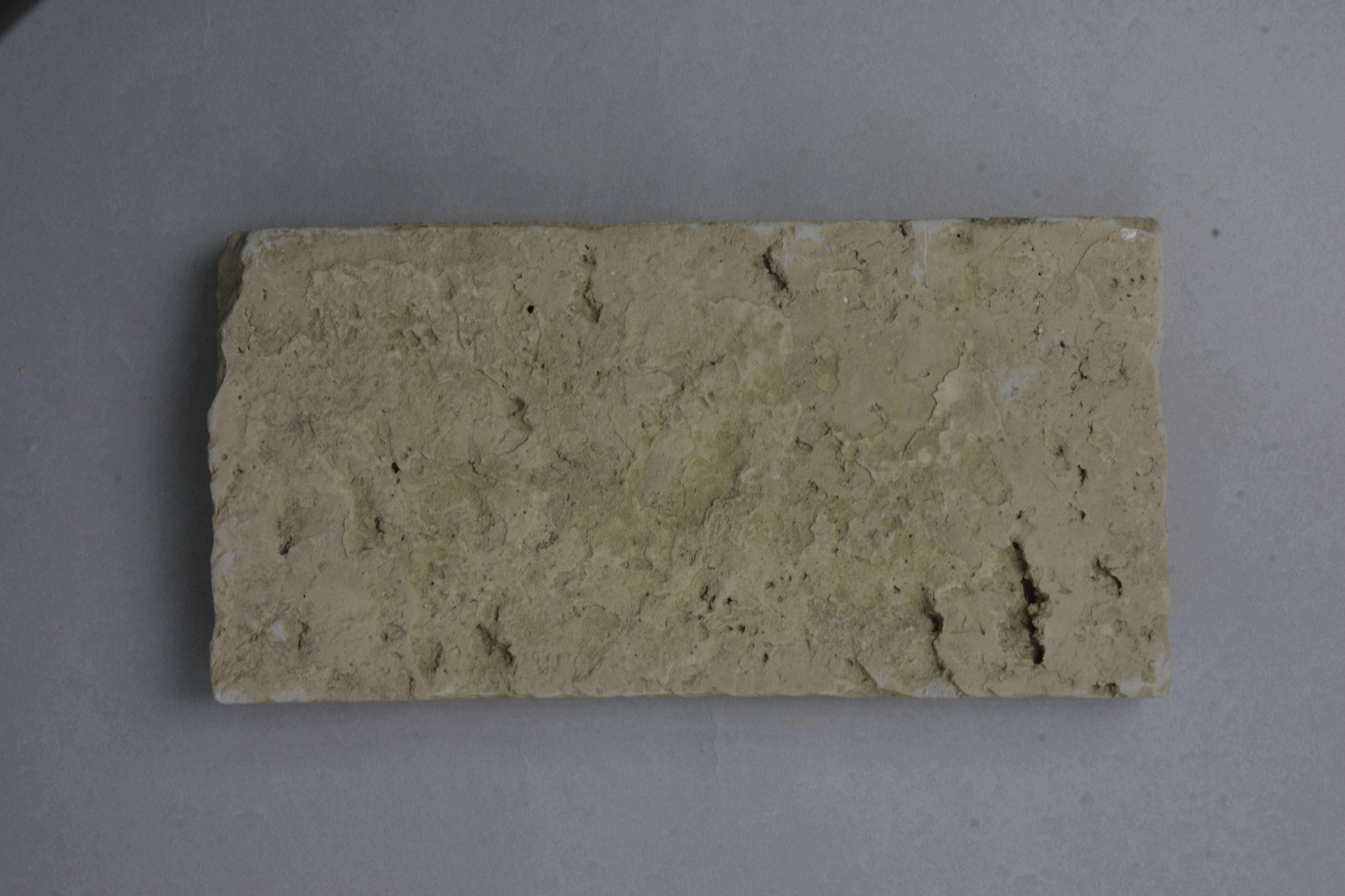 泥质陶。长方形,正面边框凸起,内浮雕一羊,卷角,短尾上翘,回首张望,作撒蹄奔跑状。背面素平。