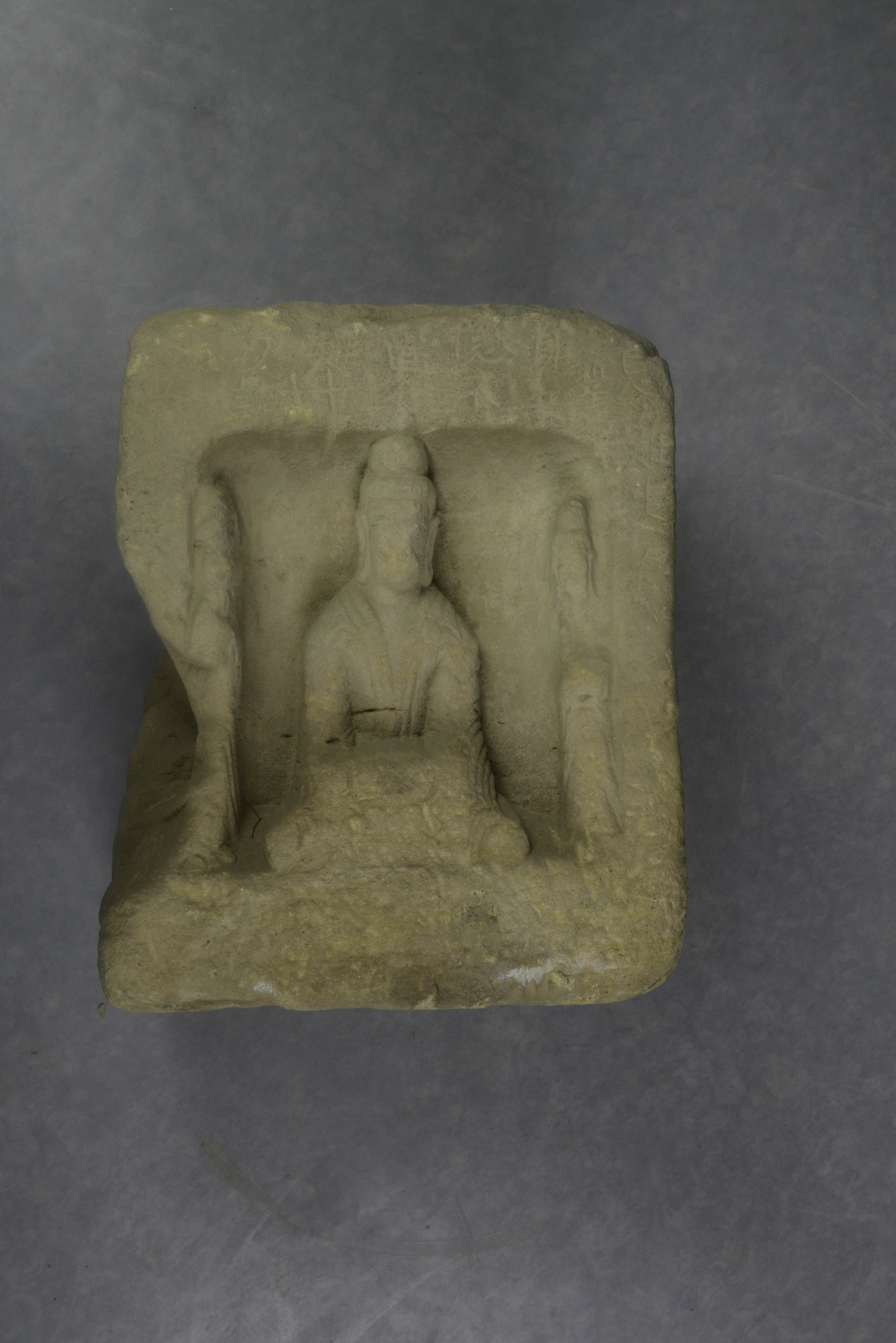 灰黄色砂岩质,塔身作上小下大四面柱状,顶部有圆形卯,四壁开方龛,均雕一坐佛二菩萨,佛高髻垂耳,眉眼细长,面相清癯,着通肩袈裟,衣褶细密,衣摆下掩,结跏趺坐,正面佛施与愿印,有四足床座,余均作禅定印,龛周有“延昌三年(514年)”刻记,风化严重,多漫漶不清。