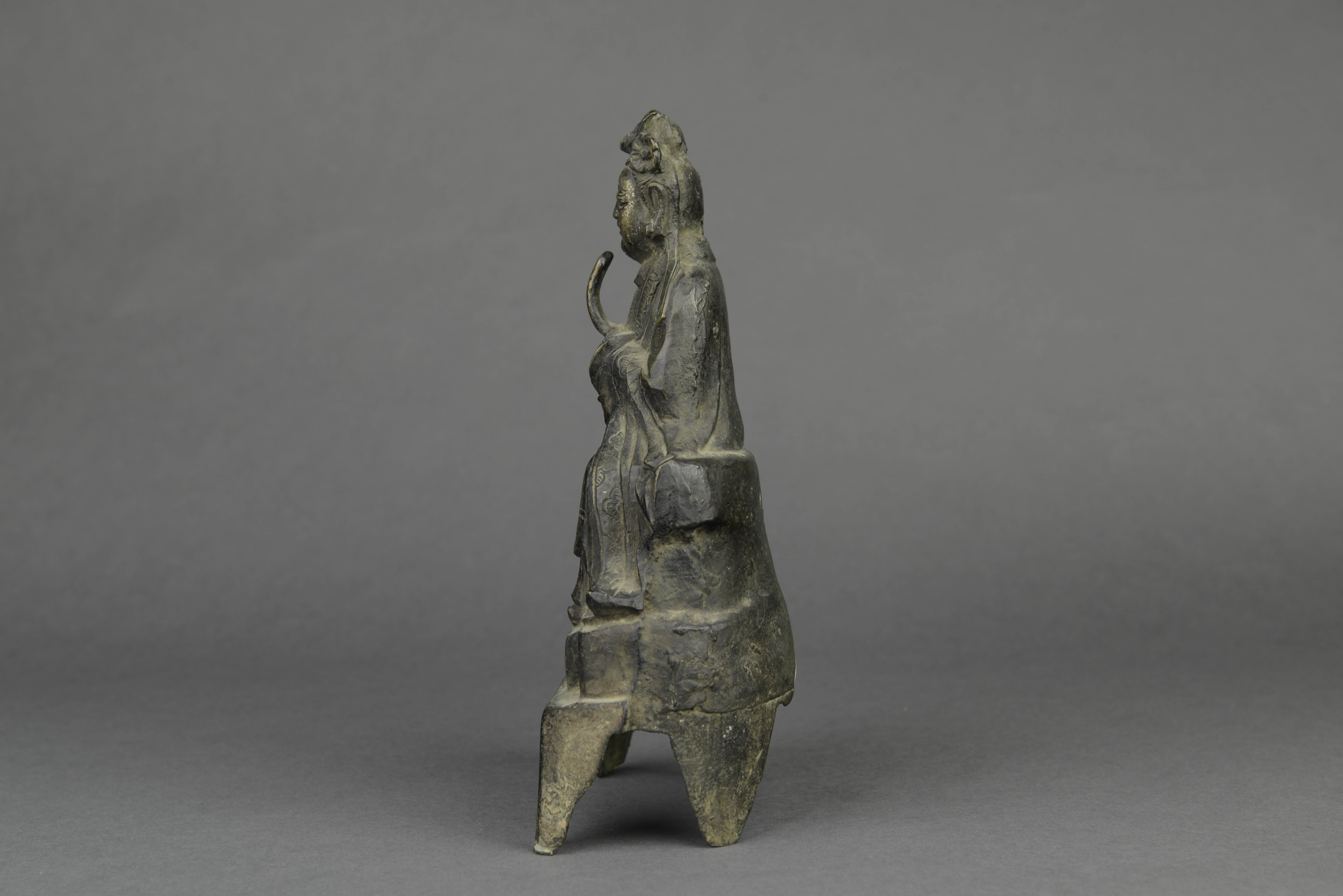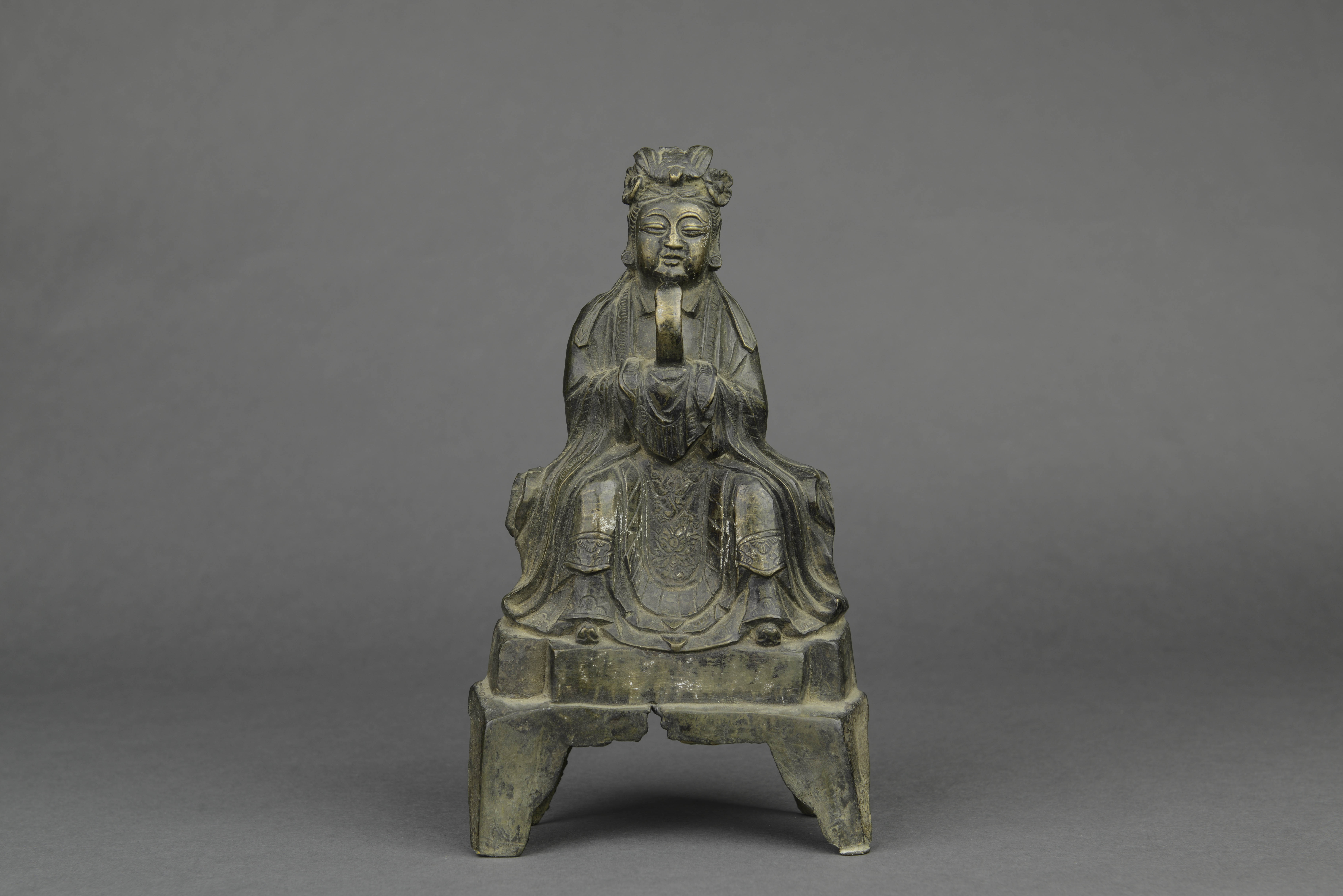 头戴花冠,面相浑圆,细眉长眼。身着通肩宽袖长袍,双手执笏于胸前,坐于四足椅之上。