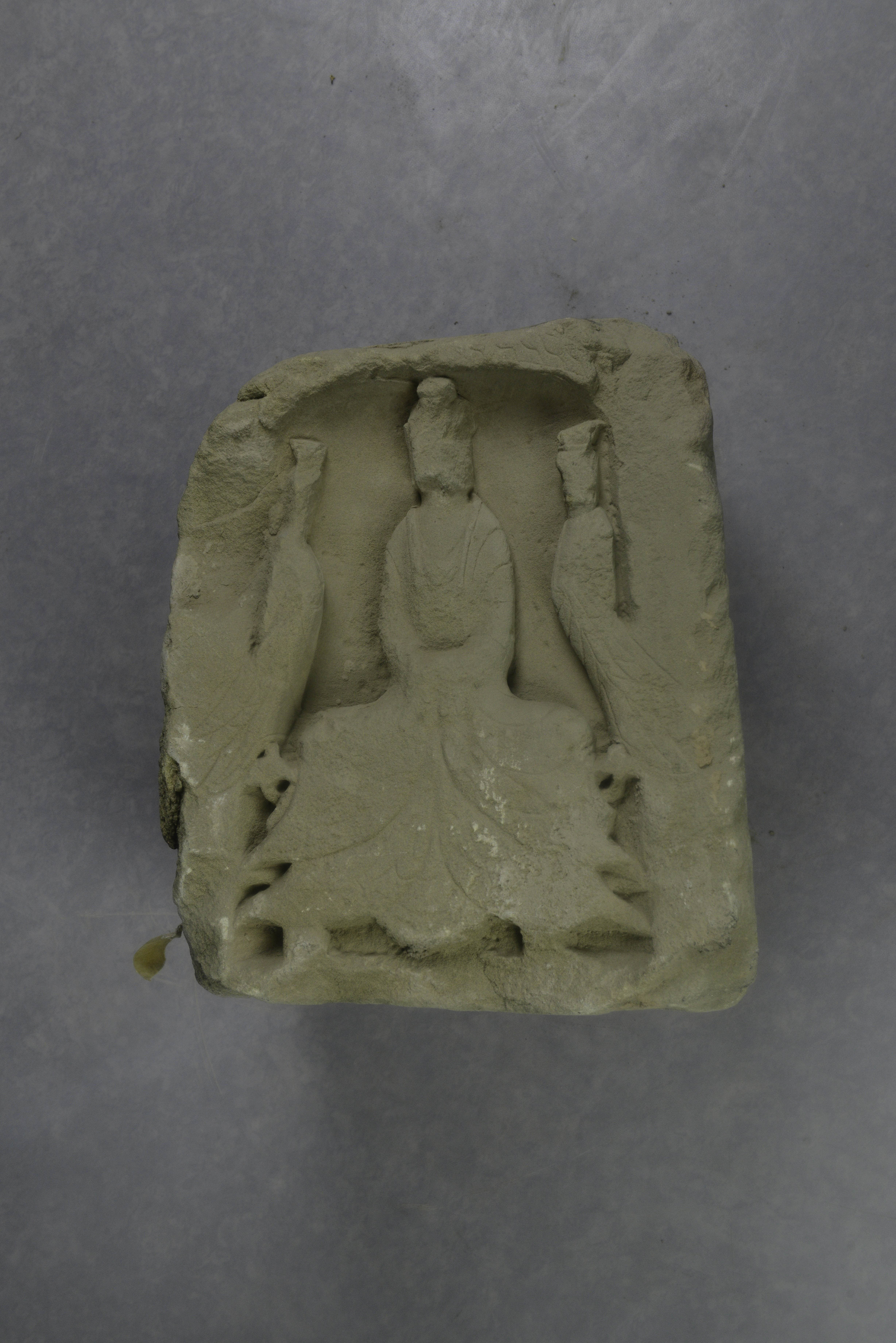 灰黄色砂岩质。塔身作四面柱状,四壁开拱顶龛,两龛雕一佛二菩萨。另两龛胁侍较残,似为一佛二弟子。佛均作结跏趺坐,面相方圆,眉眼细长。两耳大垂,着通肩袈裟,衣摆下掩,三尊施与愿印,一尊施禅定印;胁侍面向主尊侧身而立,着三角形披帛和长裙,裙带飘垂于体侧,身肢修长。龛楣阴刻火焰纹。