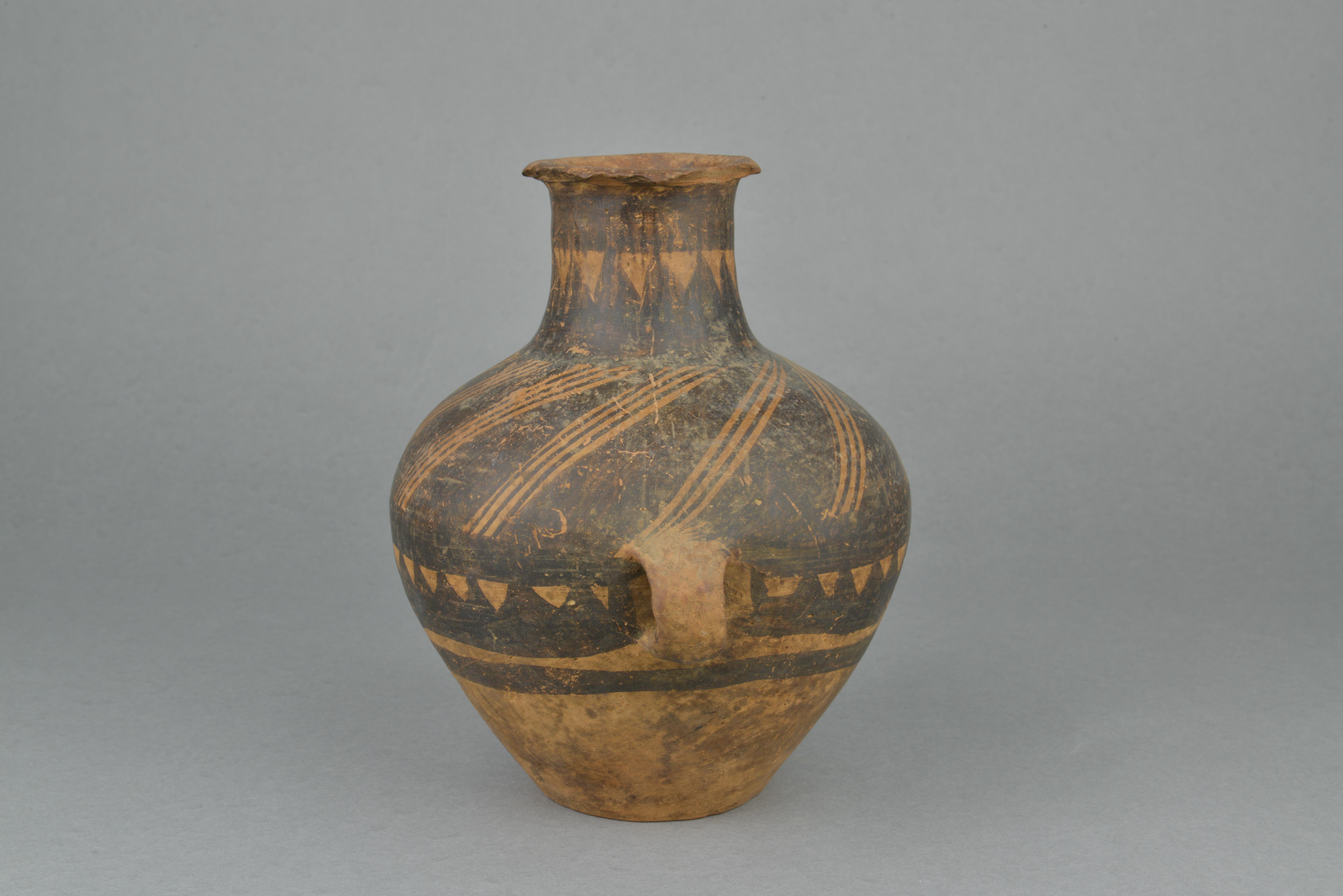 泥质红陶。口微侈,卷沿,直颈,丰肩,鼓腹下收,腹部作对称双耳,平底。口沿下至腹中部施黑彩,作留白倒三角形锯齿纹和斜直线纹。
