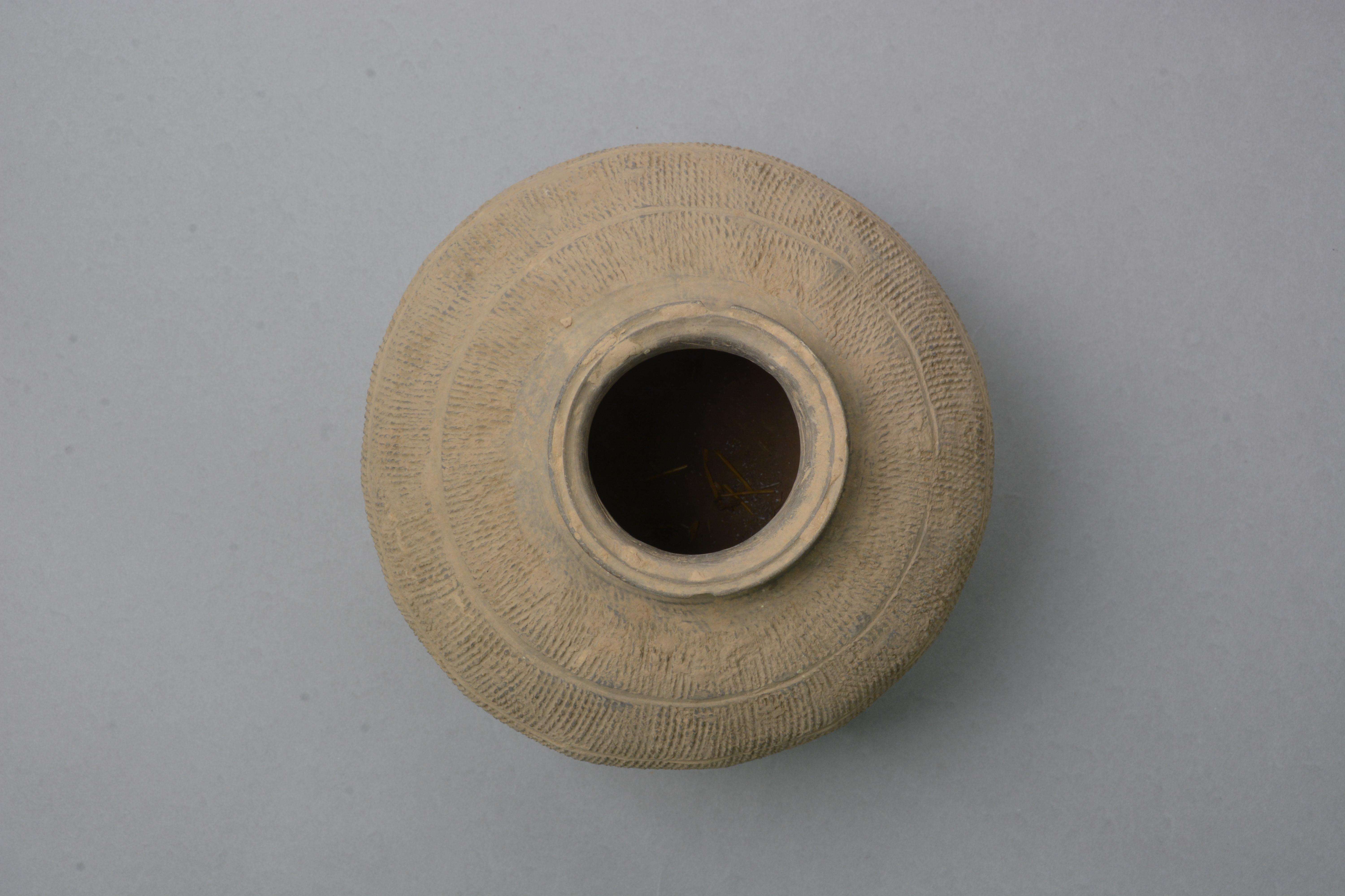 泥质灰陶。敞口,折沿,短颈,圆肩,斜腹,平底。肩部饰间断绳纹。