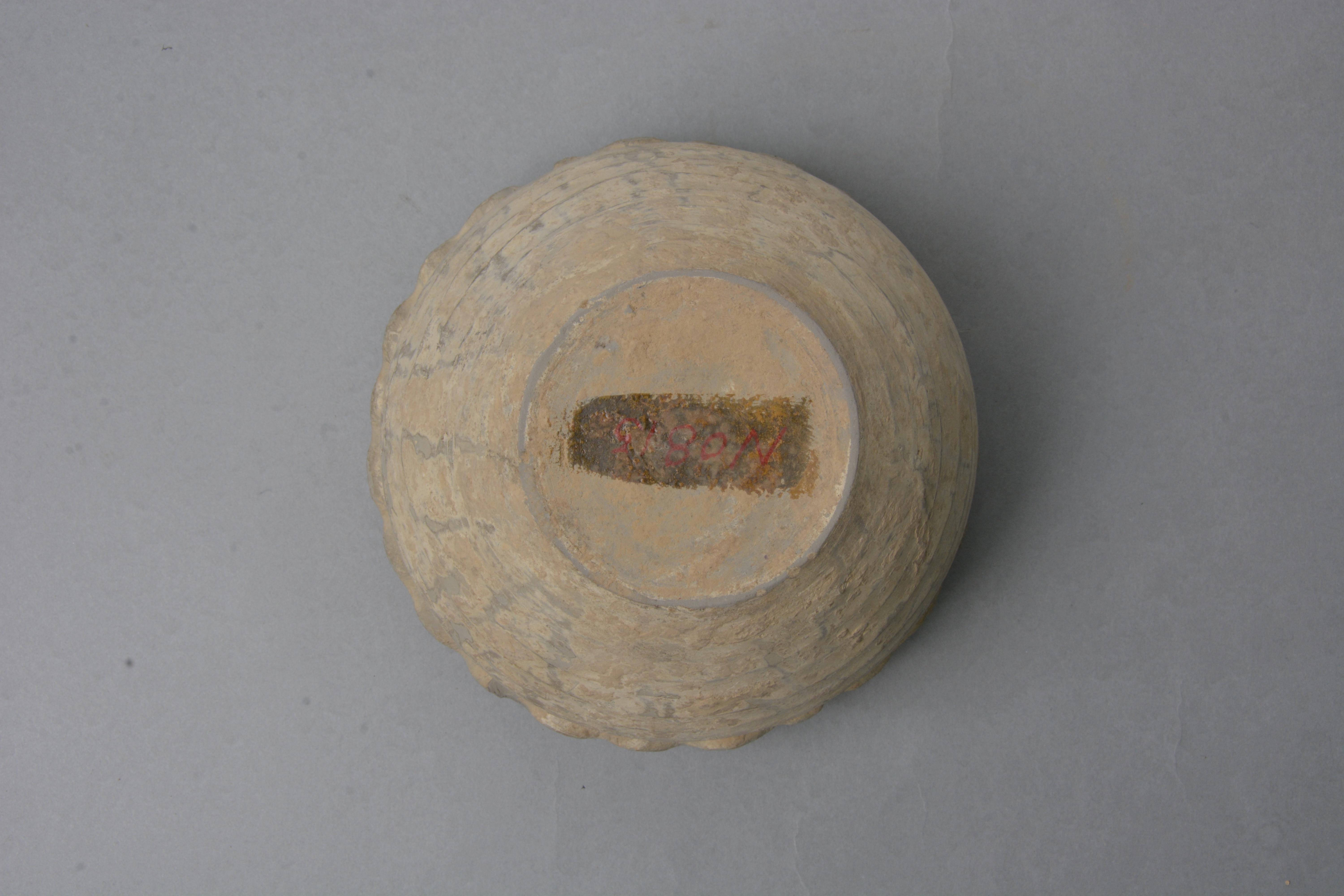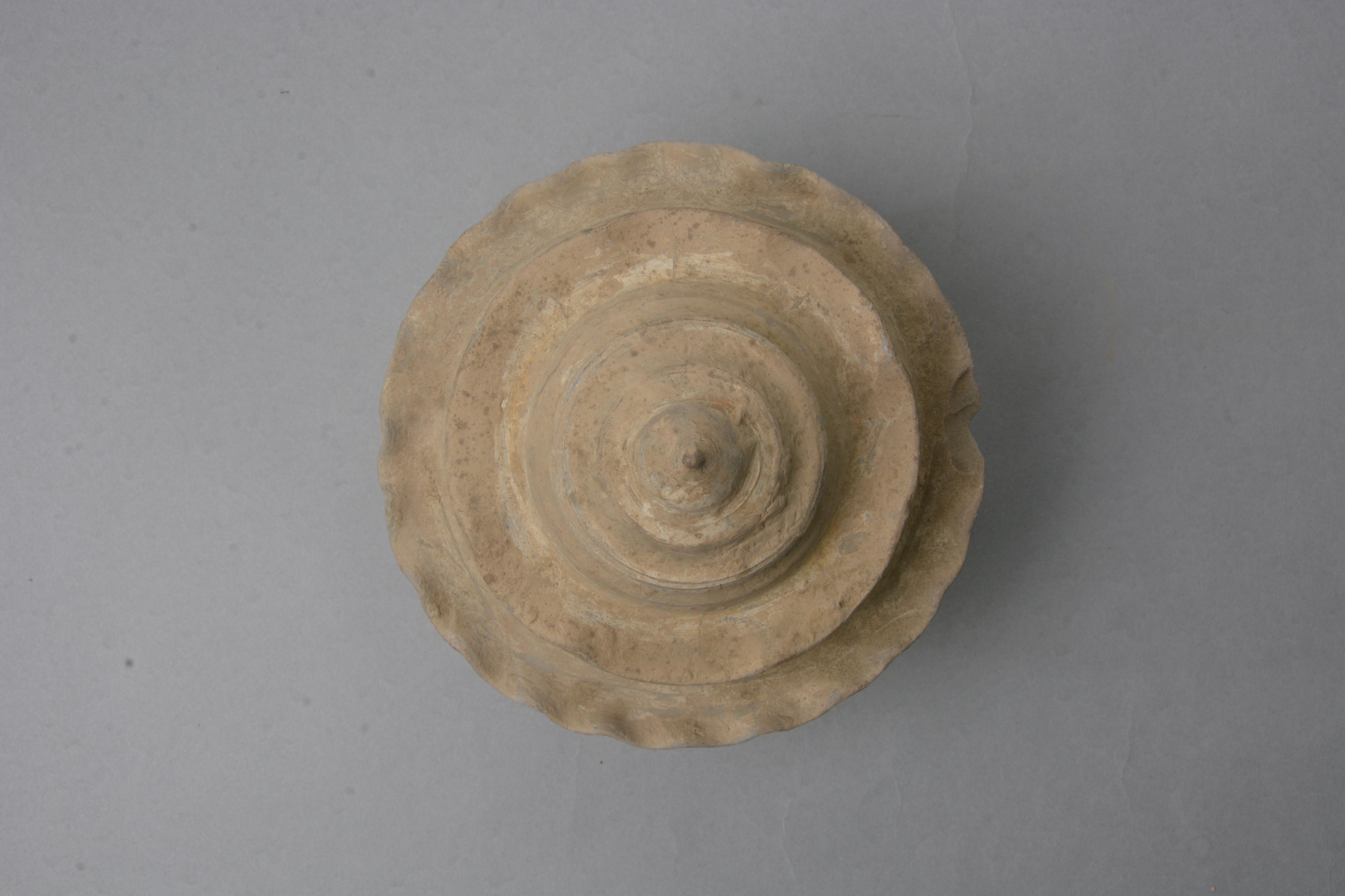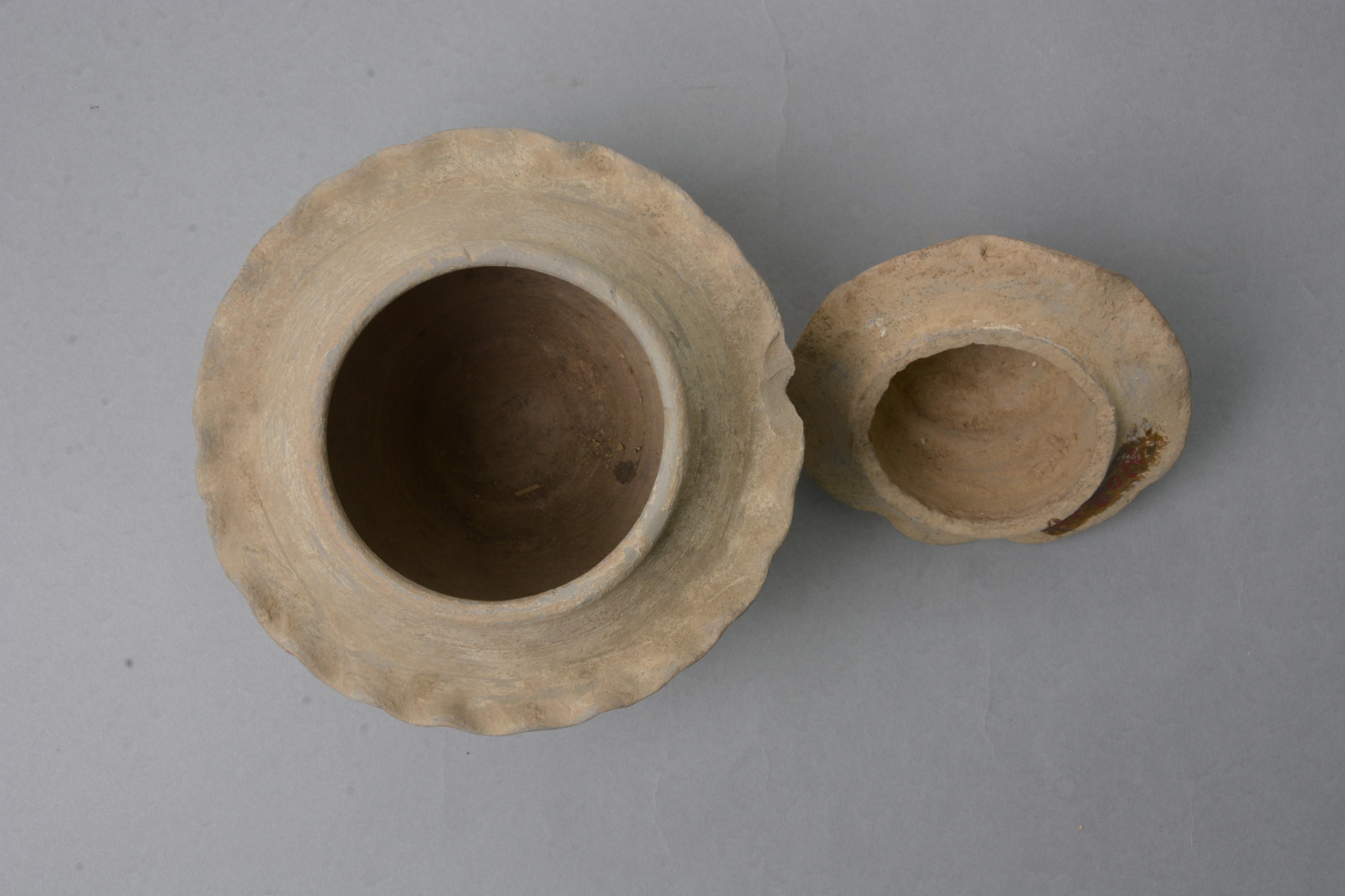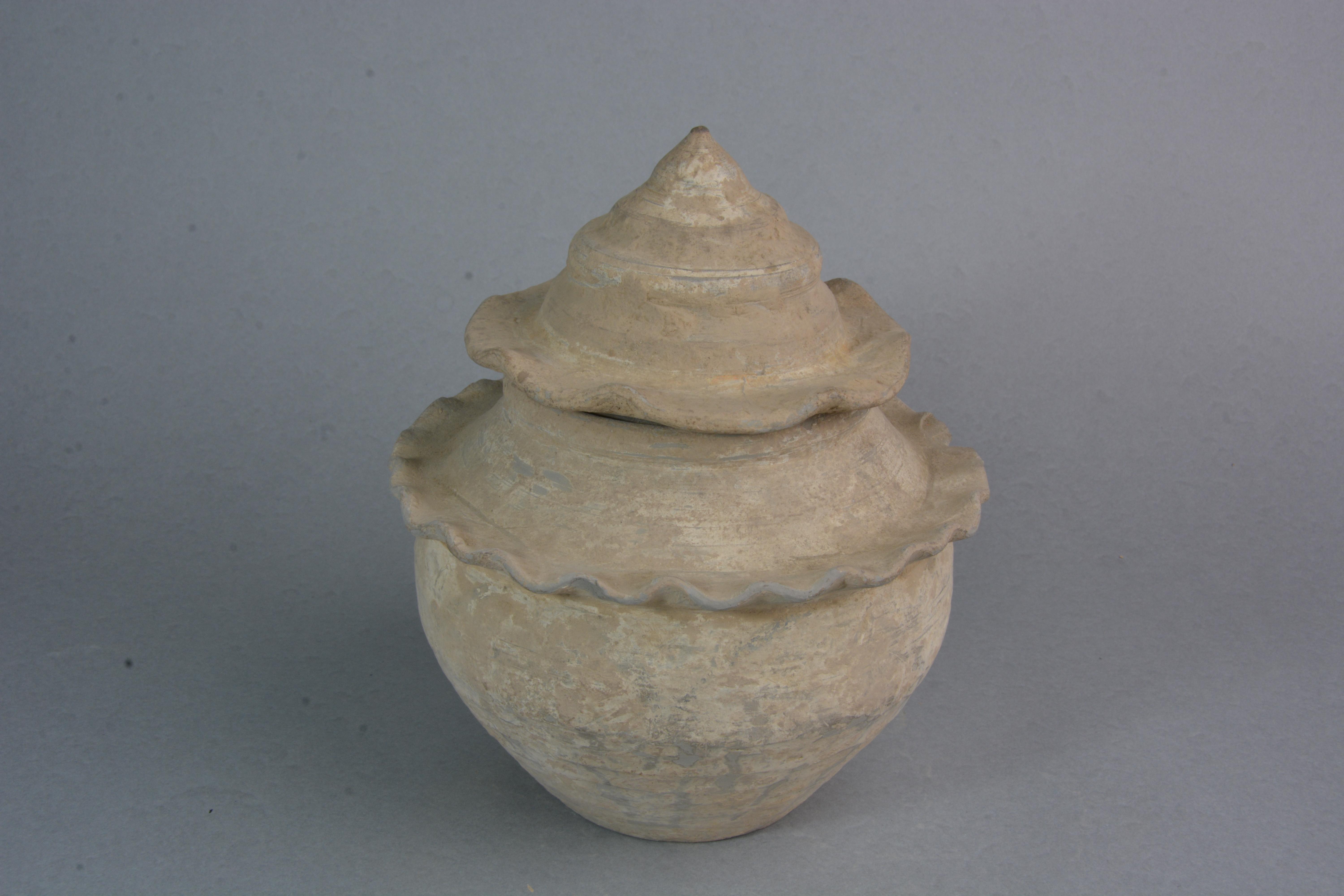 泥质灰陶。存盖、罐两件,螺壳形塔式罐,荷叶形沿,子母口,罐为圆唇,鼓腹,平底,腹部加一道堆塑花边。通体罩白陶衣。