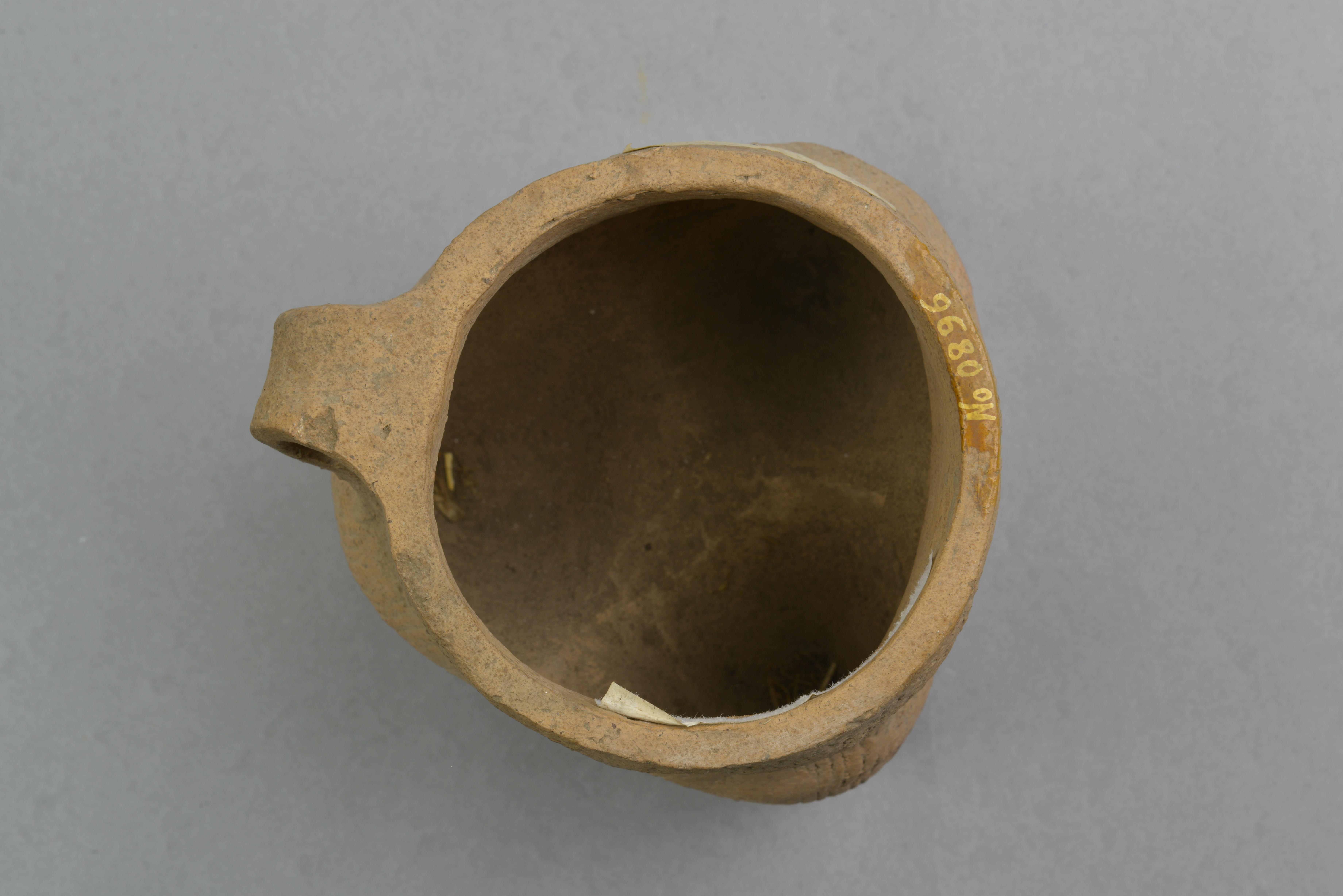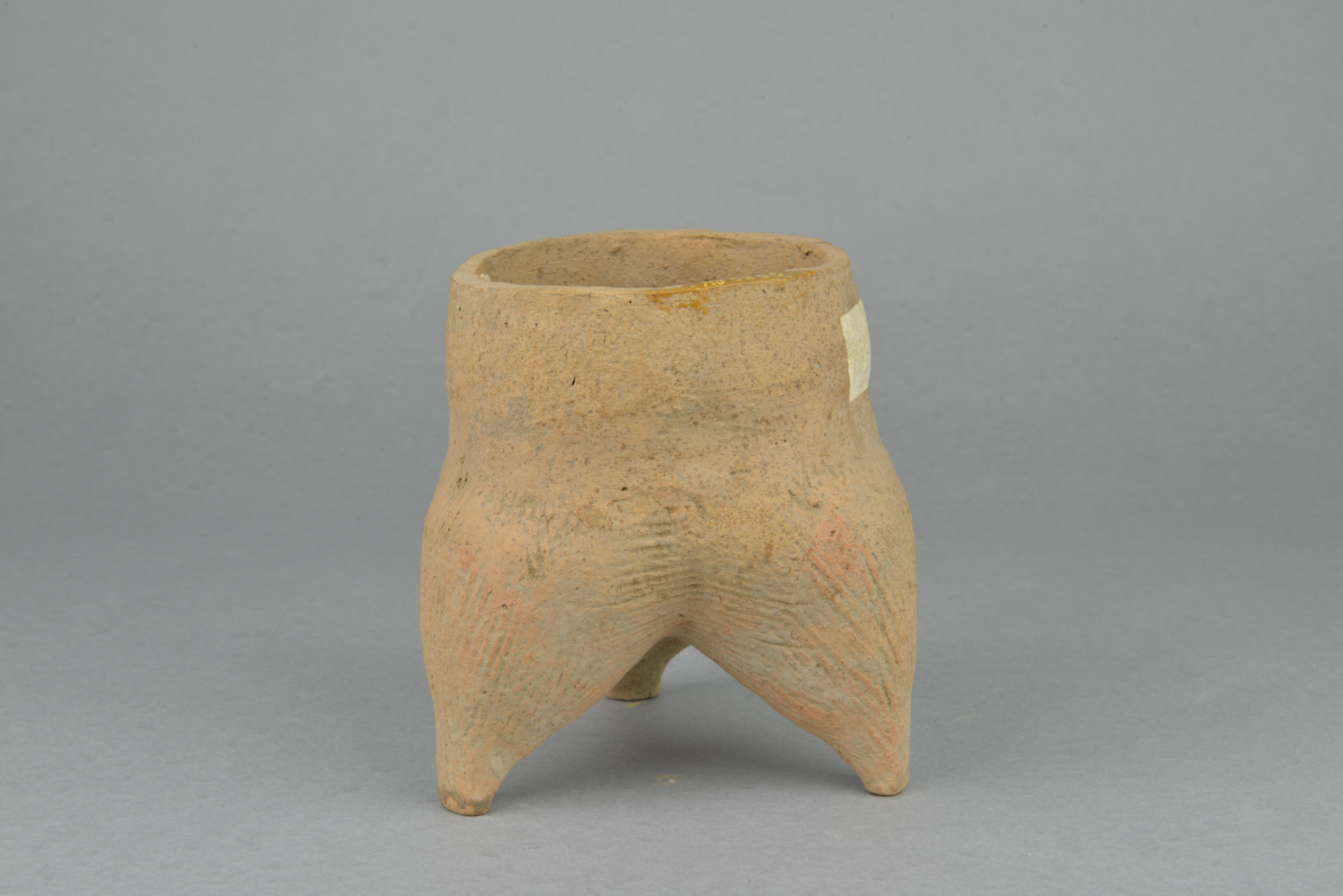 夹砂红陶,直口,方唇,直颈,三袋足,分裆。颈部作一宽带耳,颈以下饰绳纹。