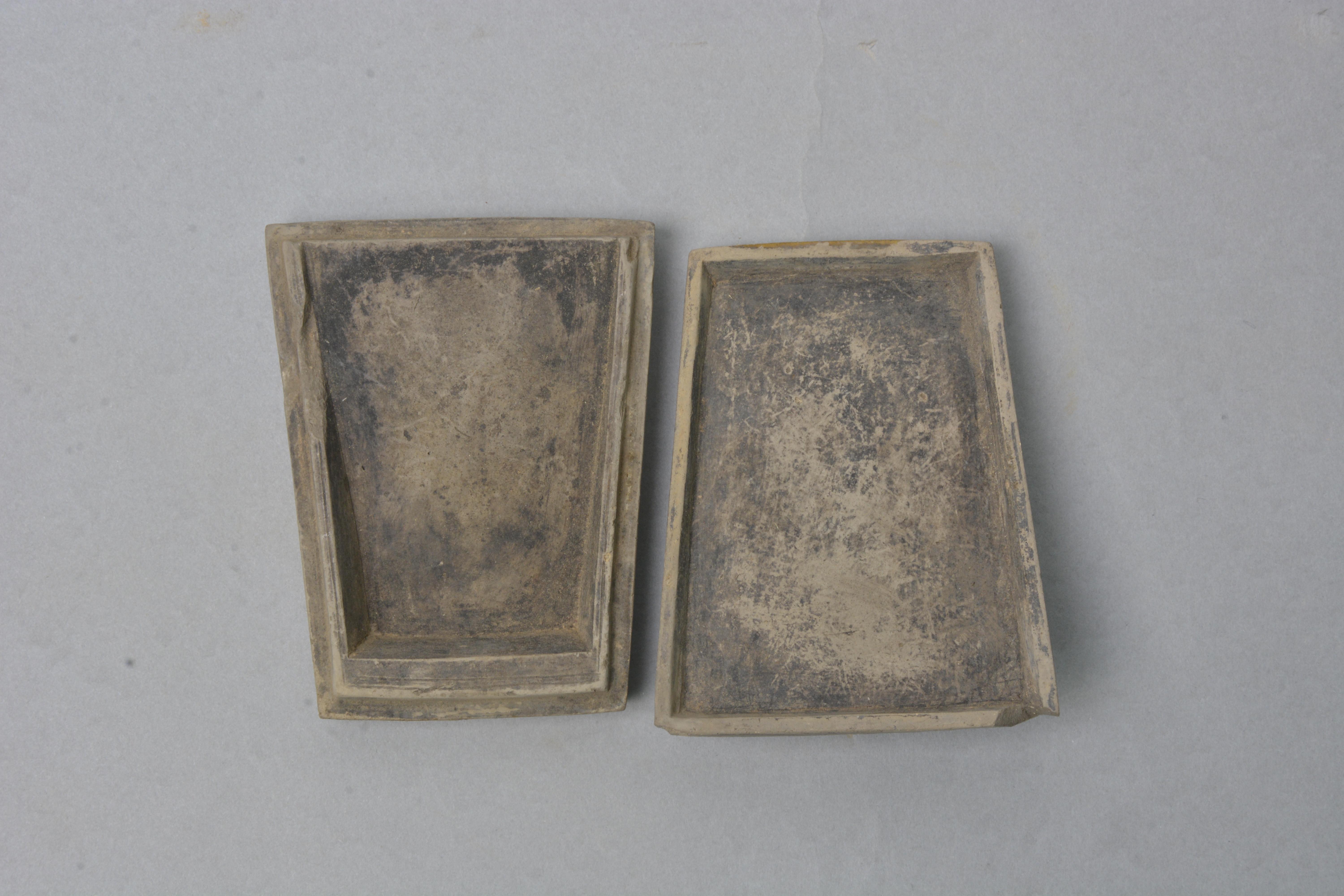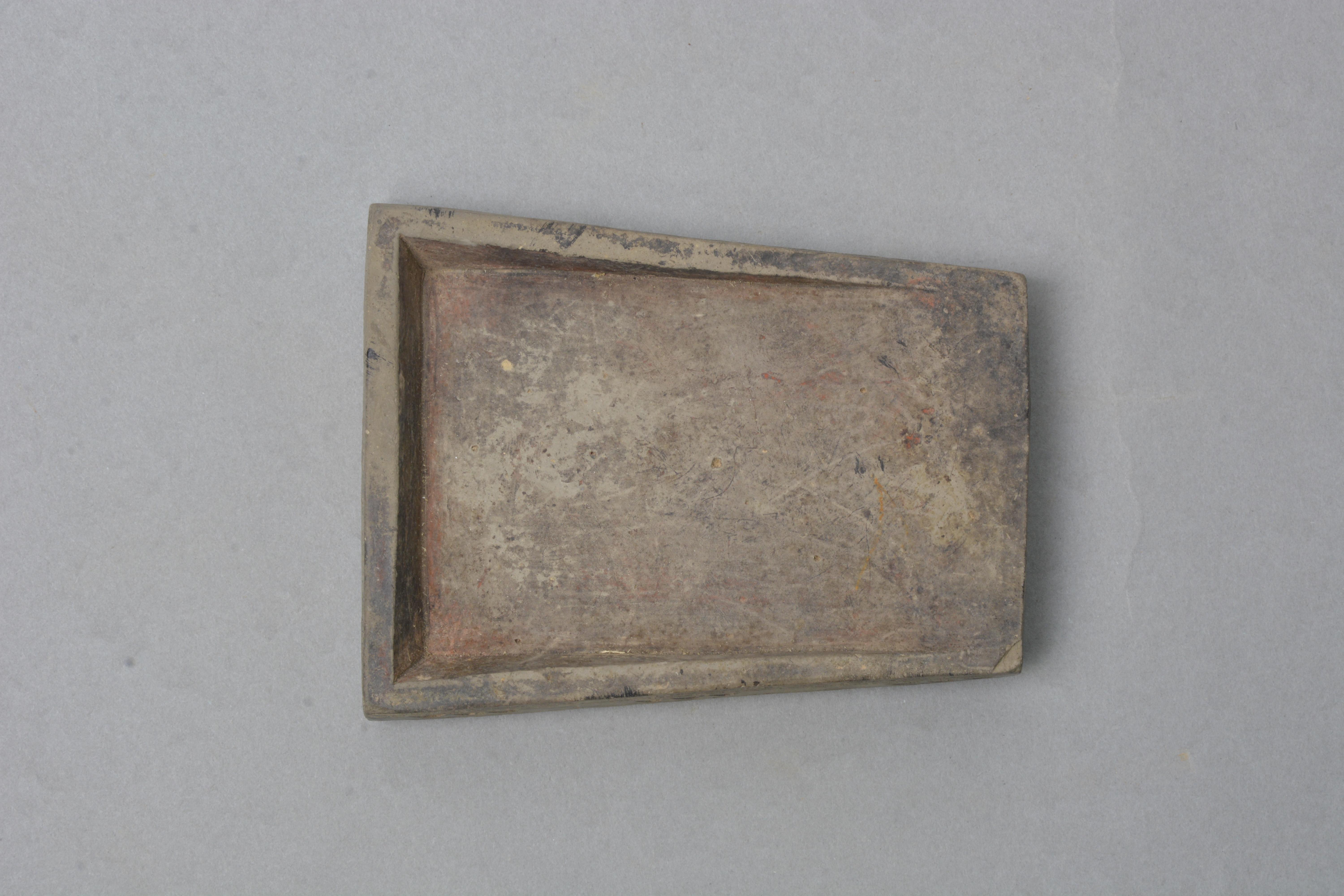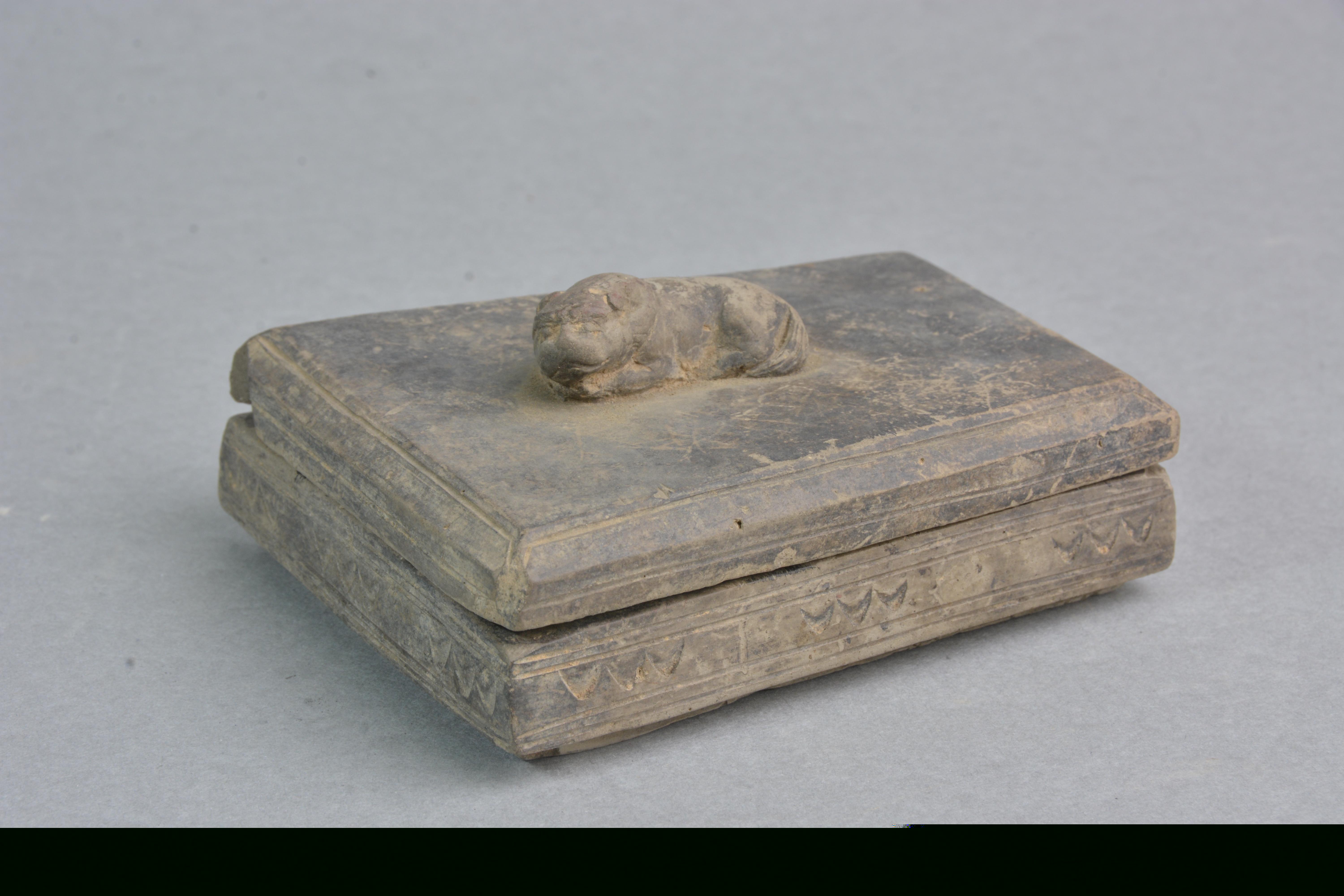 泥质灰陶,砚体平面呈等腰梯形,盖顶端有兽钮,子母口,箕形墨池。盖四刹,刻弦纹,墨池四周剔刻指甲纹。