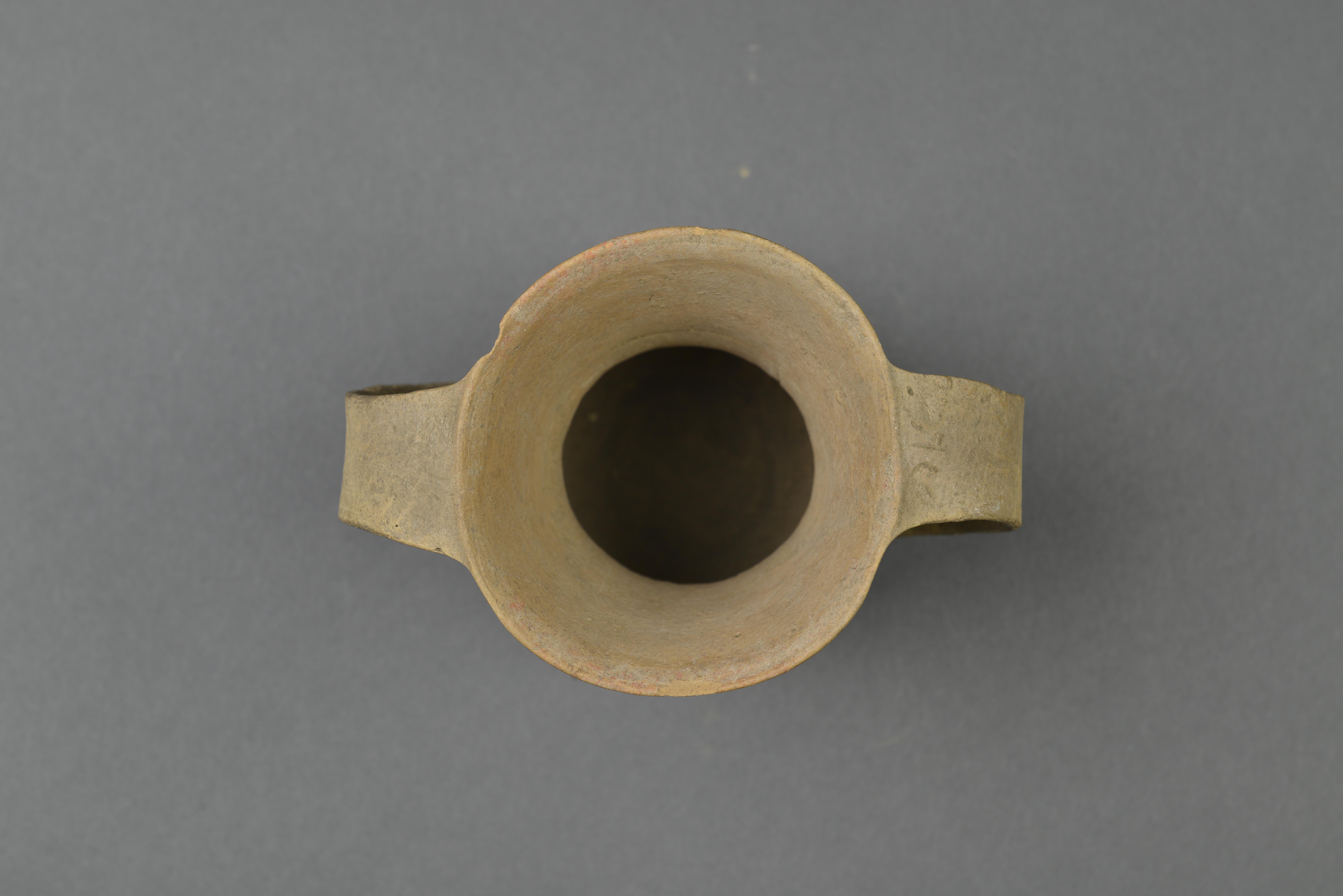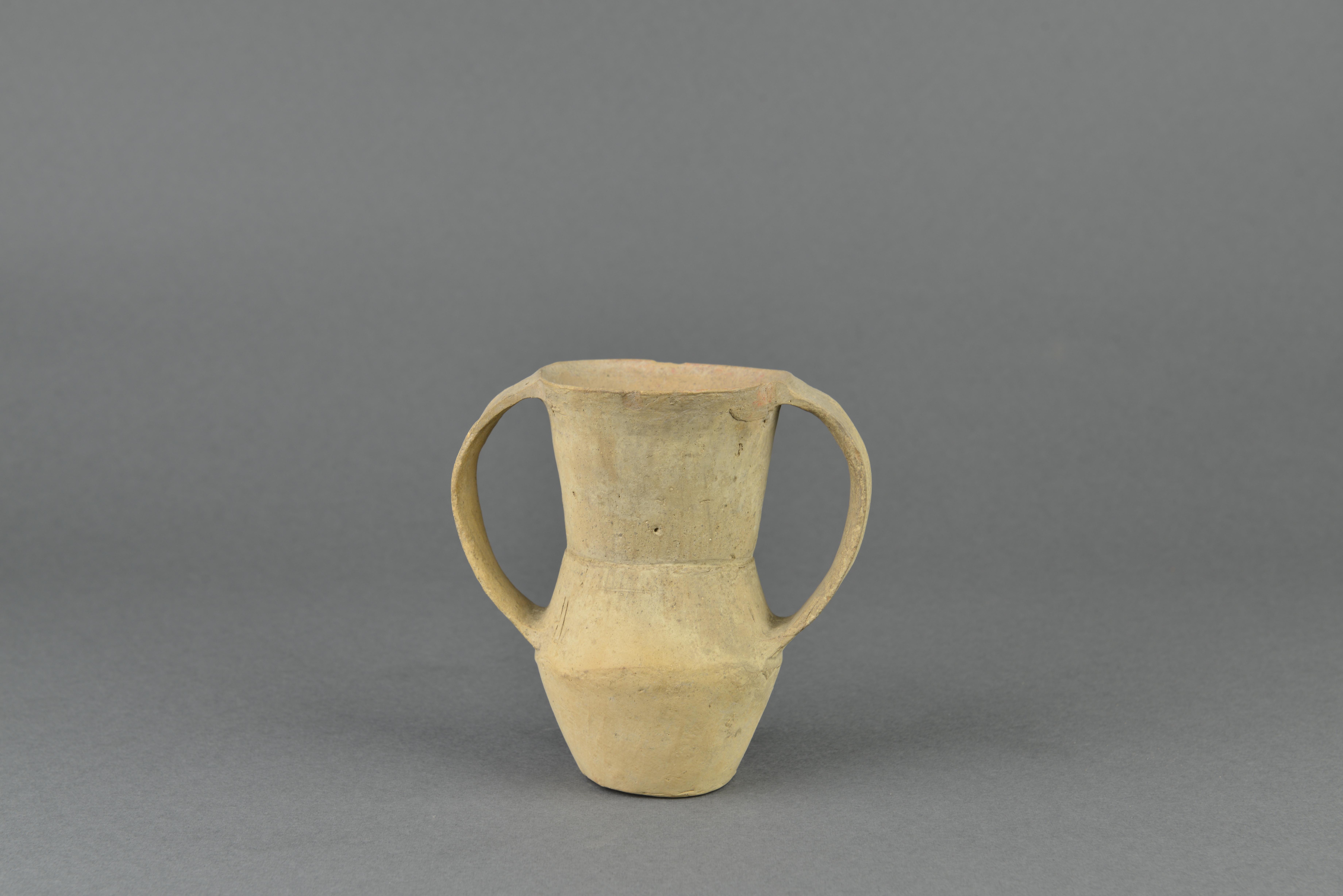 泥质红陶。敞口,高领,折肩,斜腹,平底。口至肩部置对称的宽带耳。