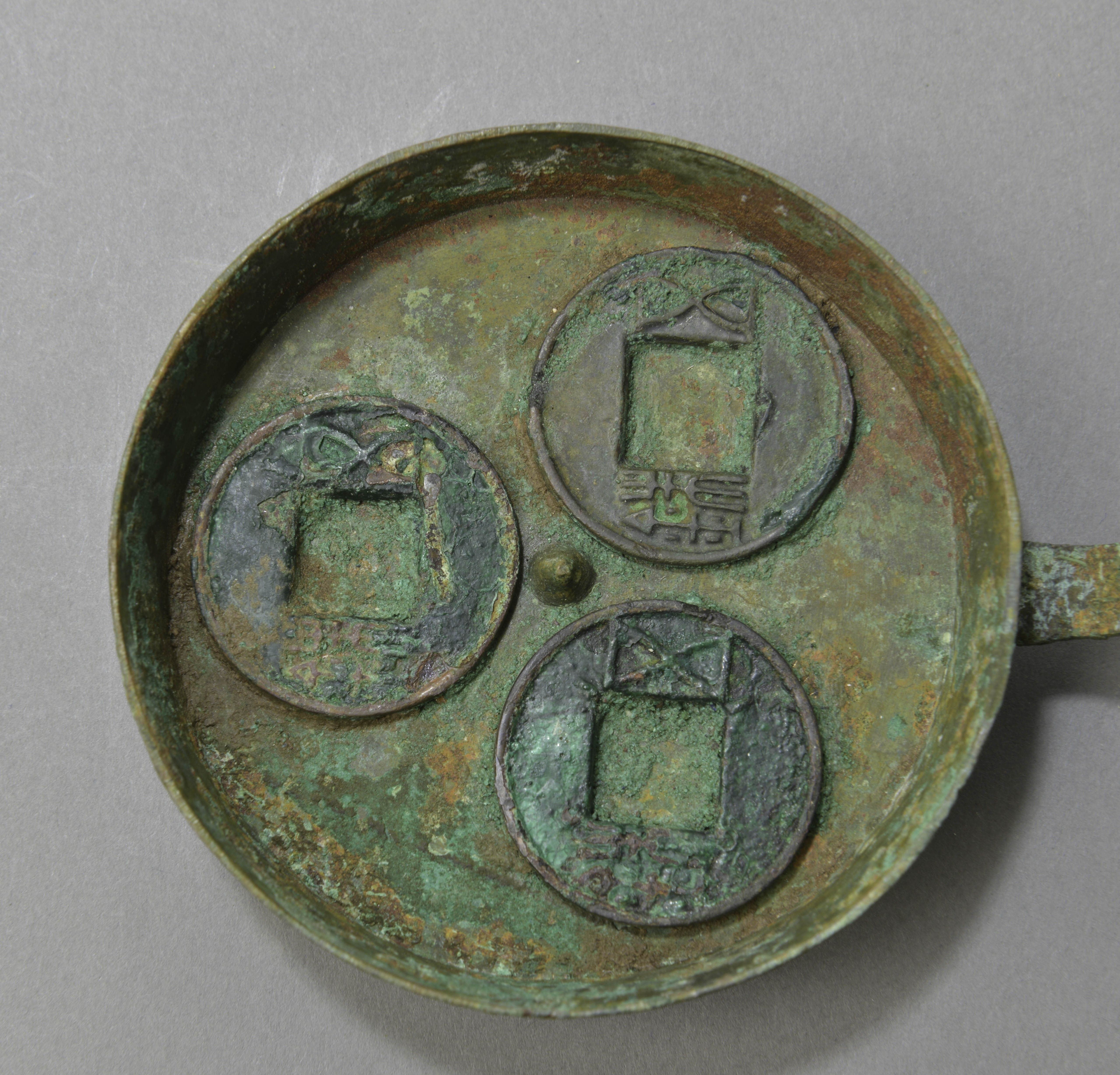 直筒形圆盏,中心有小锥柱,盏内粘有三枚