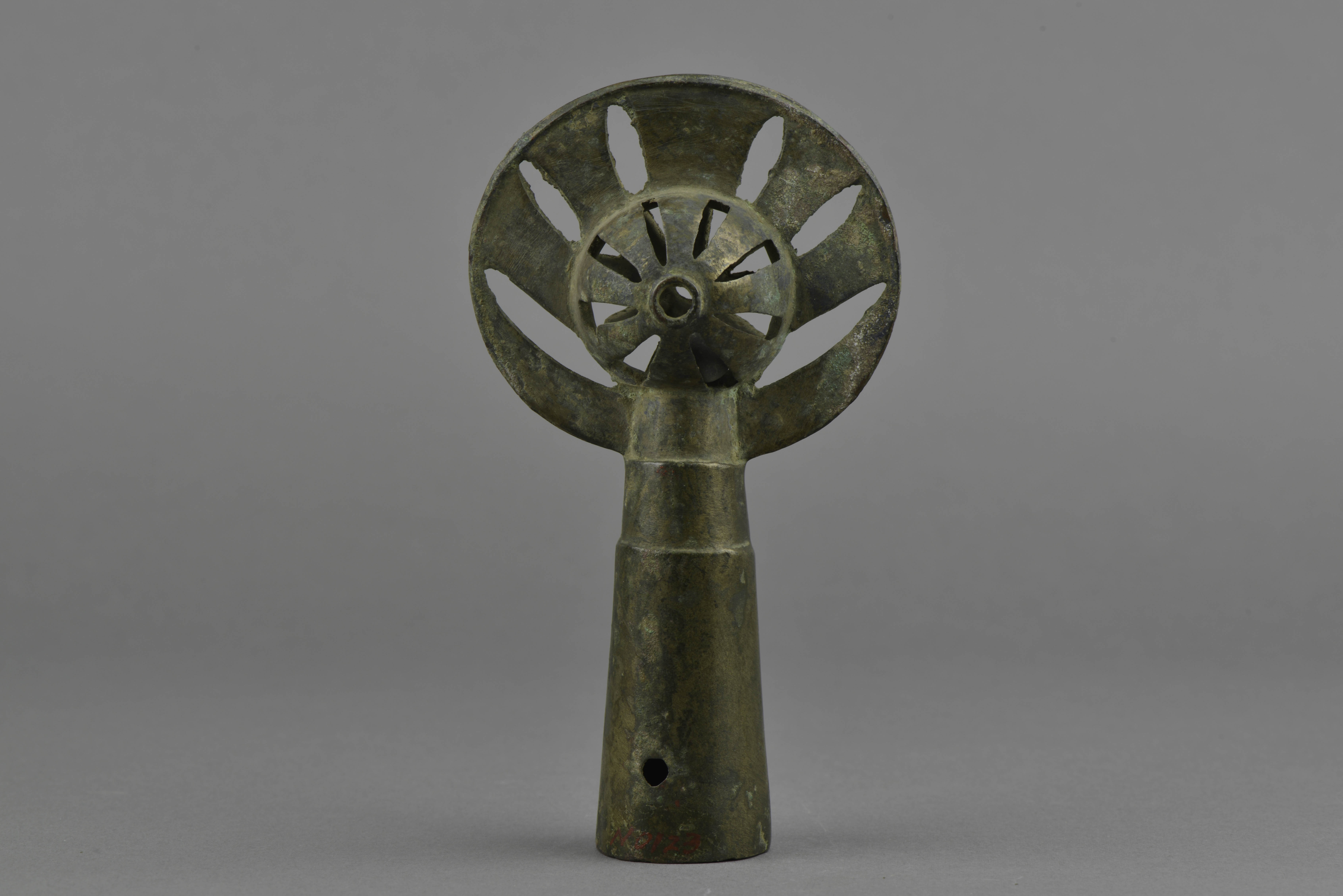 管状形銎座,宽扁形铃体,内含铜丸。銎座正、背两面有对应圆孔,铃部两面正中各有一圆孔及三角形辐射状镂空。