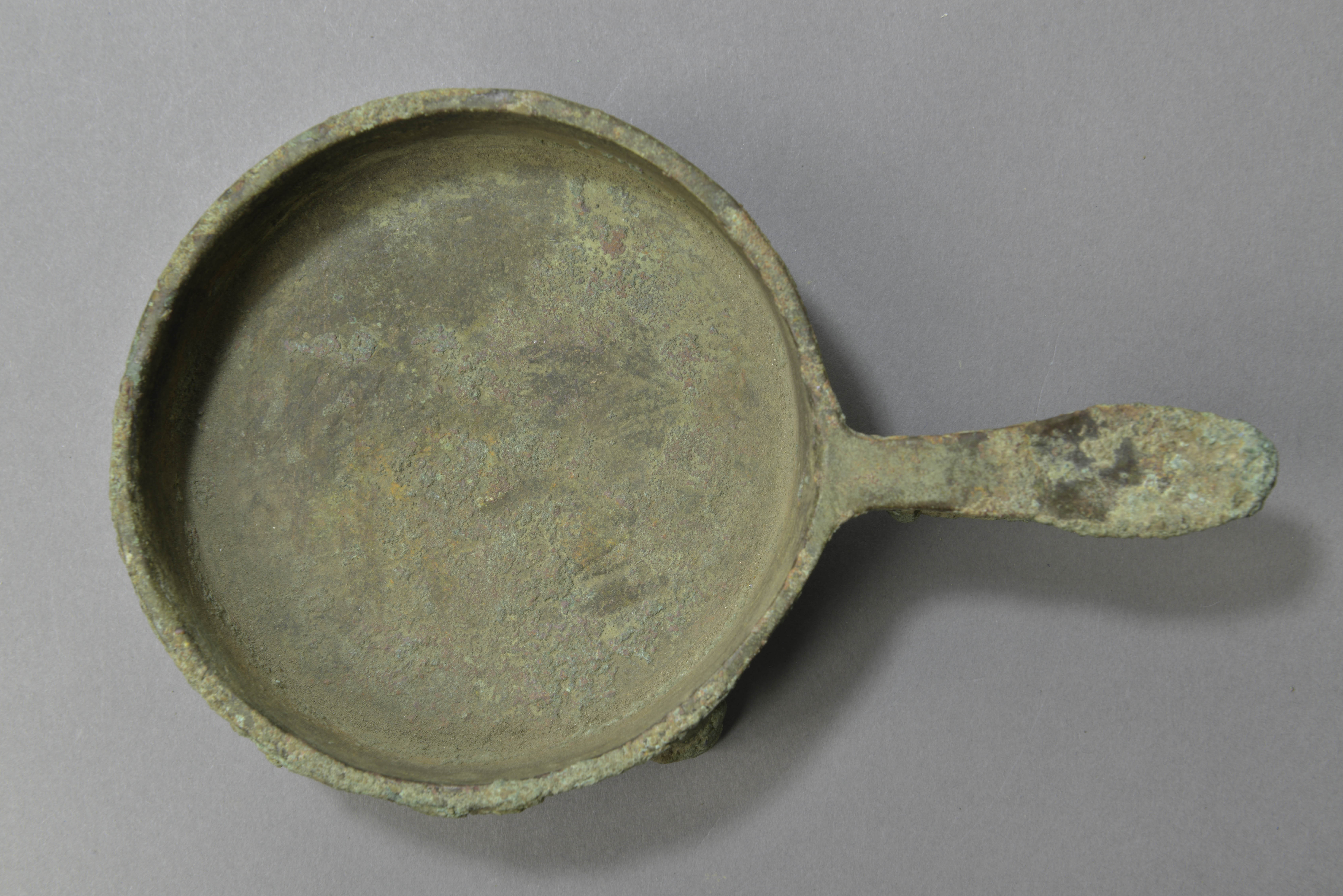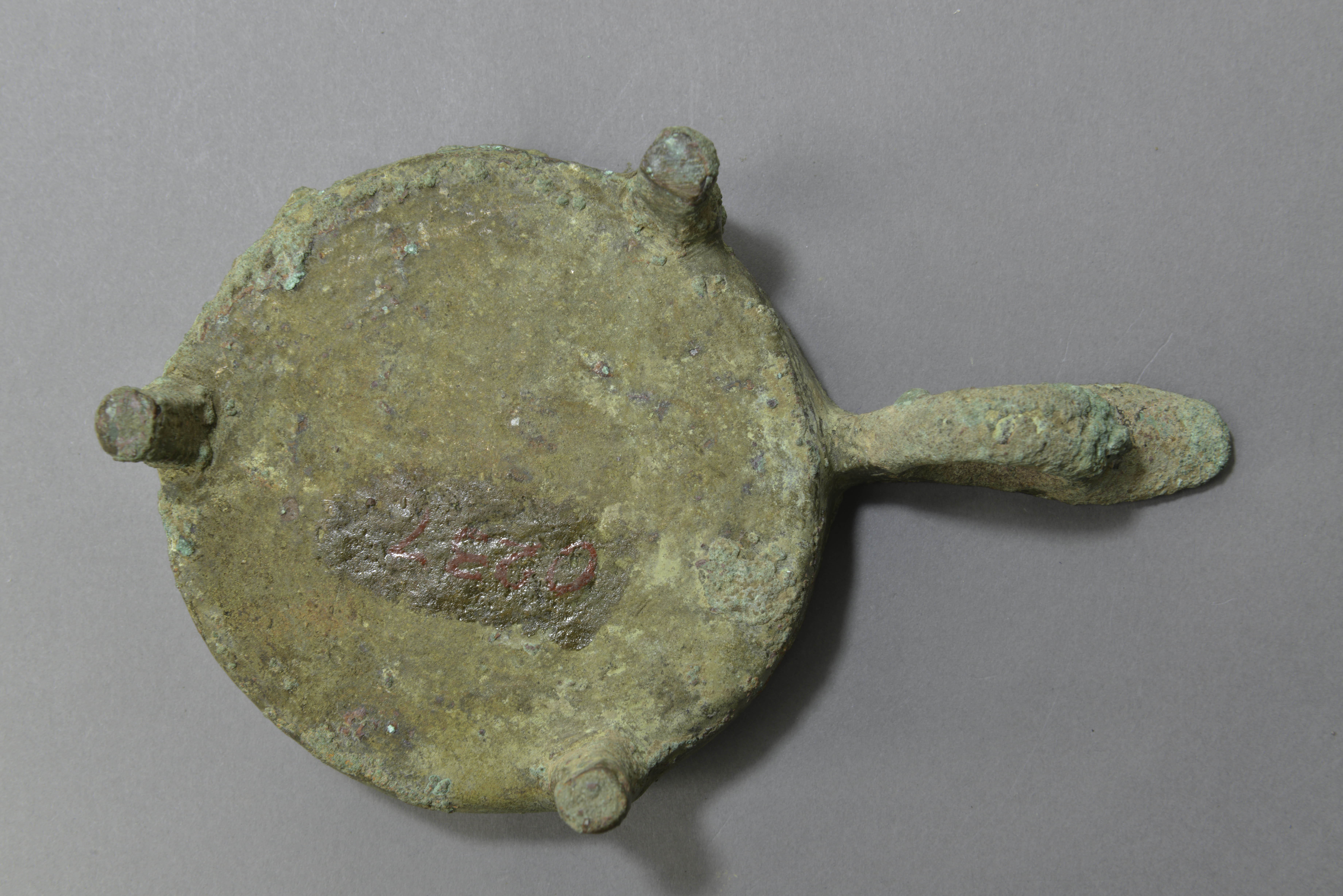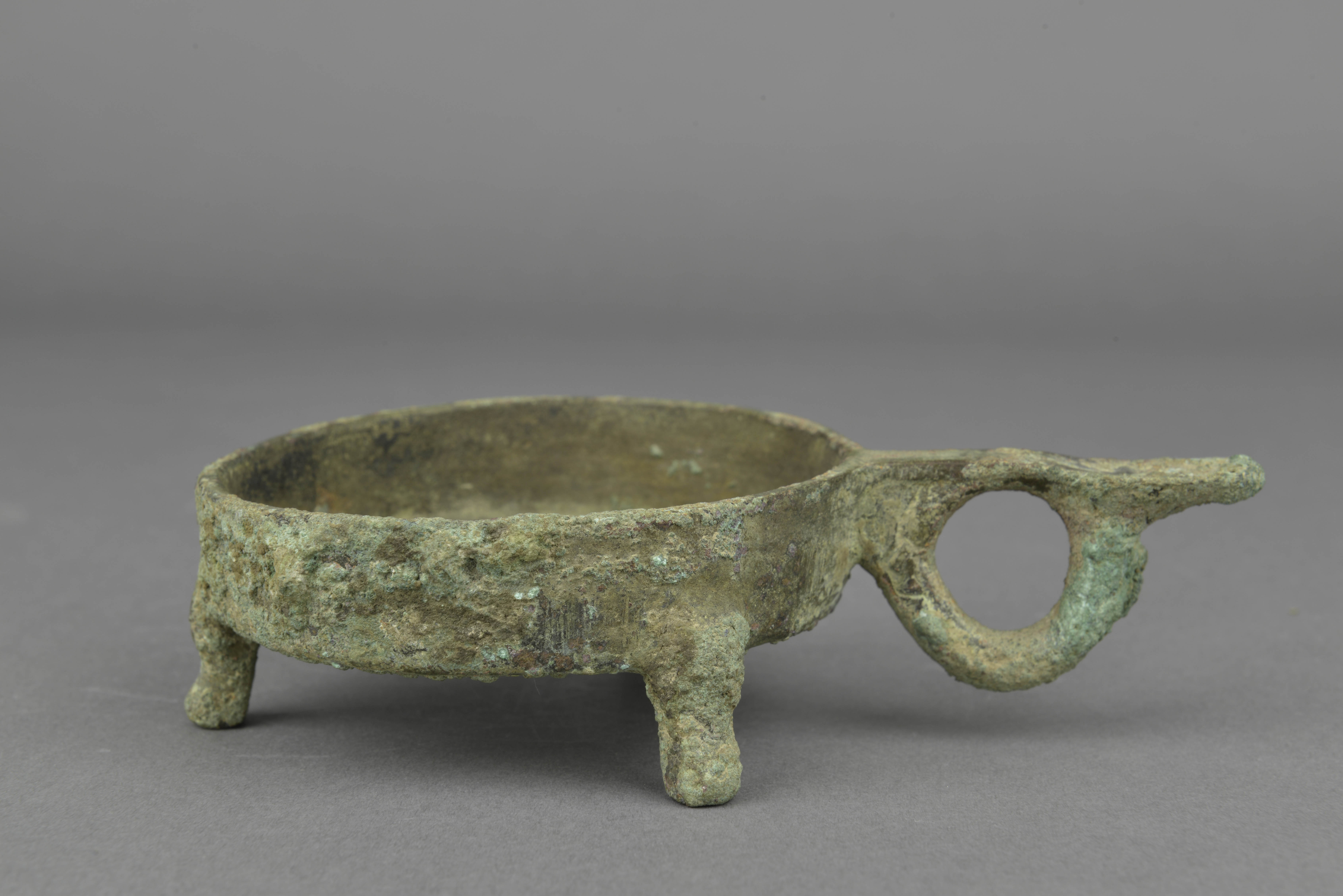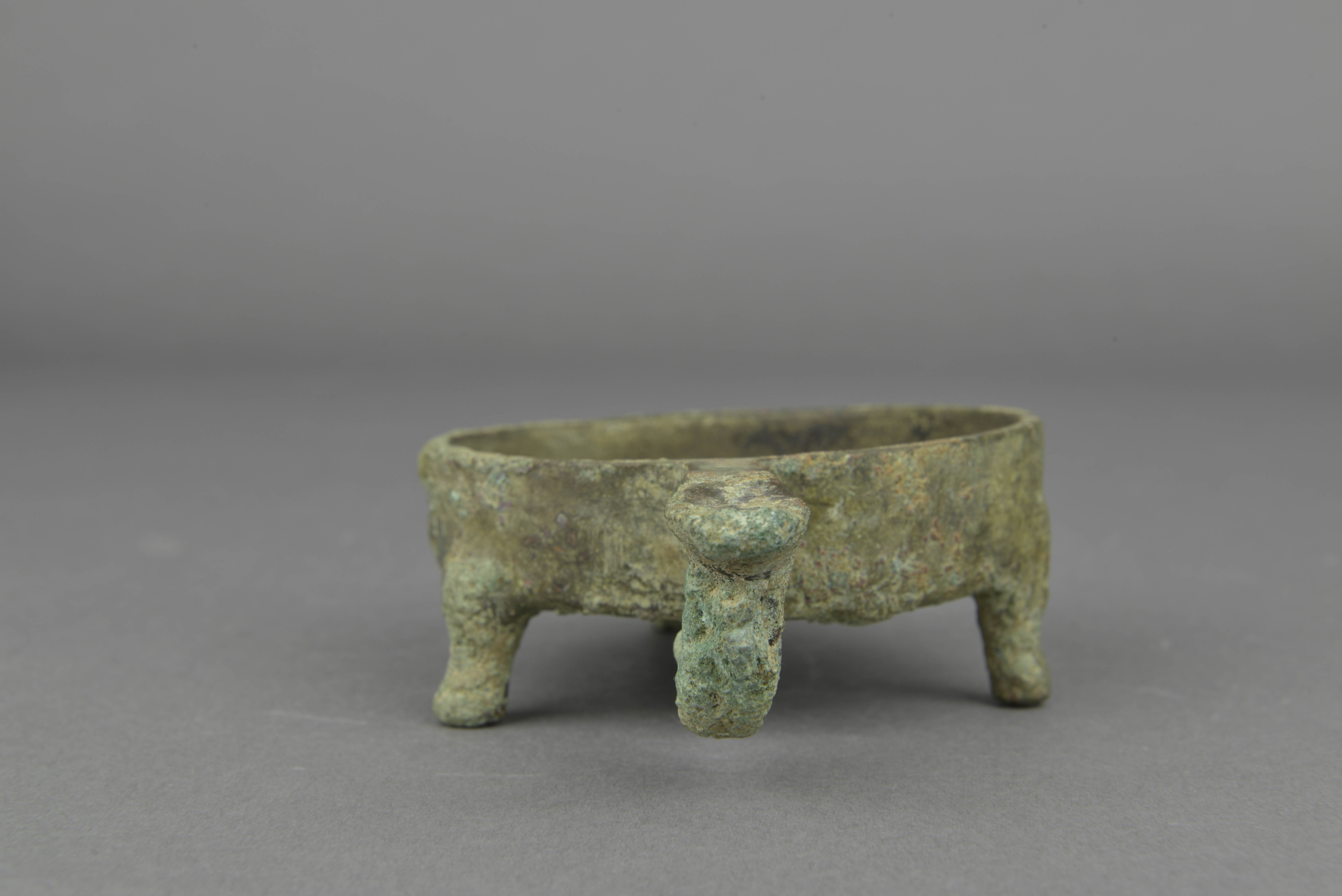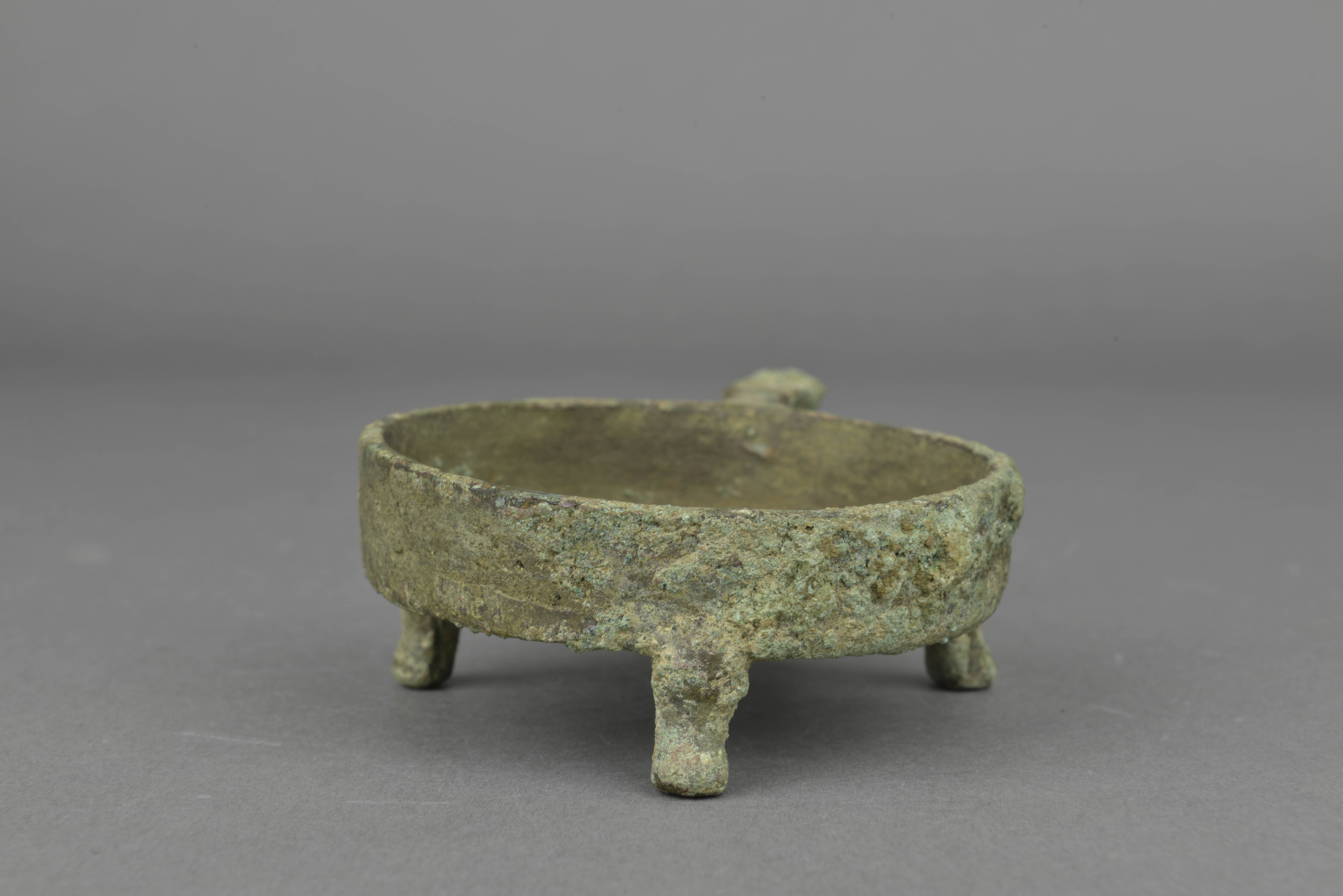 窄平折沿,浅筒腹,平底。三蹄形足。灯盘一侧有一叶状直柄,柄下端置一环。