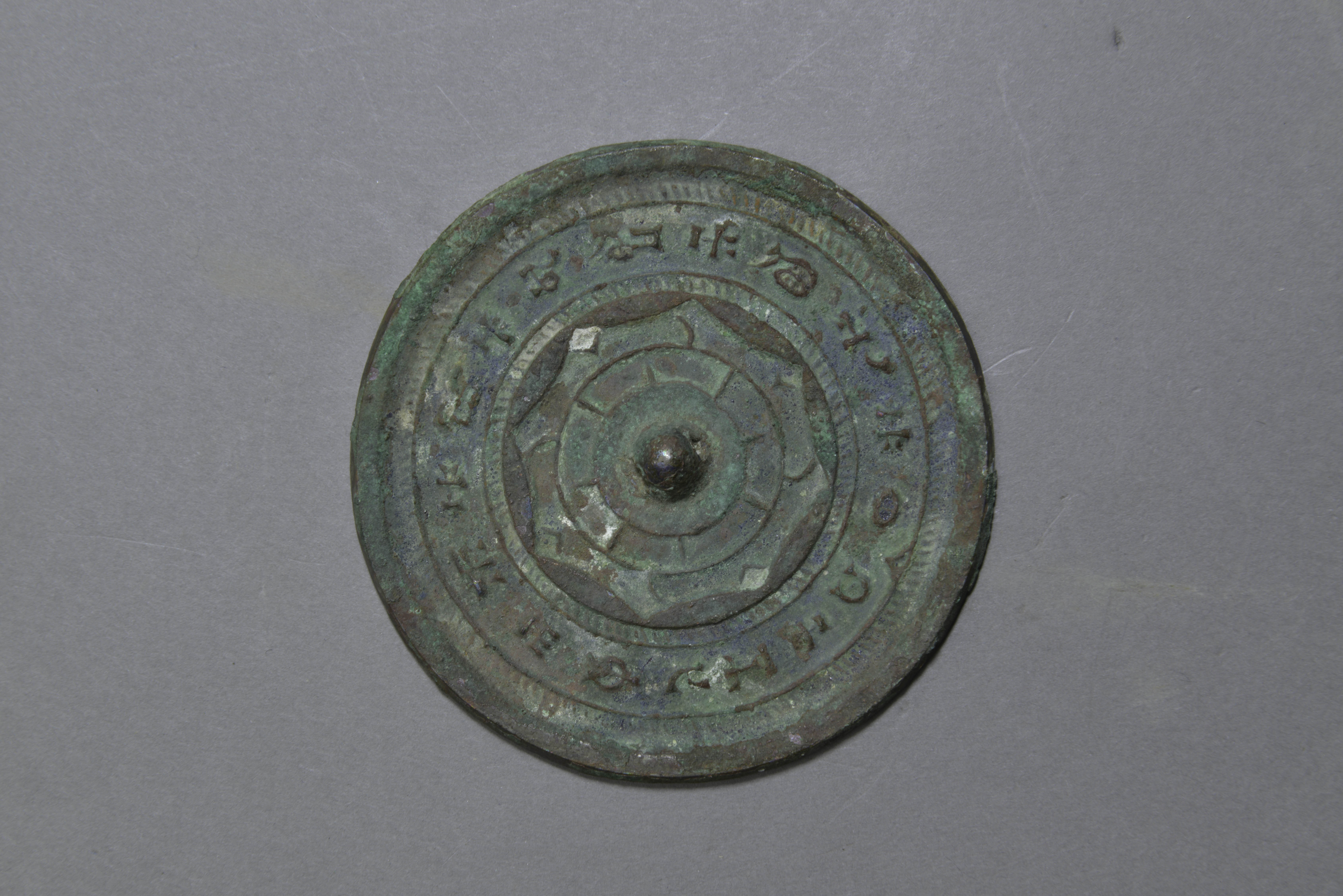 圆形,圆钮,圆钮座。钮座圆周均匀地伸出八条竖线条。外一圈内向八连弧纹,连弧纹外有两组斜纹圈带,其间配置铭文为”内清质以昭明,光£££日月,后一句字不全。每两字夹一纹。素缘。