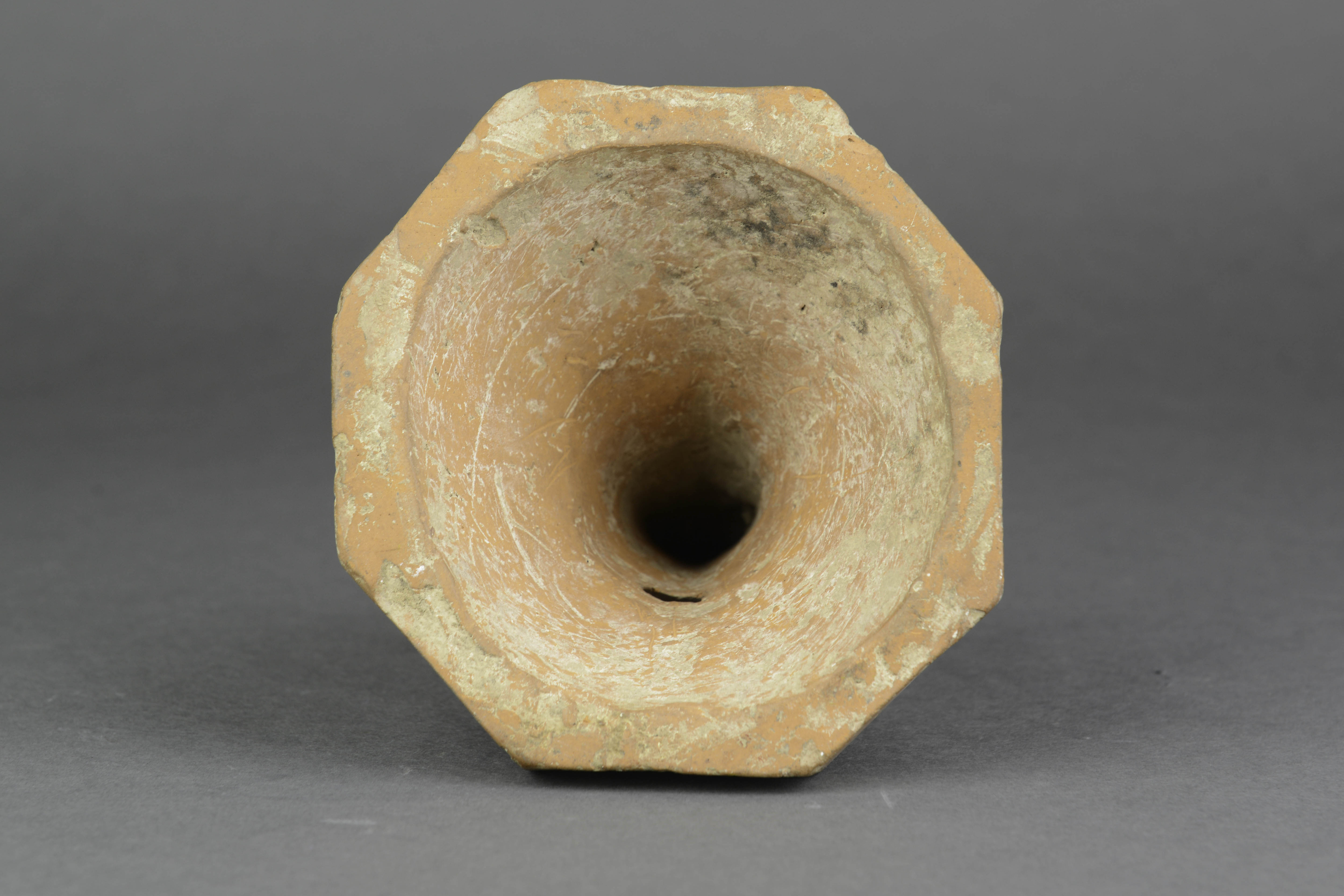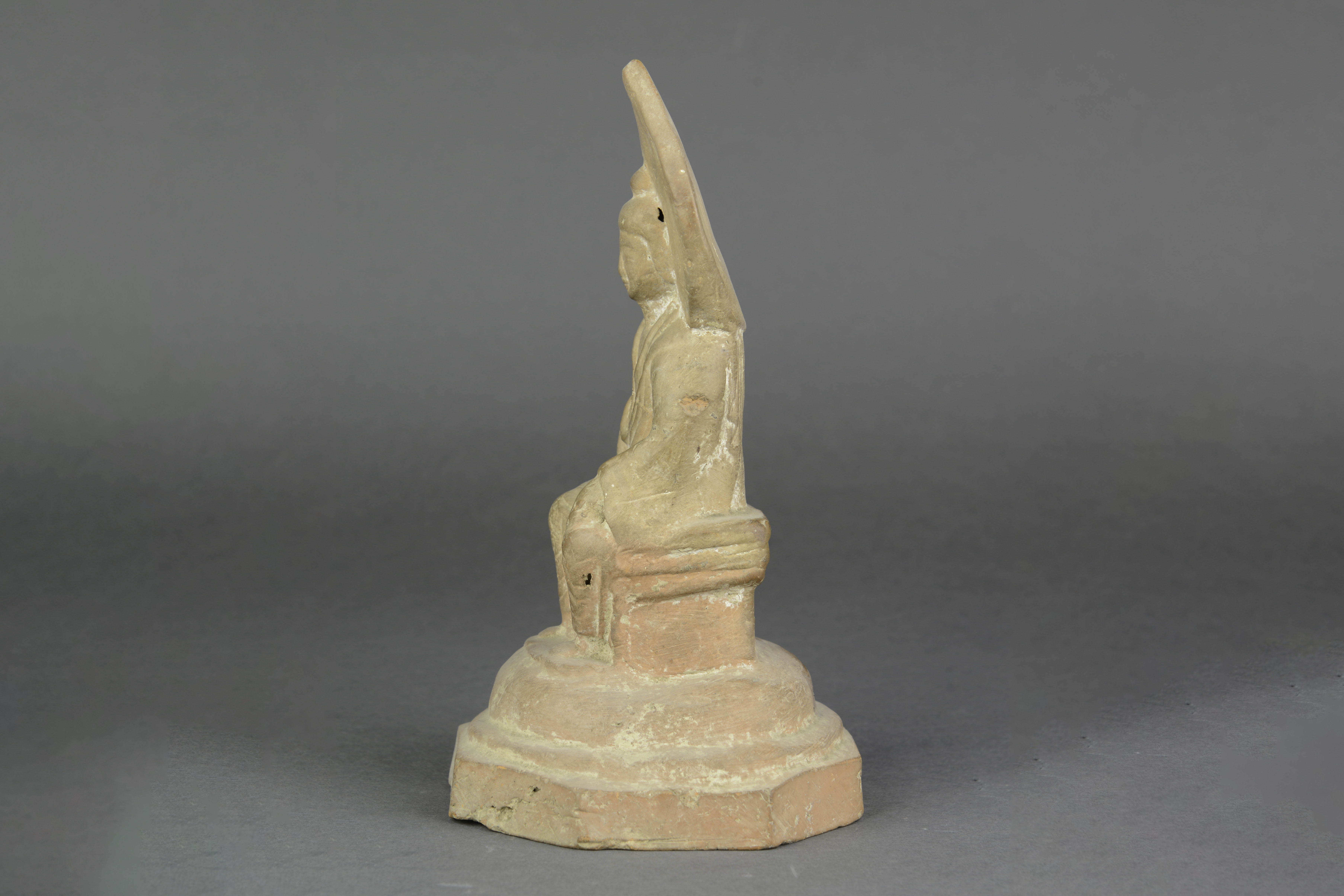 细泥红陶。佛呈坐姿,馒头状肉髻,发髻平展,面相长方形,眉弯曲,目微闭,隆鼻,厚唇,脑后有桃形头光,长颈,溜肩,内着交领衫,外着裹衣博带式袈裟,左臂下垂,手扶膝上,右臂上举,手扶肩上,跣足,坐床方形,下有上圆下方八角形须弥座。