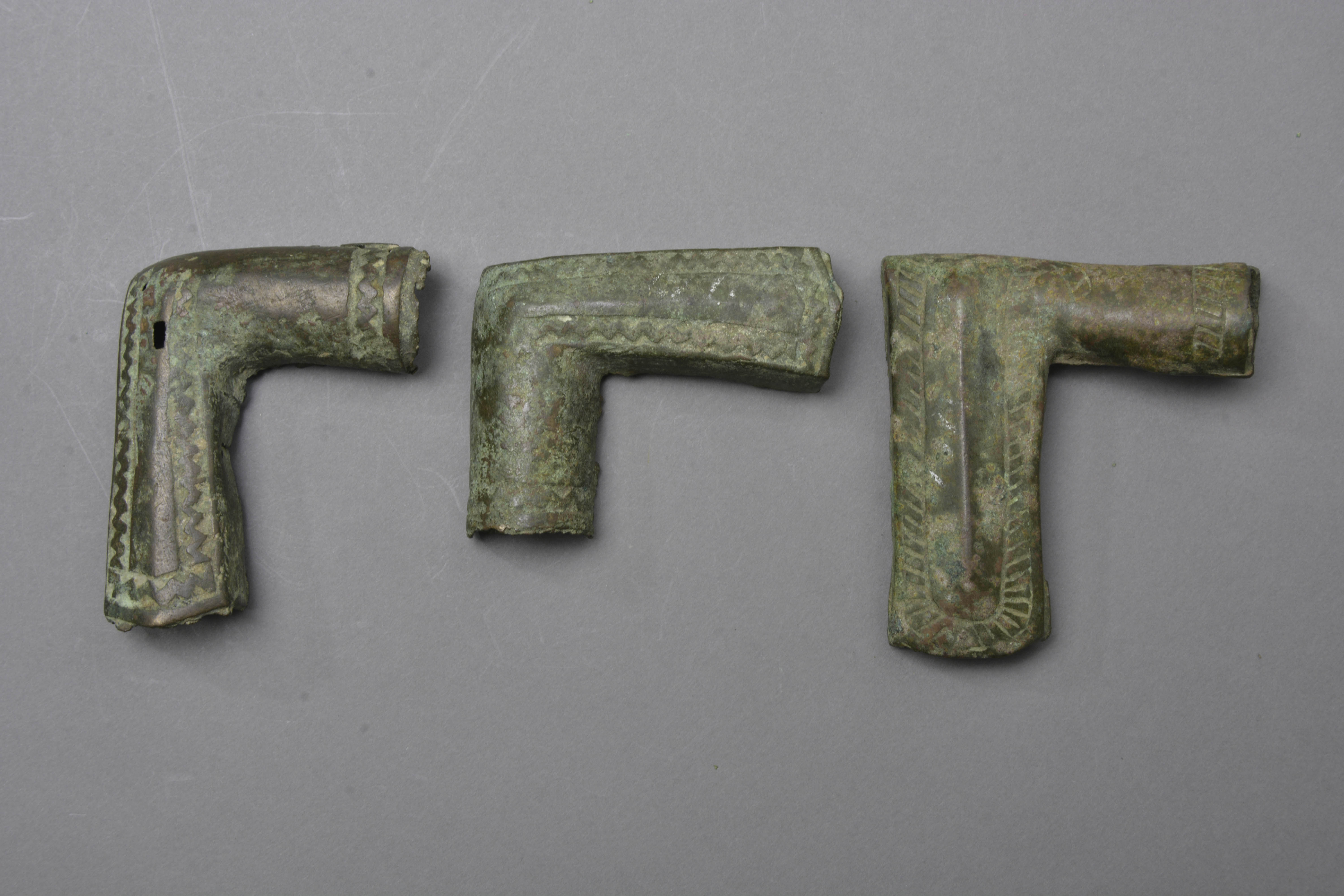 车马饰根据纹饰不同,可分为Ⅰ式Ⅱ式。Ⅰ式两件,曲尺形,一端长方形,一端管状,两形交接处,有一长方形小孔。长方形正面饰凹弦纹带,内饰连续波折纹。管状本基饰凹弦纹带,内饰连续波折纹,背面内凹,两端分别为长方形,圆形穿孔。Ⅱ式一件,凹弦纹,内饰斜线纹。其它相同。