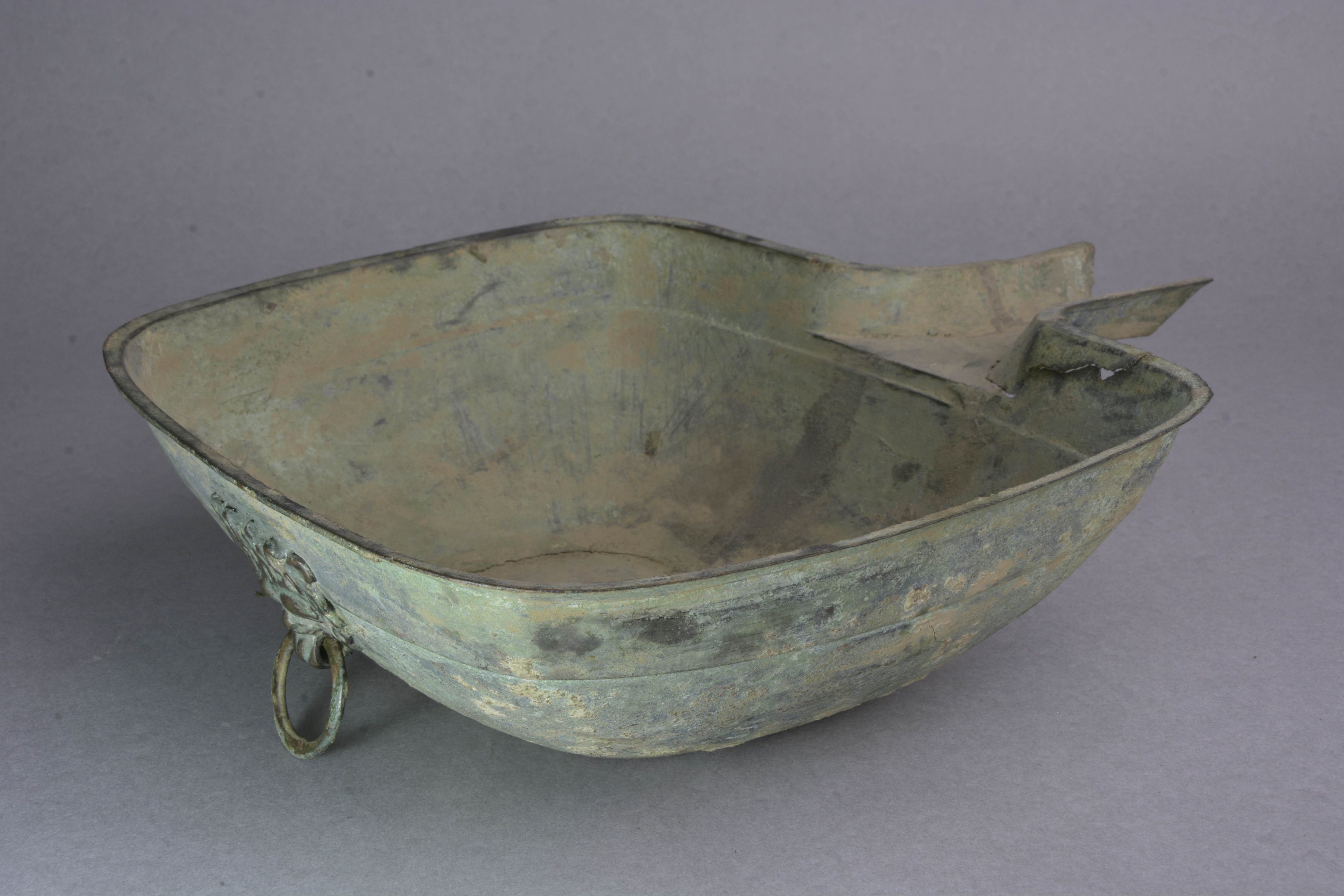 侈口,窄平折沿,腹呈方圆形,槽状流,平底。腹部饰一铺首衔环。