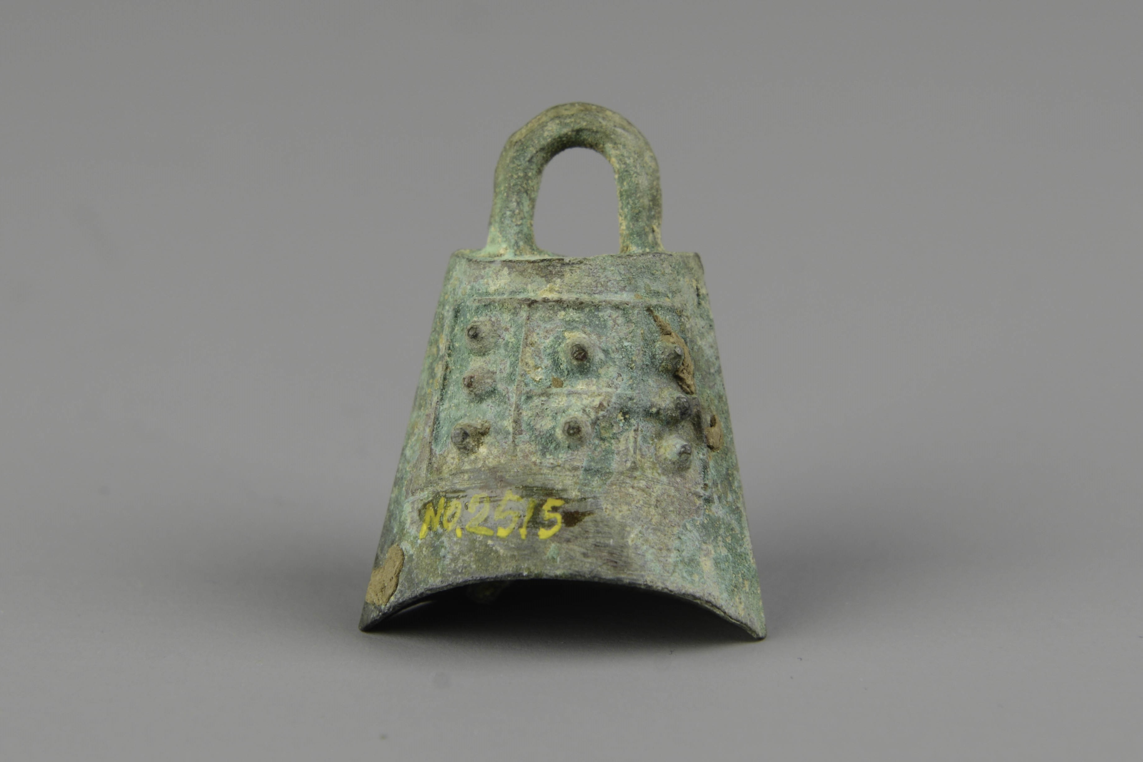 器壁特薄,形体矮小。截面为椭圆形,顶部有半环形钮,钮下有一小穿孔与腹部贯通,孔上衔接一铃舌,摇之即响。铃身正面、背面饰方格纹分割的乳钉纹。