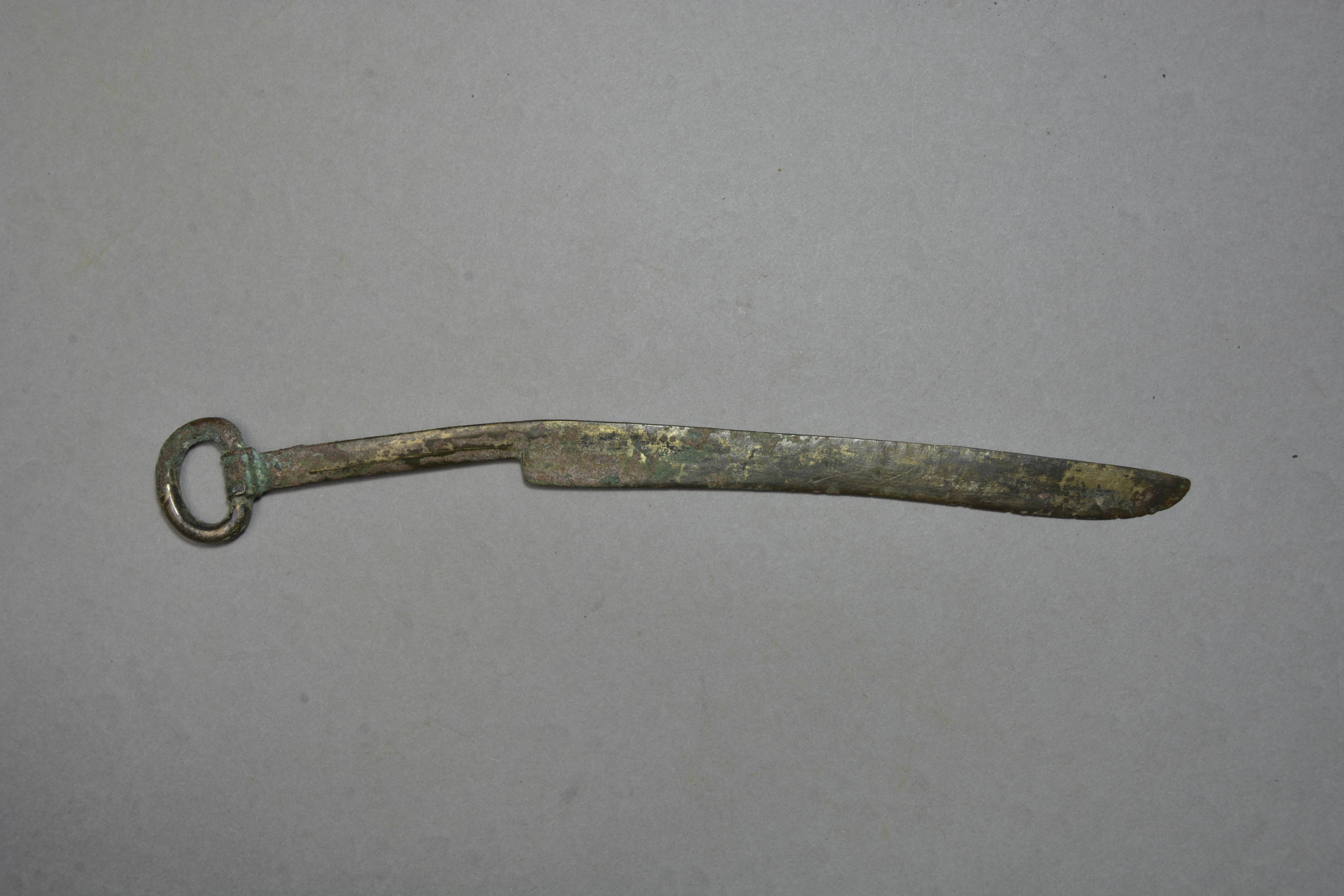 24.2厘米,刃宽1.5厘米。青铜质,呈狭长状,略带弧度,柄端有环。