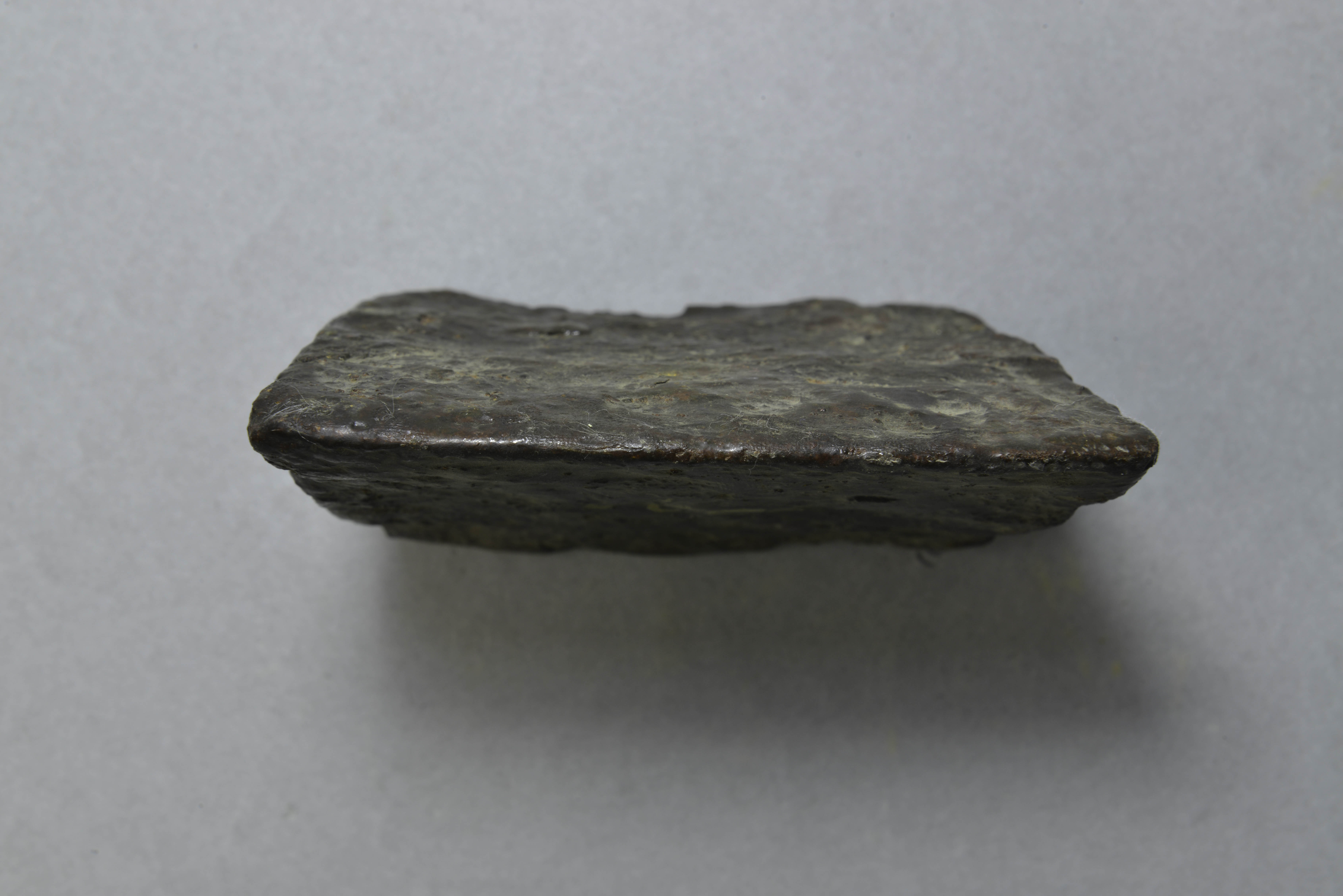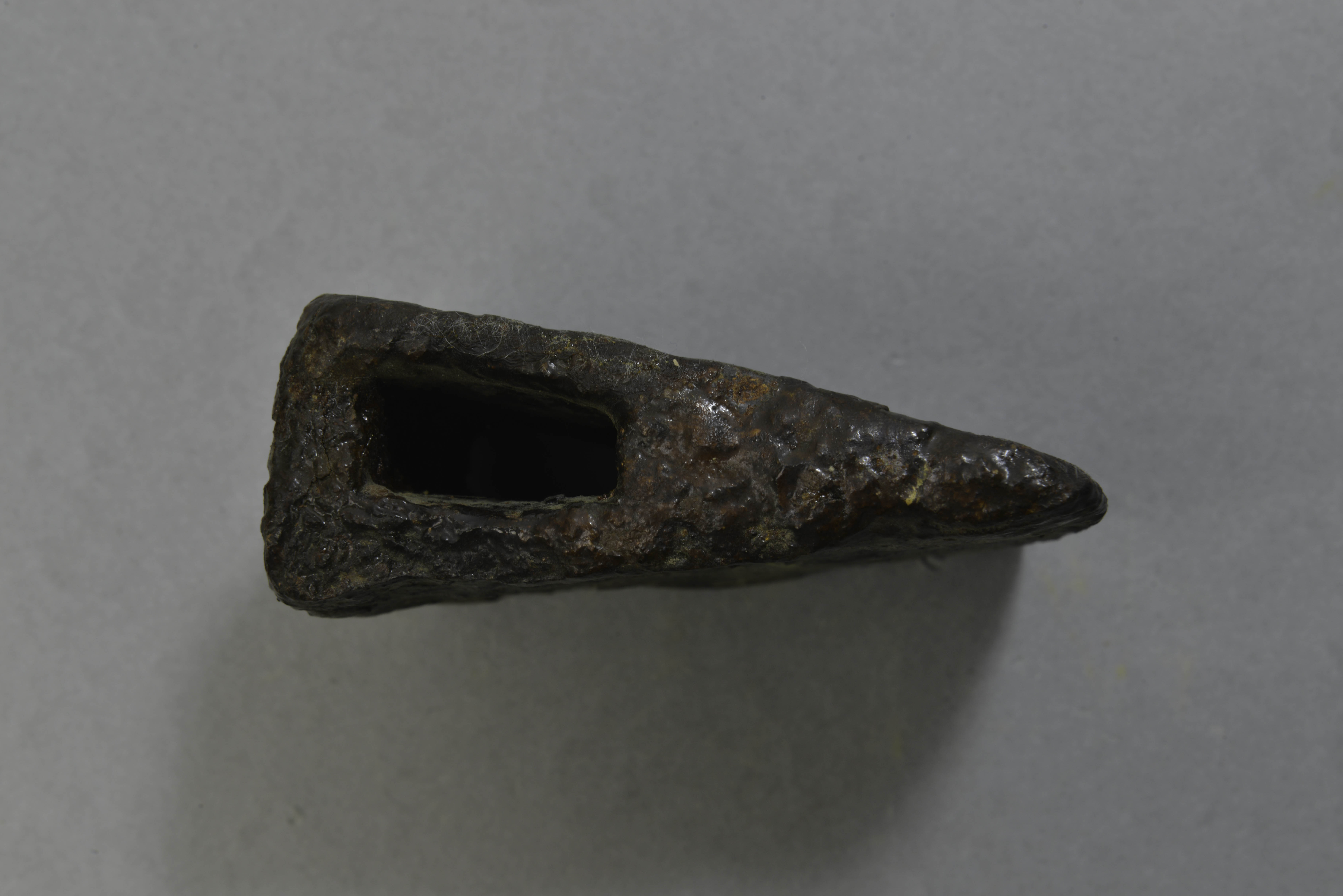 器身整体呈方形,双刃两端微上翘,顶部有一长方形穿孔。