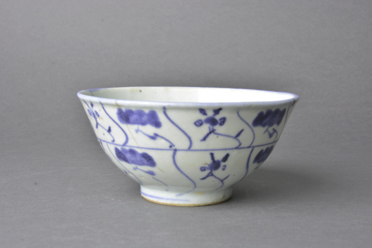 敞口,圆唇,口沿下作一周凸棱,弧腹,小圈足。内壁刻莲花纹,施青釉,有开片,足圈露胎。