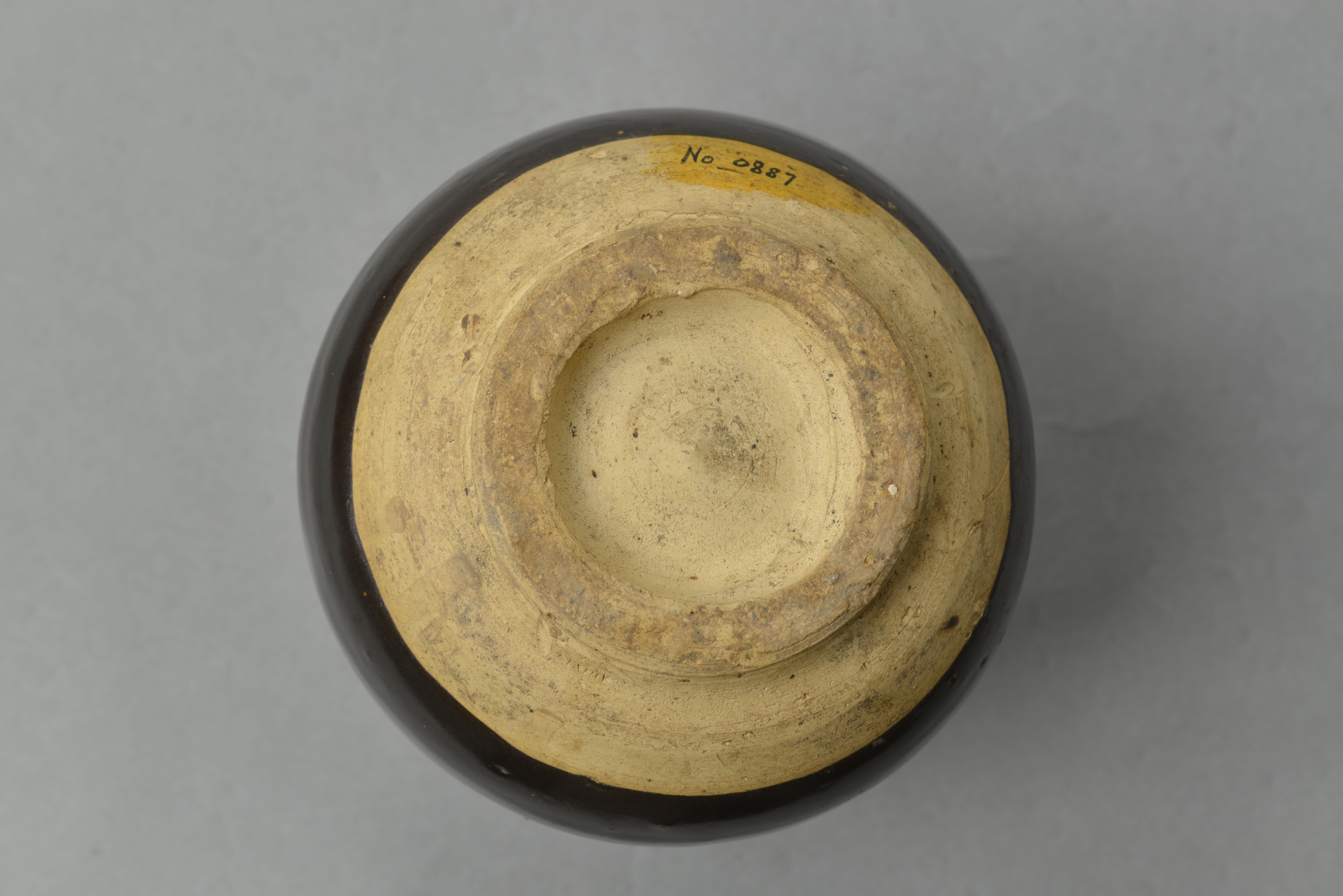小口,圆唇,束颈,颈肩部作半环形双耳,垂腹,圈足,脐底。施黑釉,近足处及底足露胎。