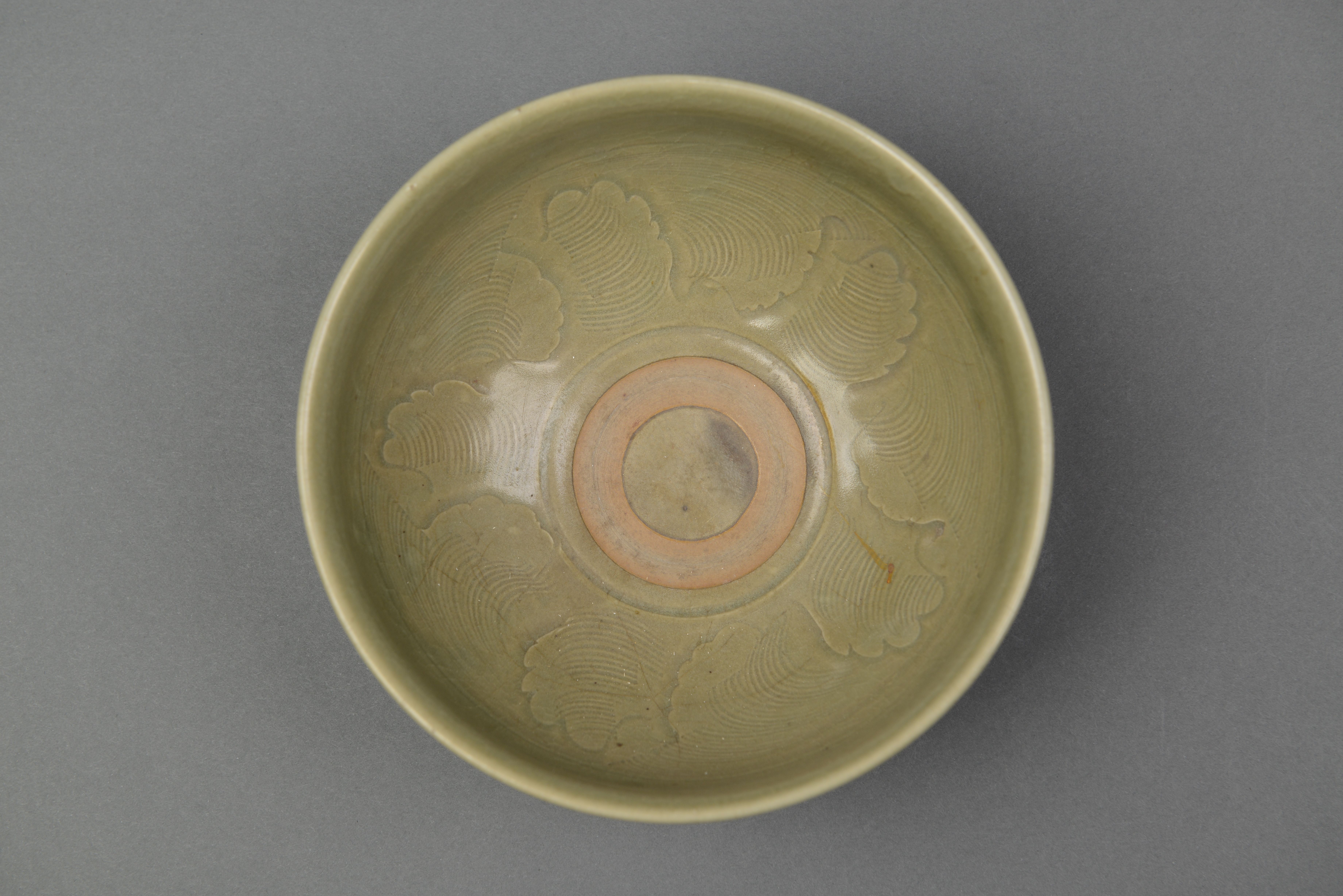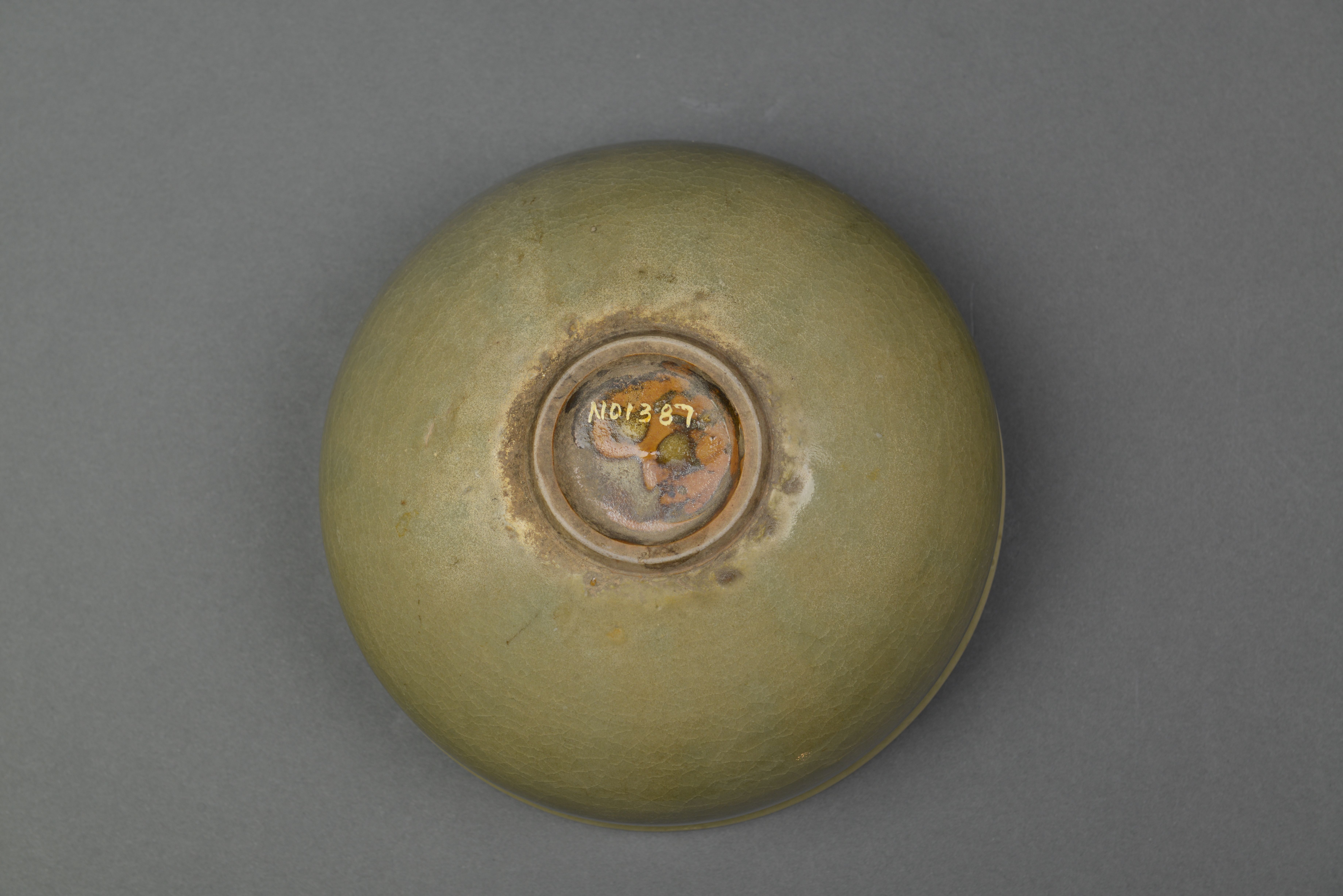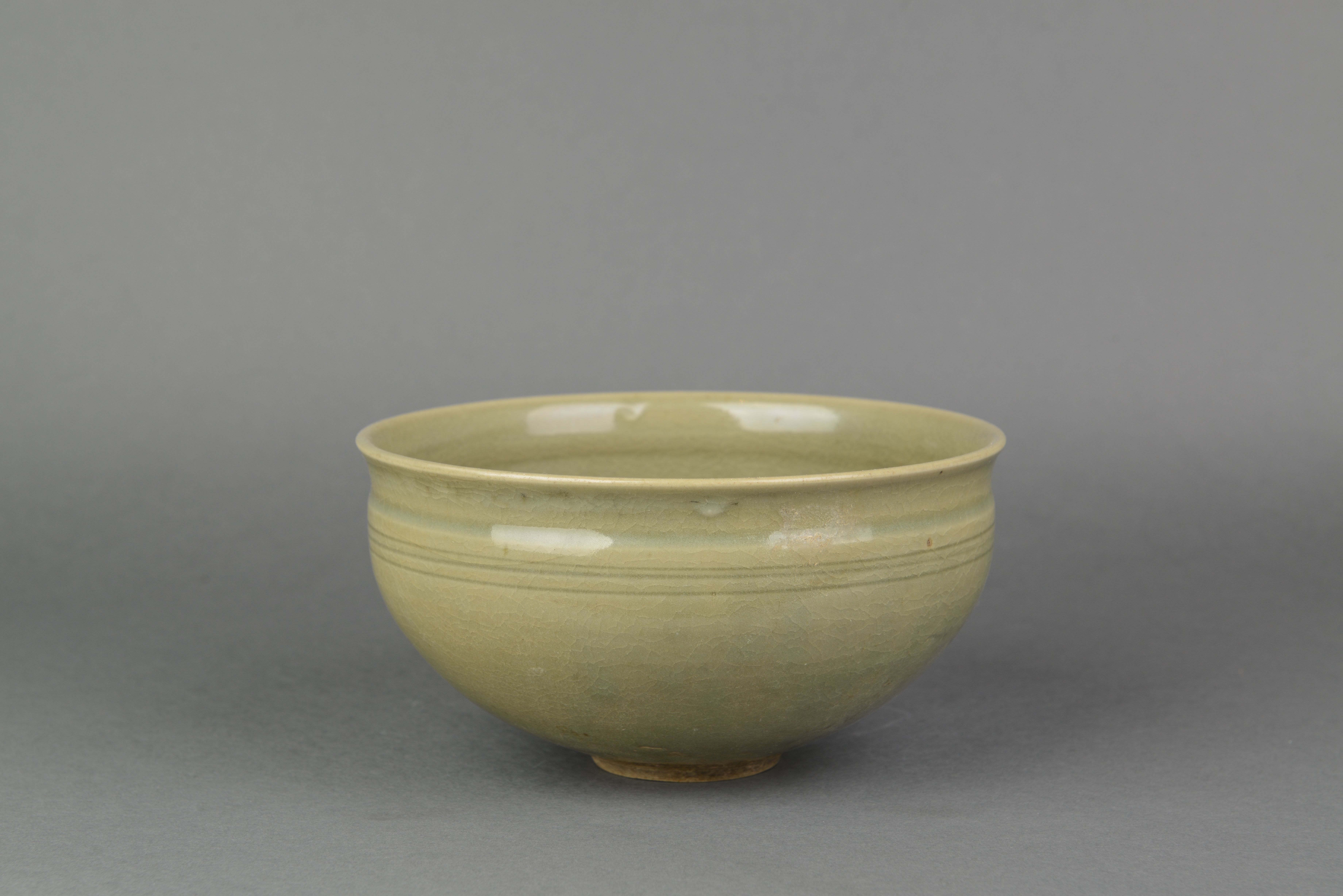 侈口下微束,弧腹,小圈足。内壁下部篦划水波纹,外壁上部刻三周细弦纹。通体施豆青色纹片釉,内底刮釉成涩圈,圈足露胎。此钵造型稳重,釉质细润,是耀州青瓷艺术的精华,弥足珍贵。