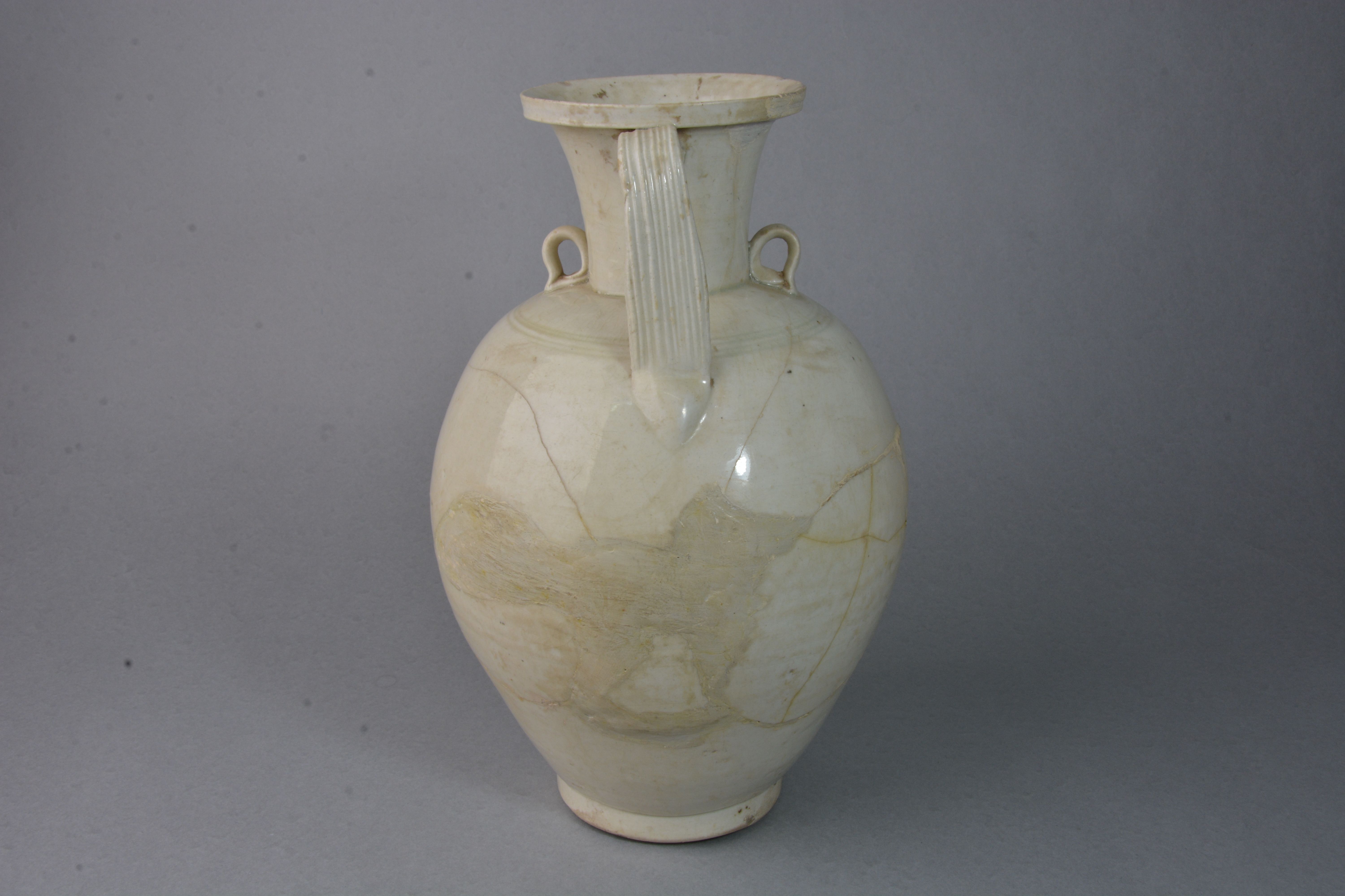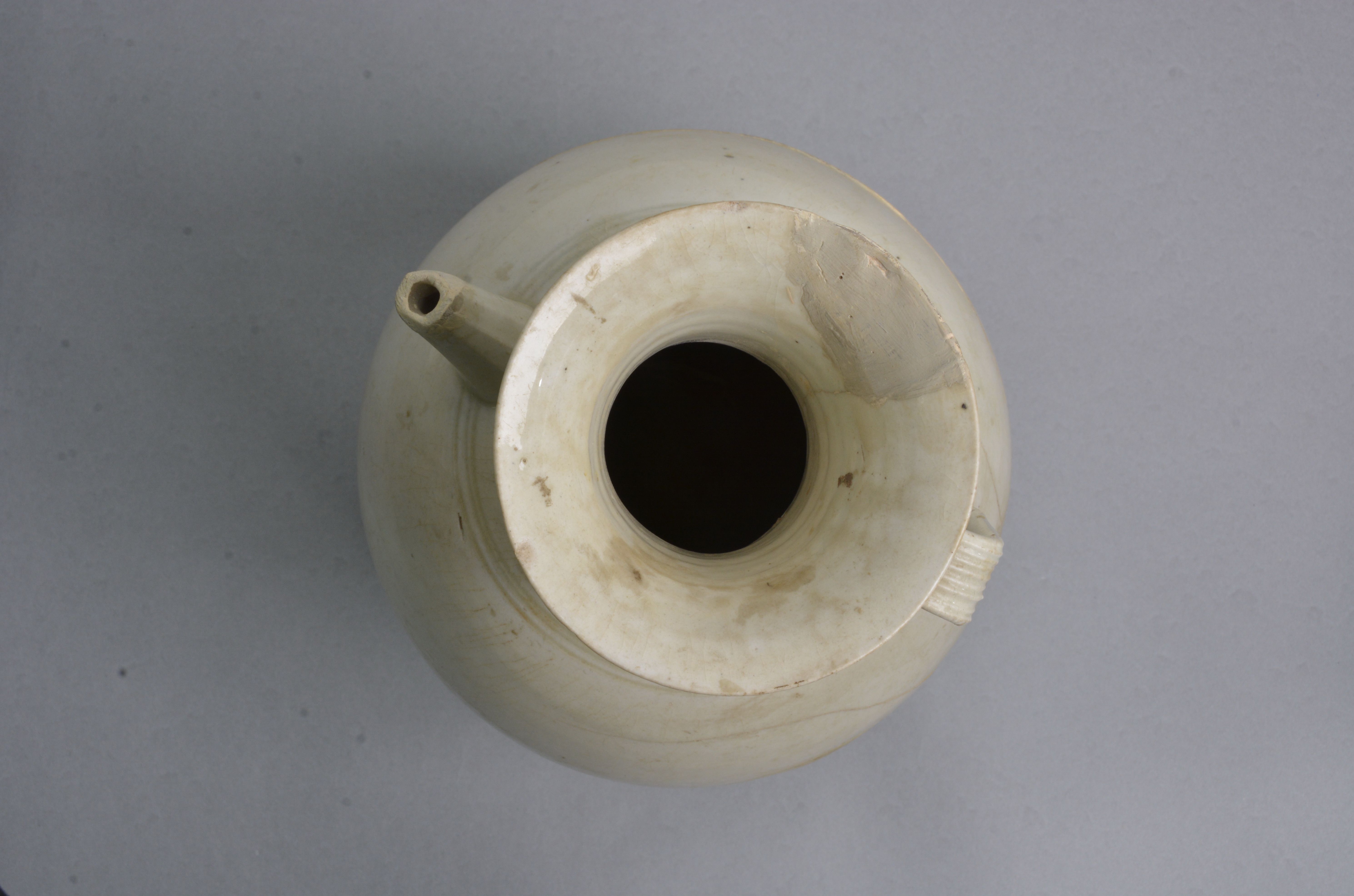 敞口,束颈,鼓腹,圈足。直流,颈腹间作一曲形柄,腹上部有对称的环形系,器外施白釉,底心刮釉。器内口部、颈部施白釉。腹上部饰三周凹弦纹,柄上饰竖线条纹。