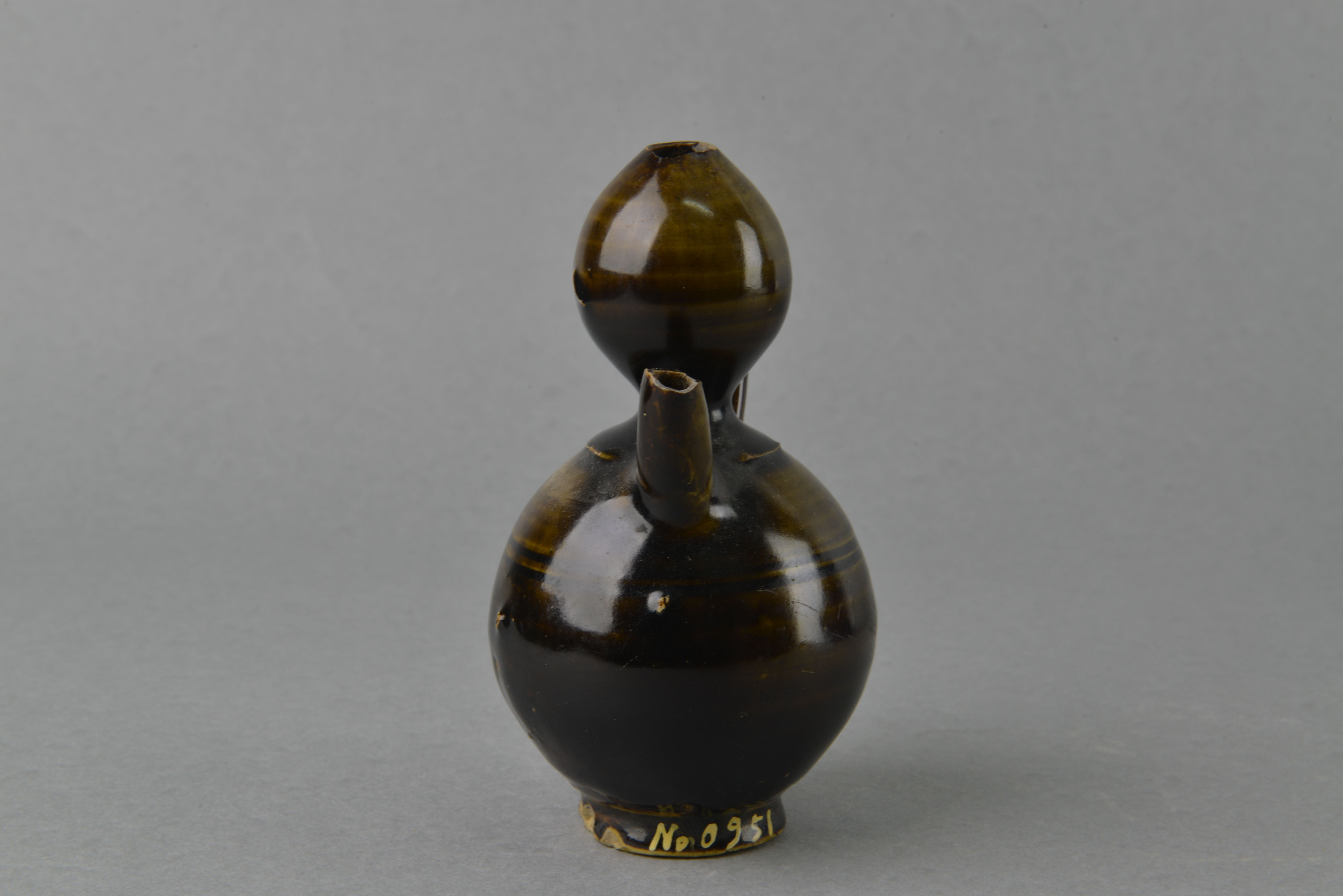 小口,器身呈葫芦形,短流,曲柄,圈足。器外施酱色釉,足根刮釉。