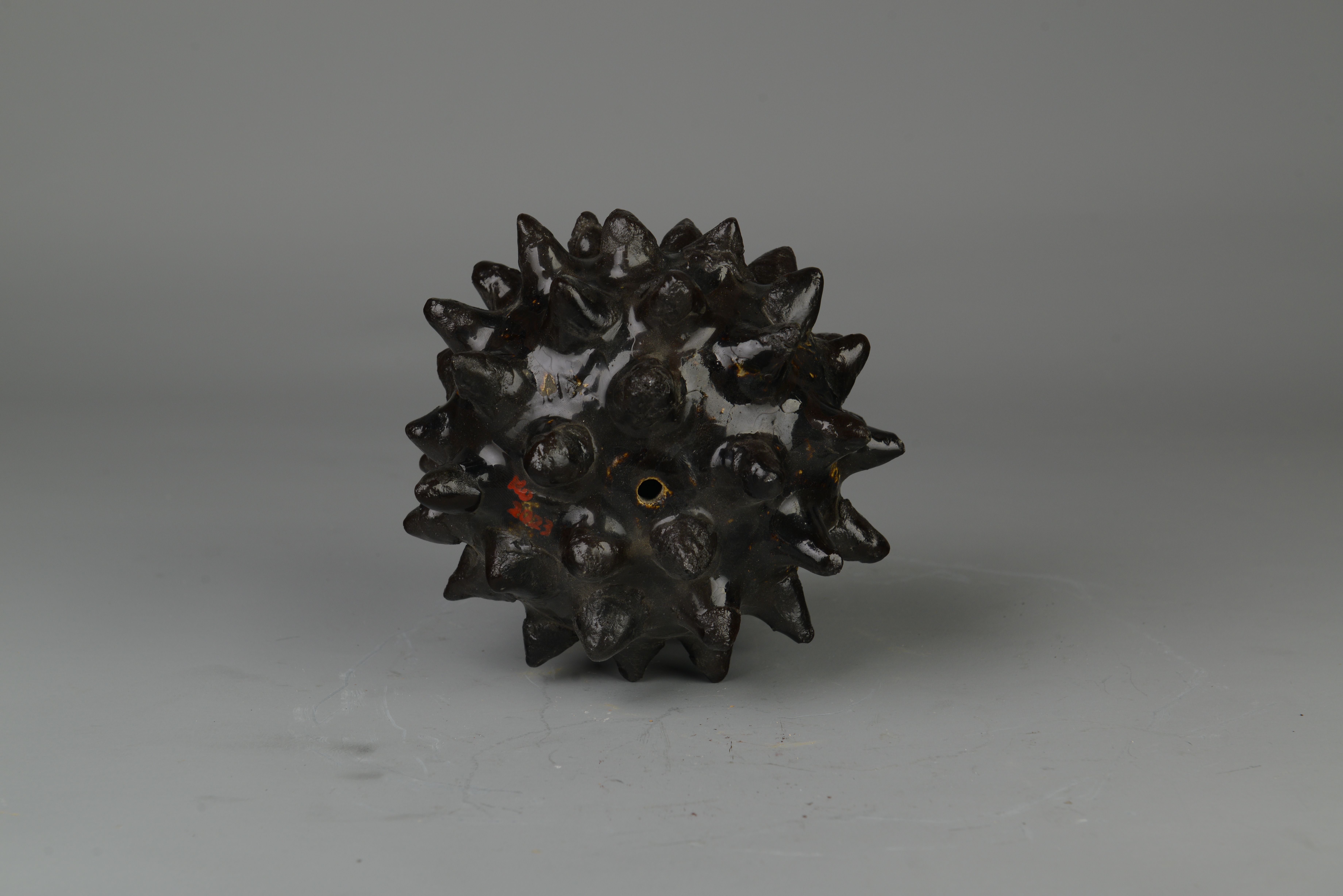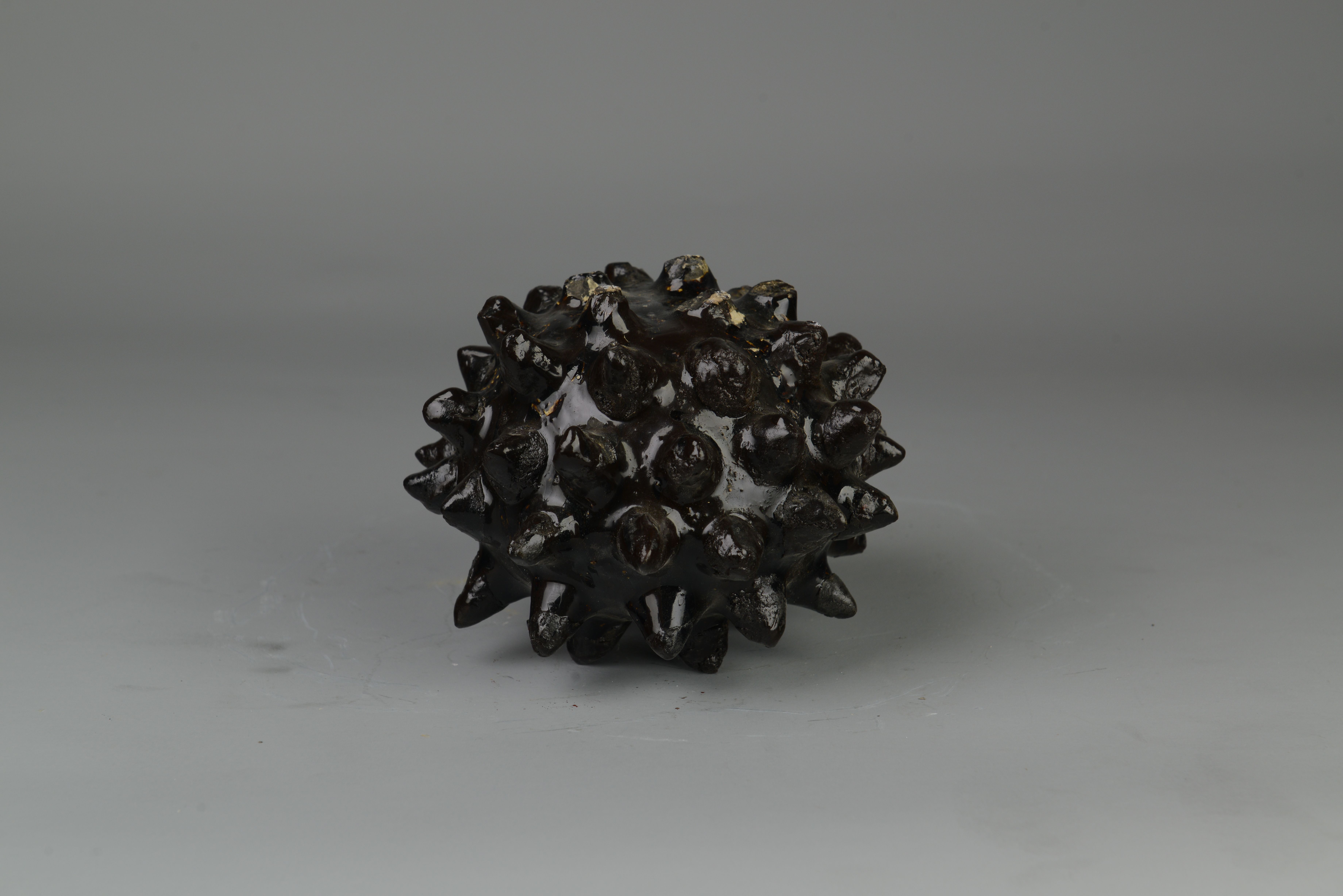 器身呈扁球形,上有数个锥状形刺。中空,一端有圆形穿孔。通体施黑釉。