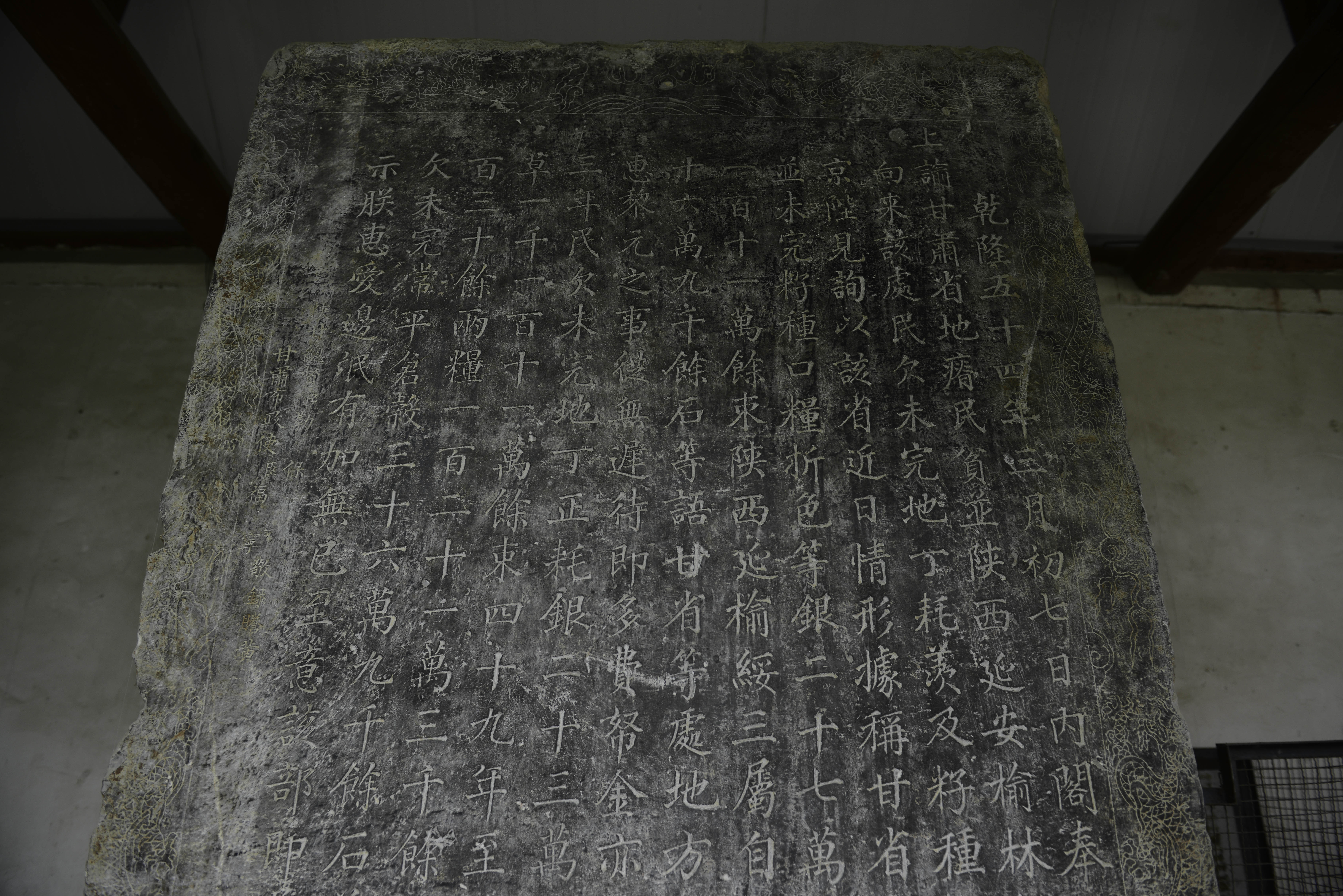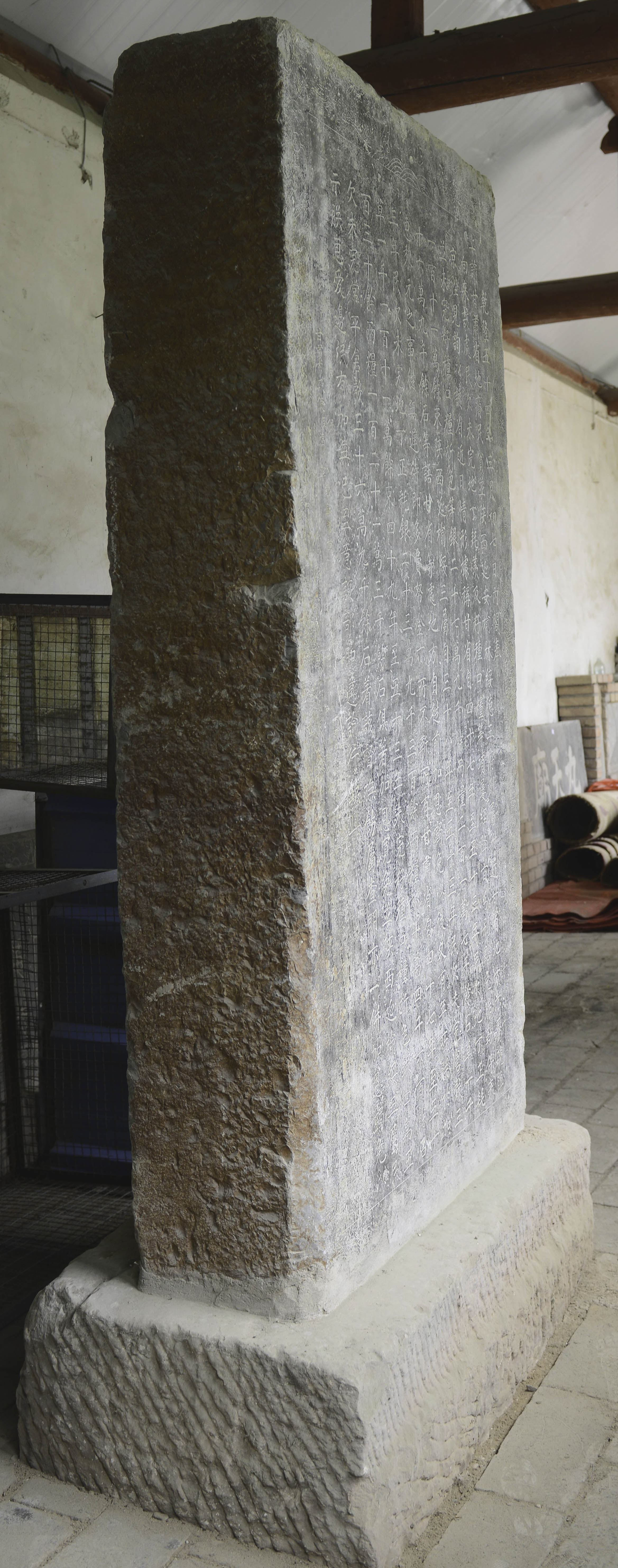 青石质,碑身长方形,无额无座,四周阴刻龙纹。