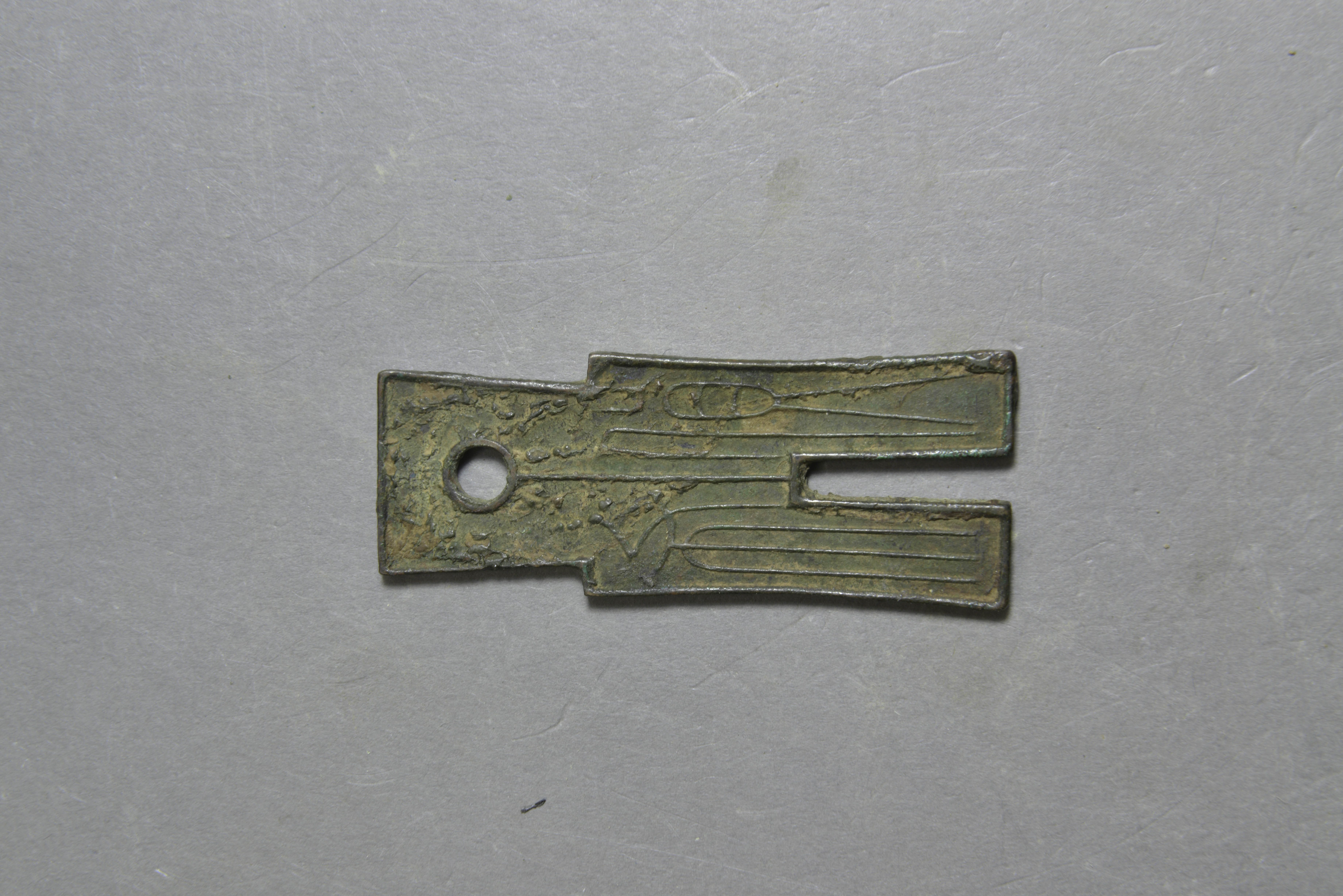 平肩,方裆,方足,首部一圆形穿,钱文为悬针篆