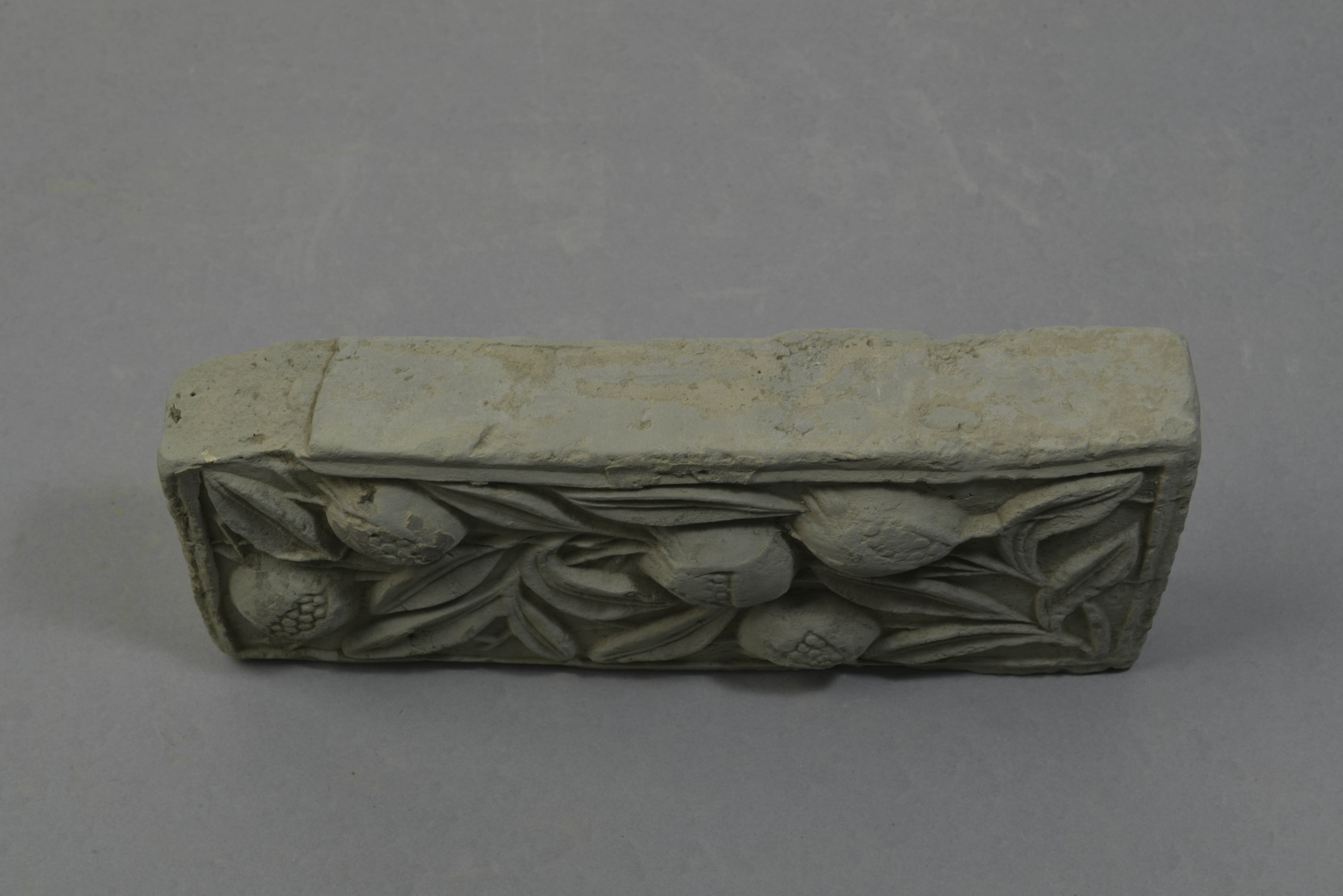 泥质陶,长方形,正面边框凸起,内浮雕折枝石榴纹,背面平素。