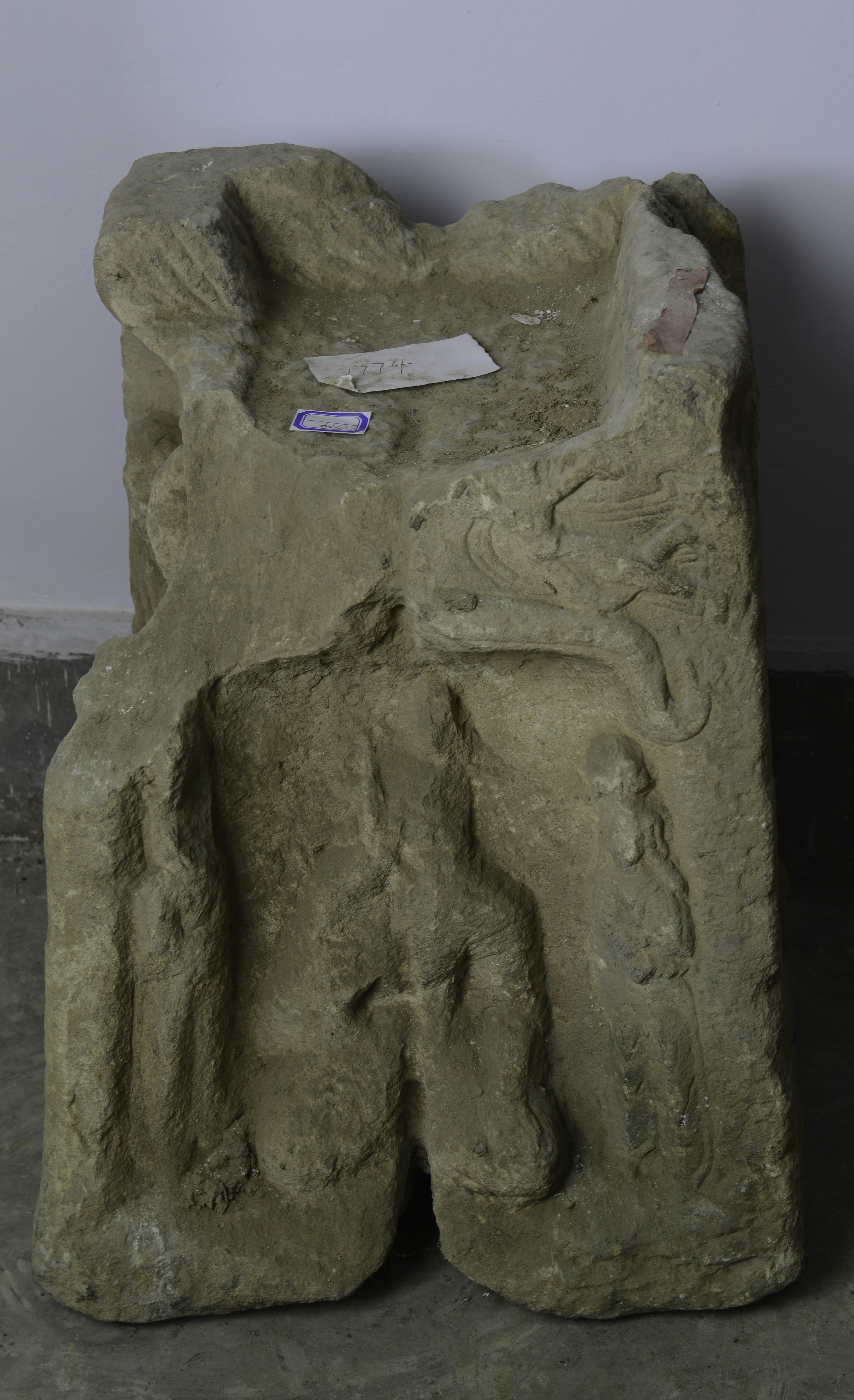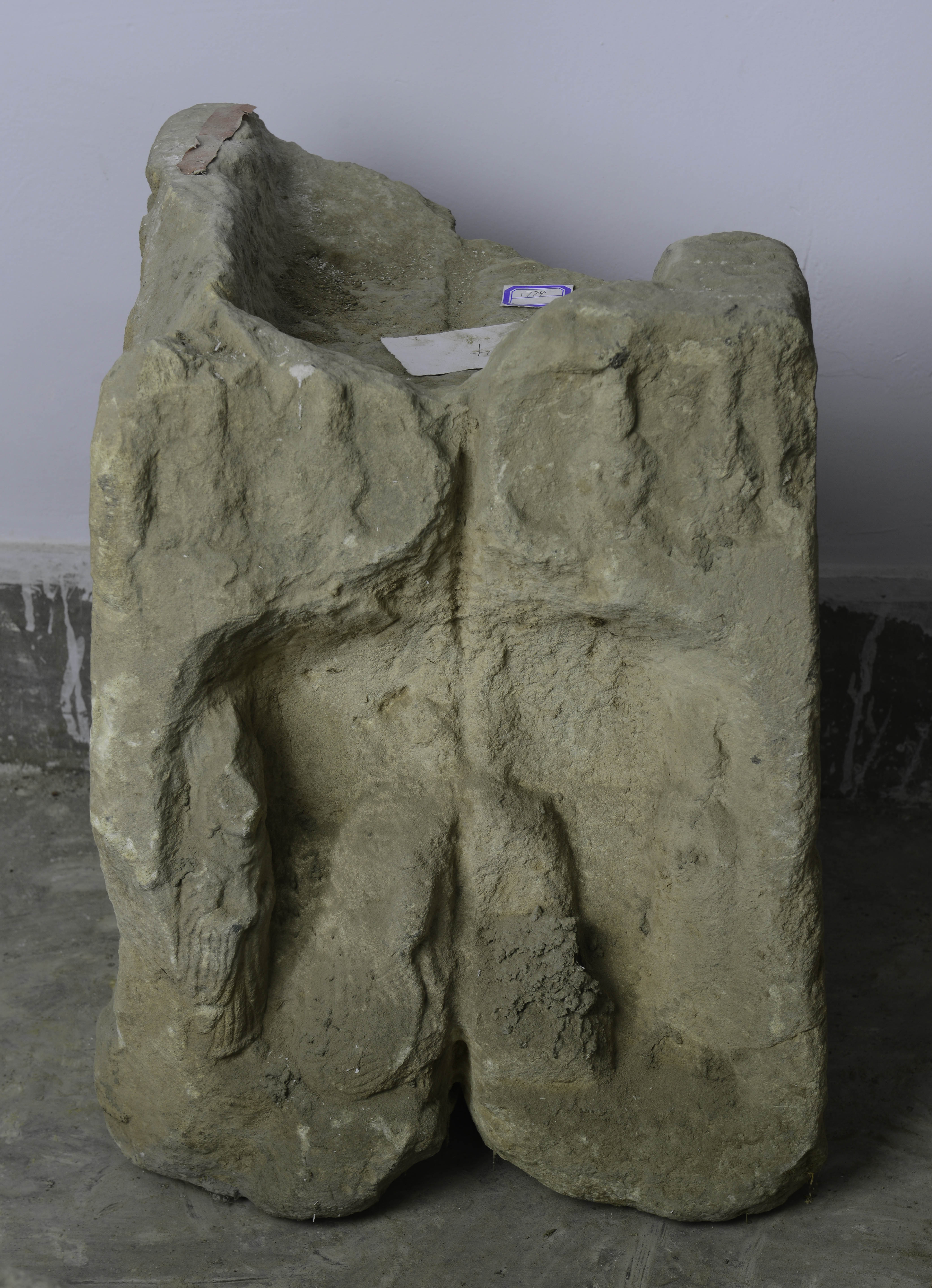 灰黄色砂岩质,塔身作上小下大四面柱状,顶部有方形卯,四壁开莲瓣形龛,均雕一坐佛二菩萨,佛高肉髻,大垂耳,面相清癯,着褒衣博带式袈裟,衣褶细密,结跏趺坐。正面佛坐下浮雕七身女供养人,左右两面龛楣分别浮雕四身和七身女供养人,背面龛楣浮雕飞天,龛侧刻记漫漶不清。