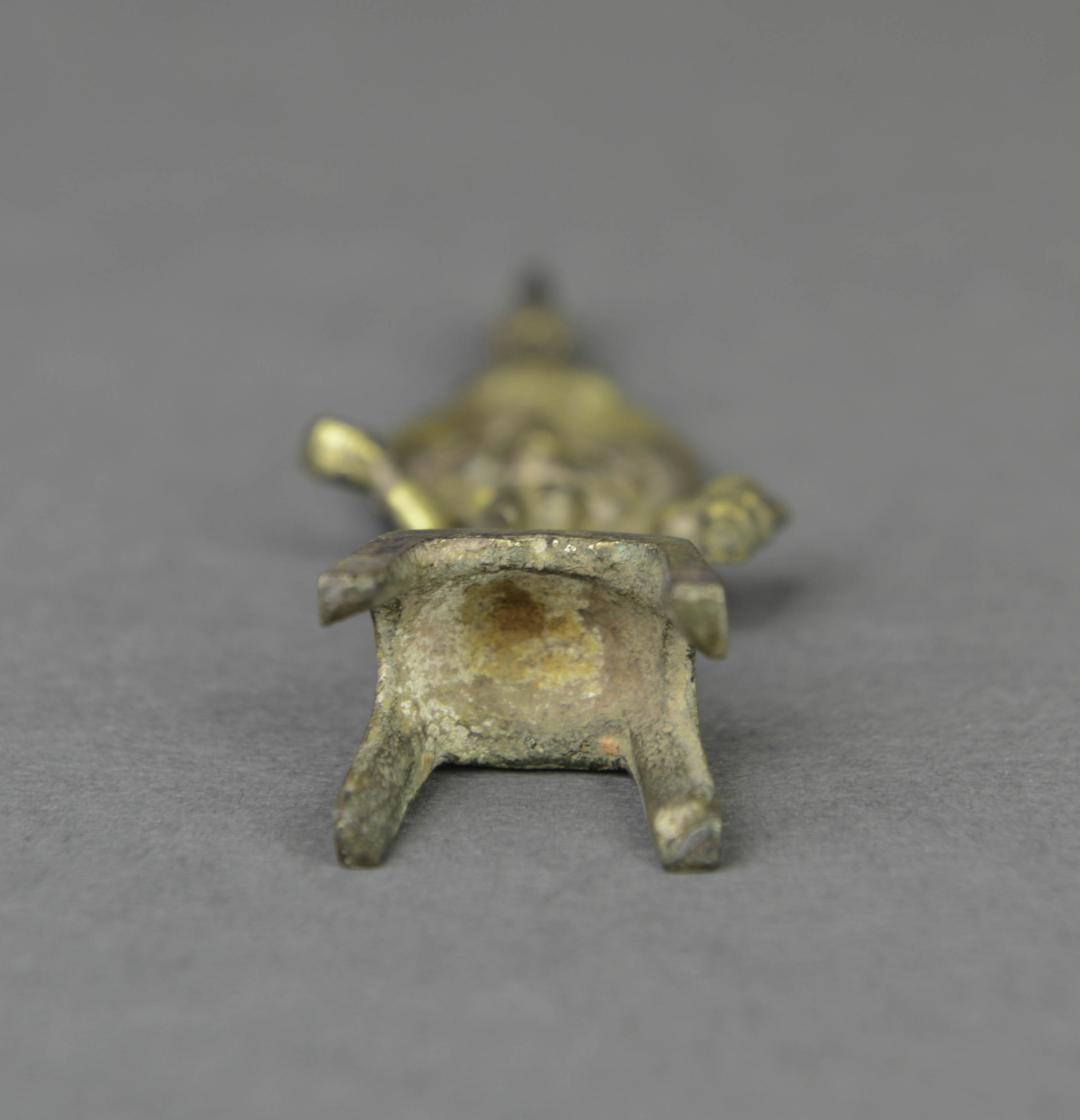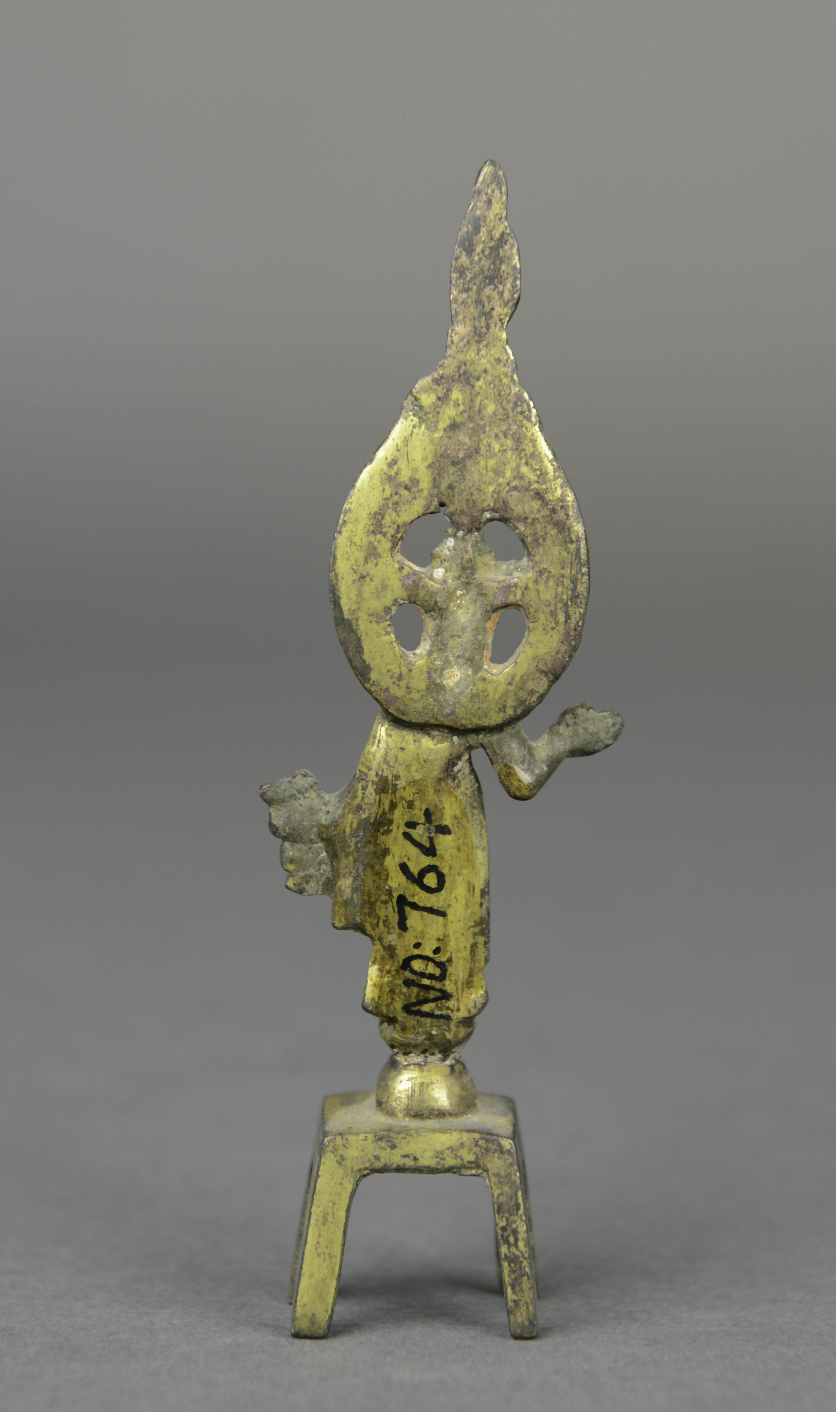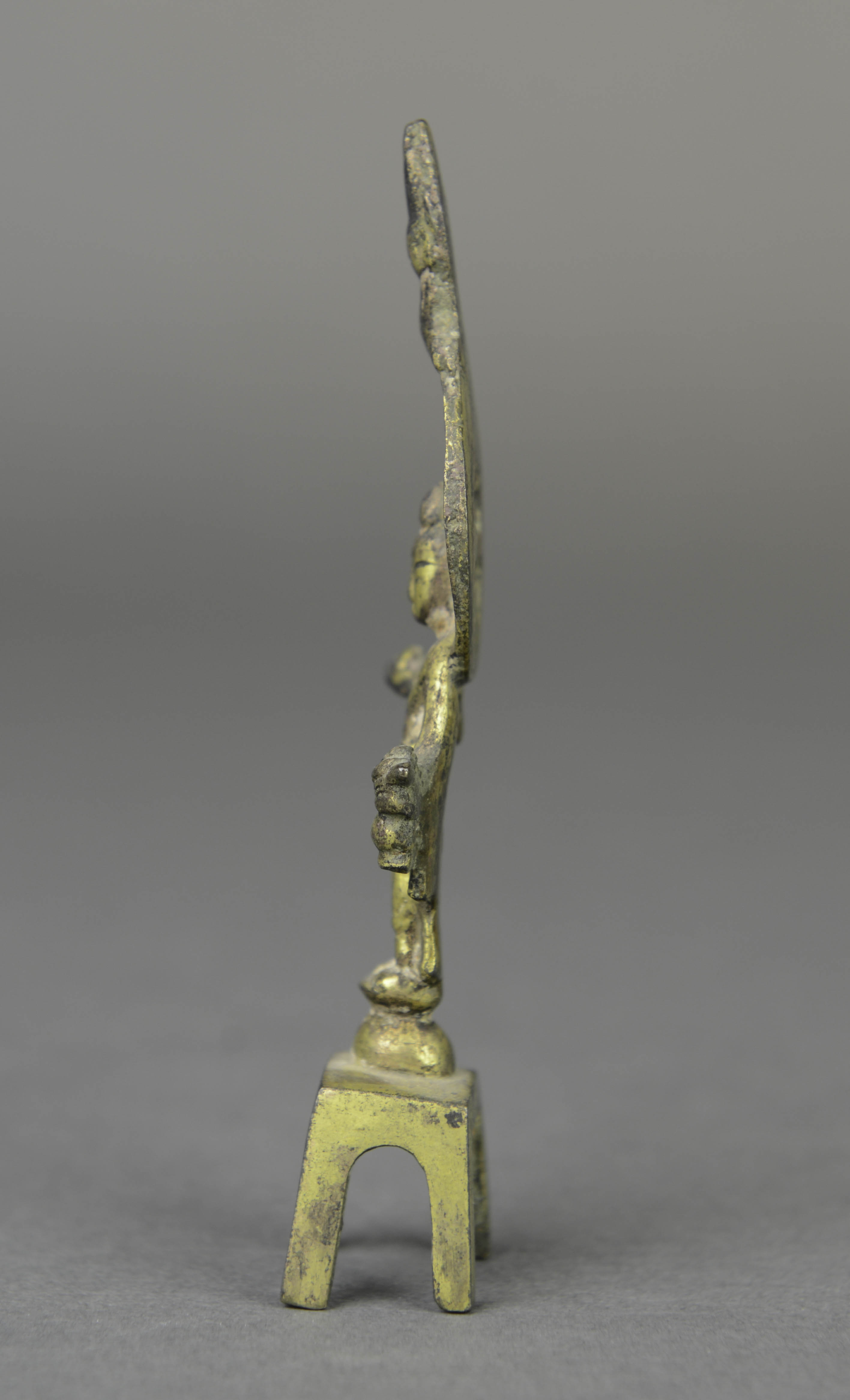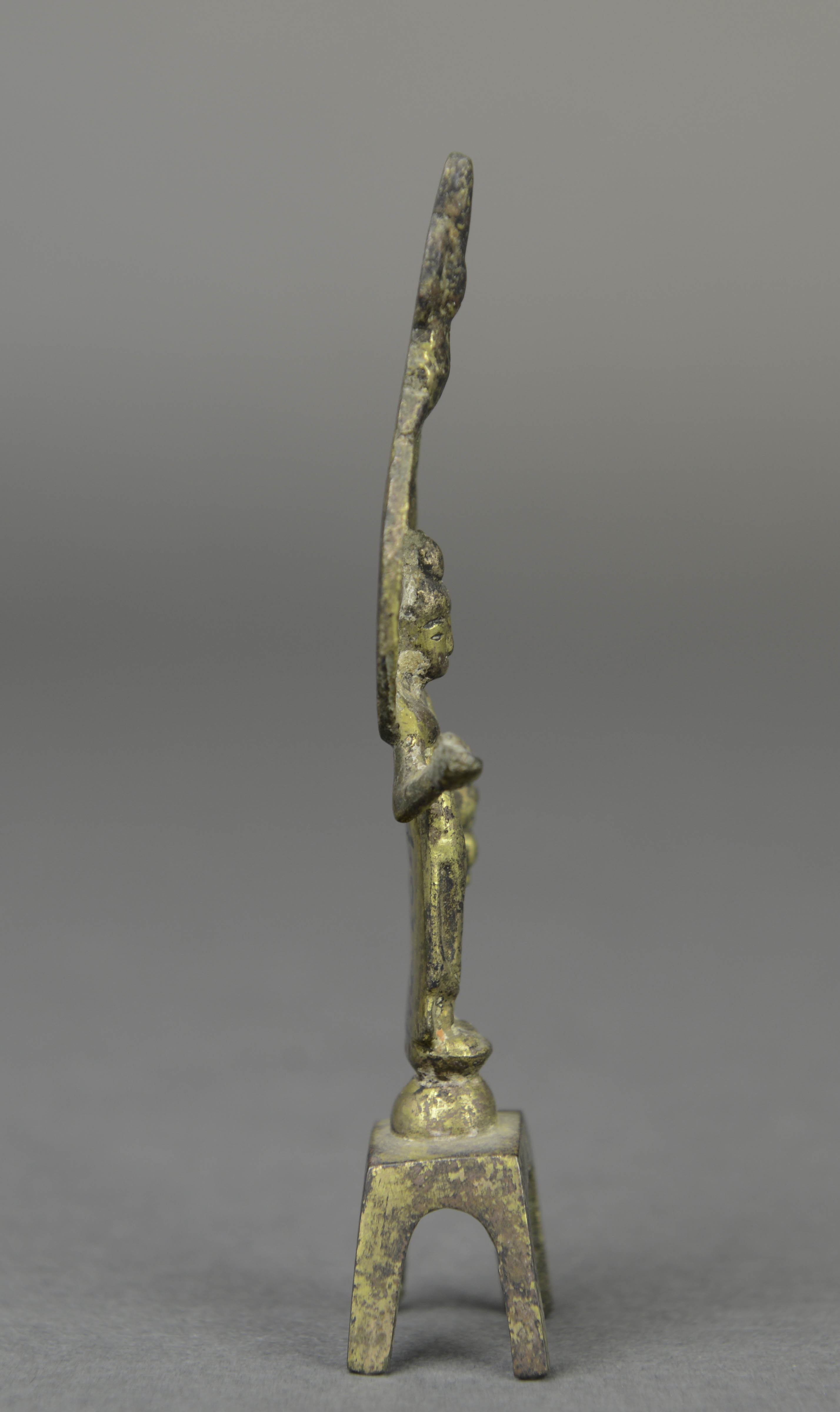 头戴宝冠,面相方圆,脑后有镂空桃尖形背光,背光顶端置一小坐佛。身着圆领通肩披帛,细腰束腹,右手曲至肩,左手下垂持一净瓶,跣足立于束腰座之上,下接四足方床。通体鎏金。