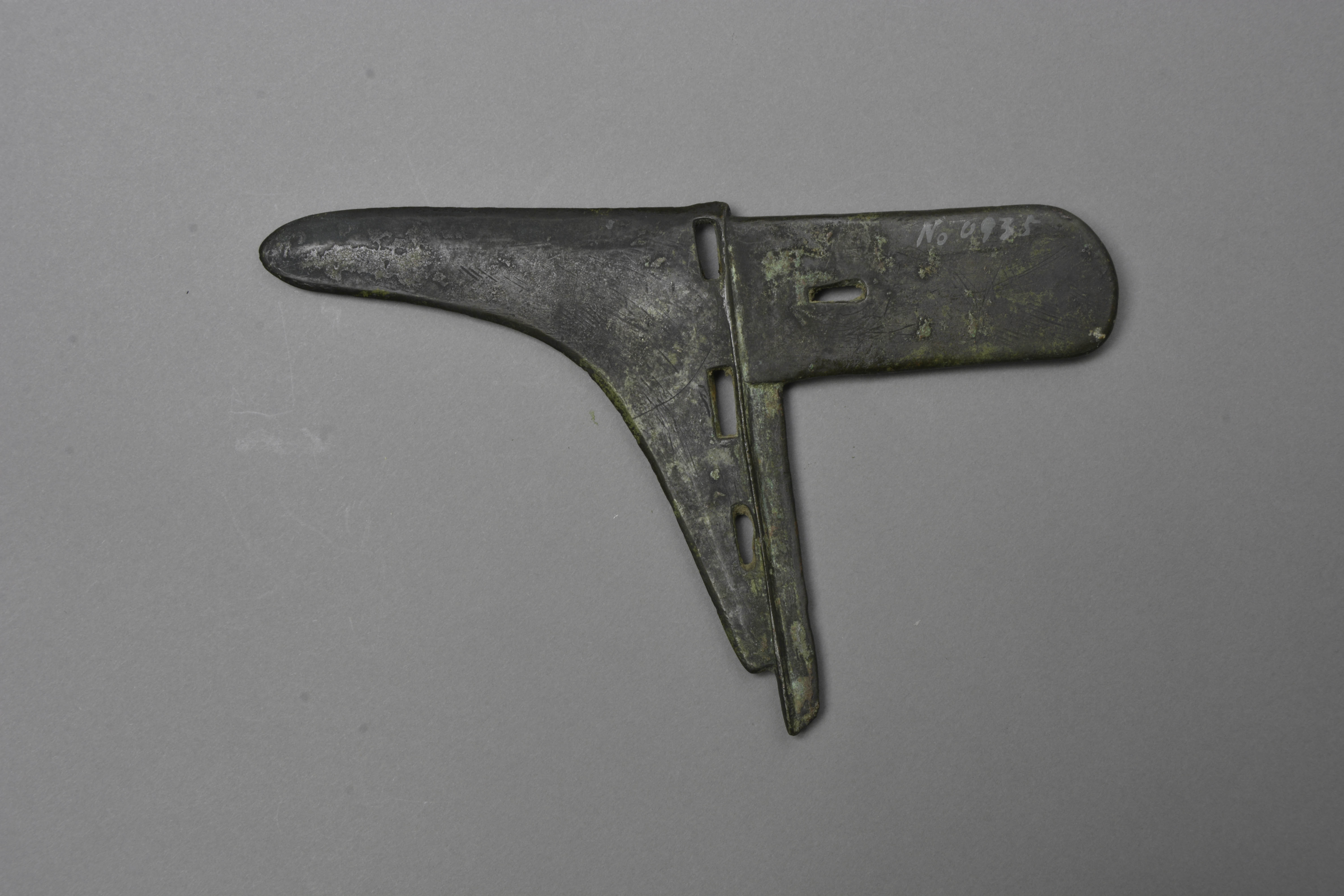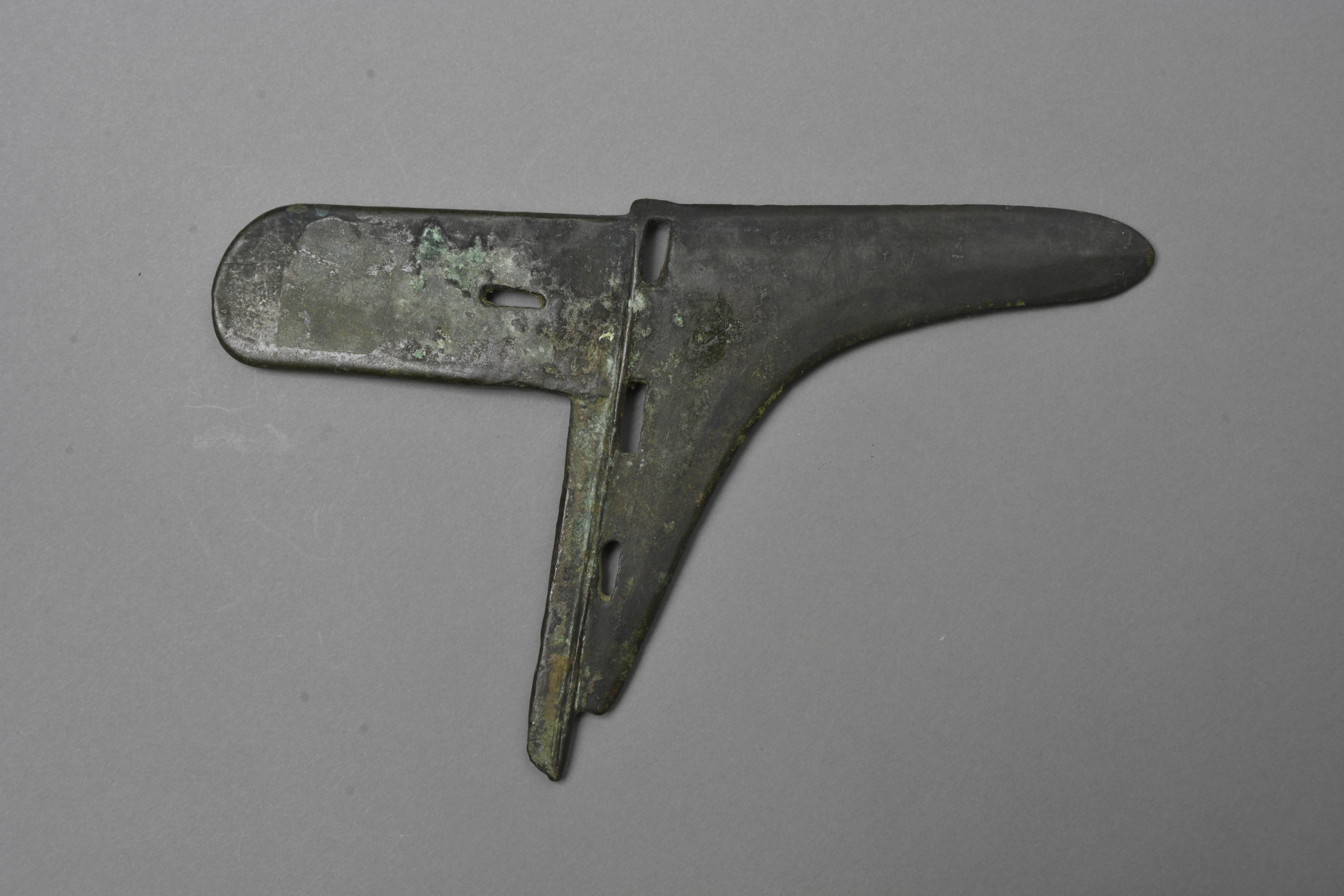 窄援微上扬,中长胡,下阑,阑侧三穿,长方形内上一长方形穿,内端部呈弧形。