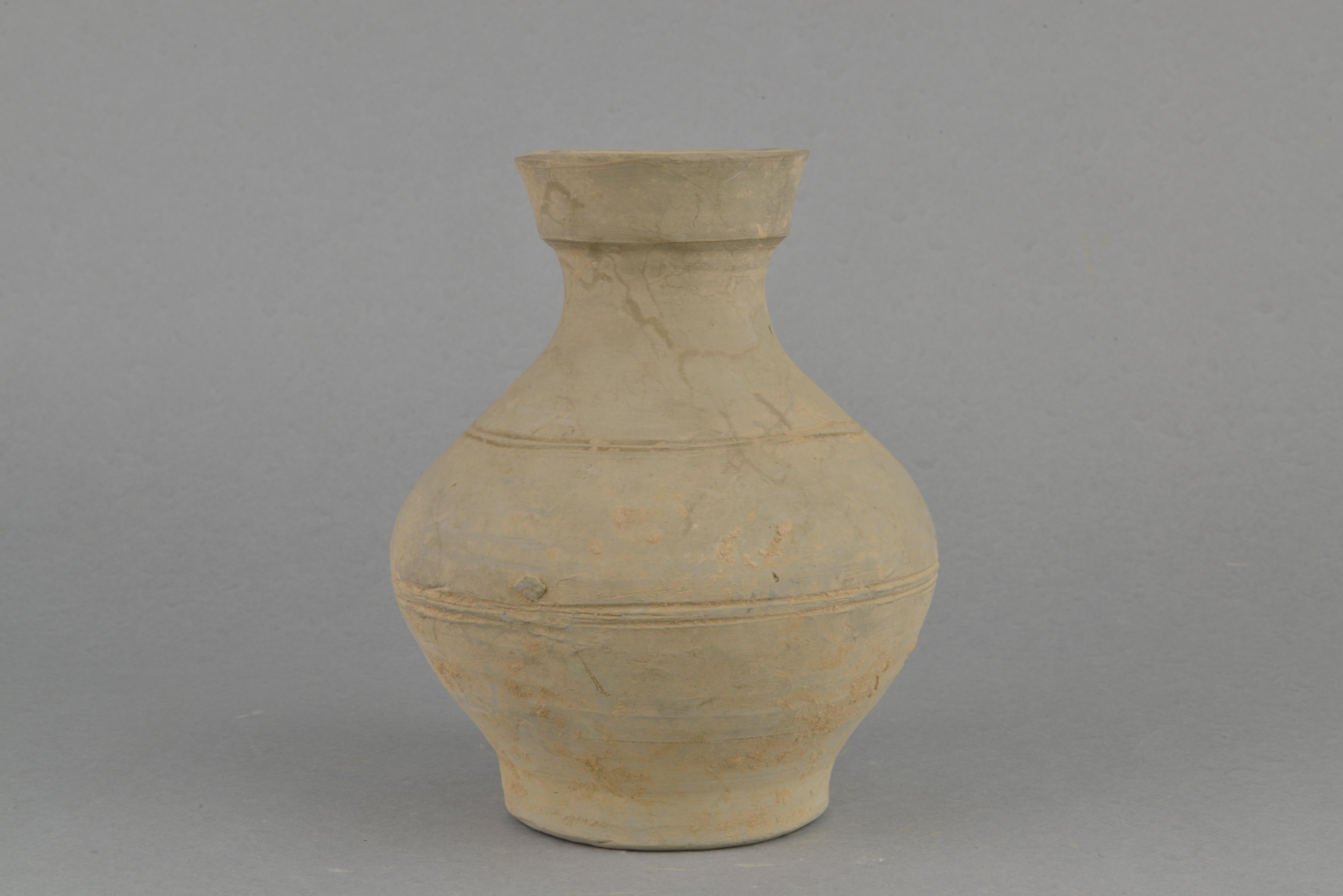 泥质灰陶。洗形口,束颈,鼓腹,假圈足,平底。腹部刻两组四周凹弦纹。