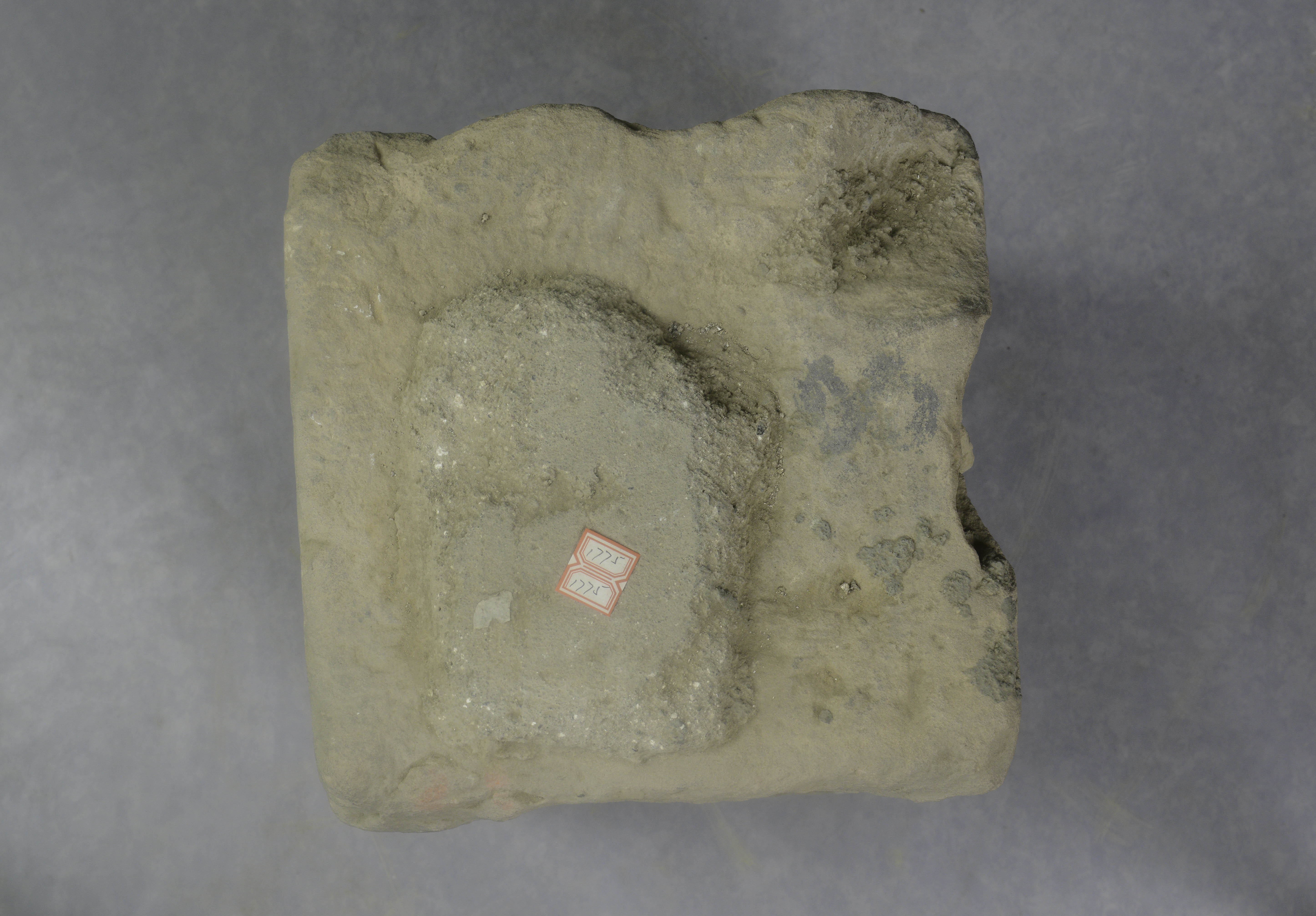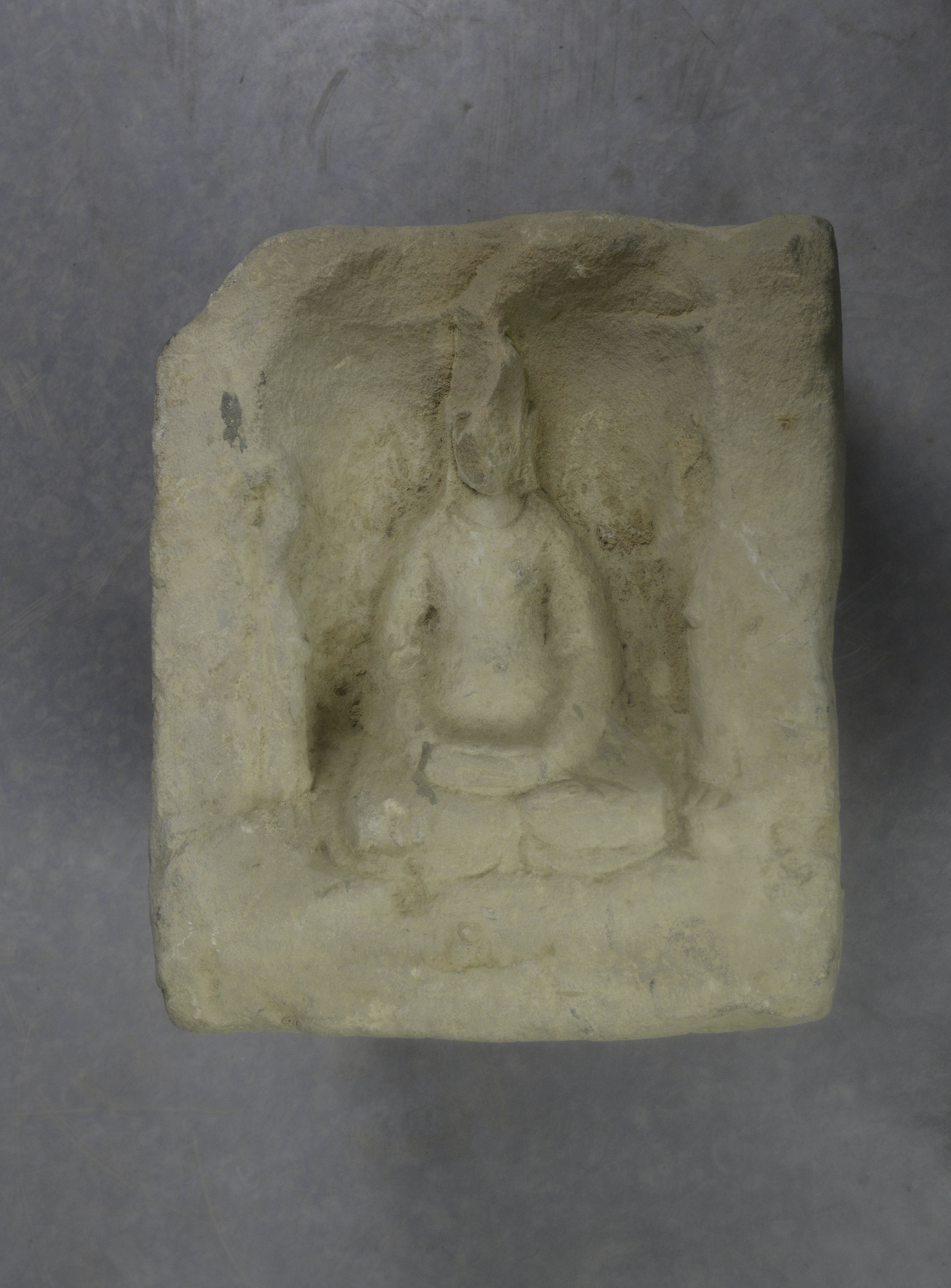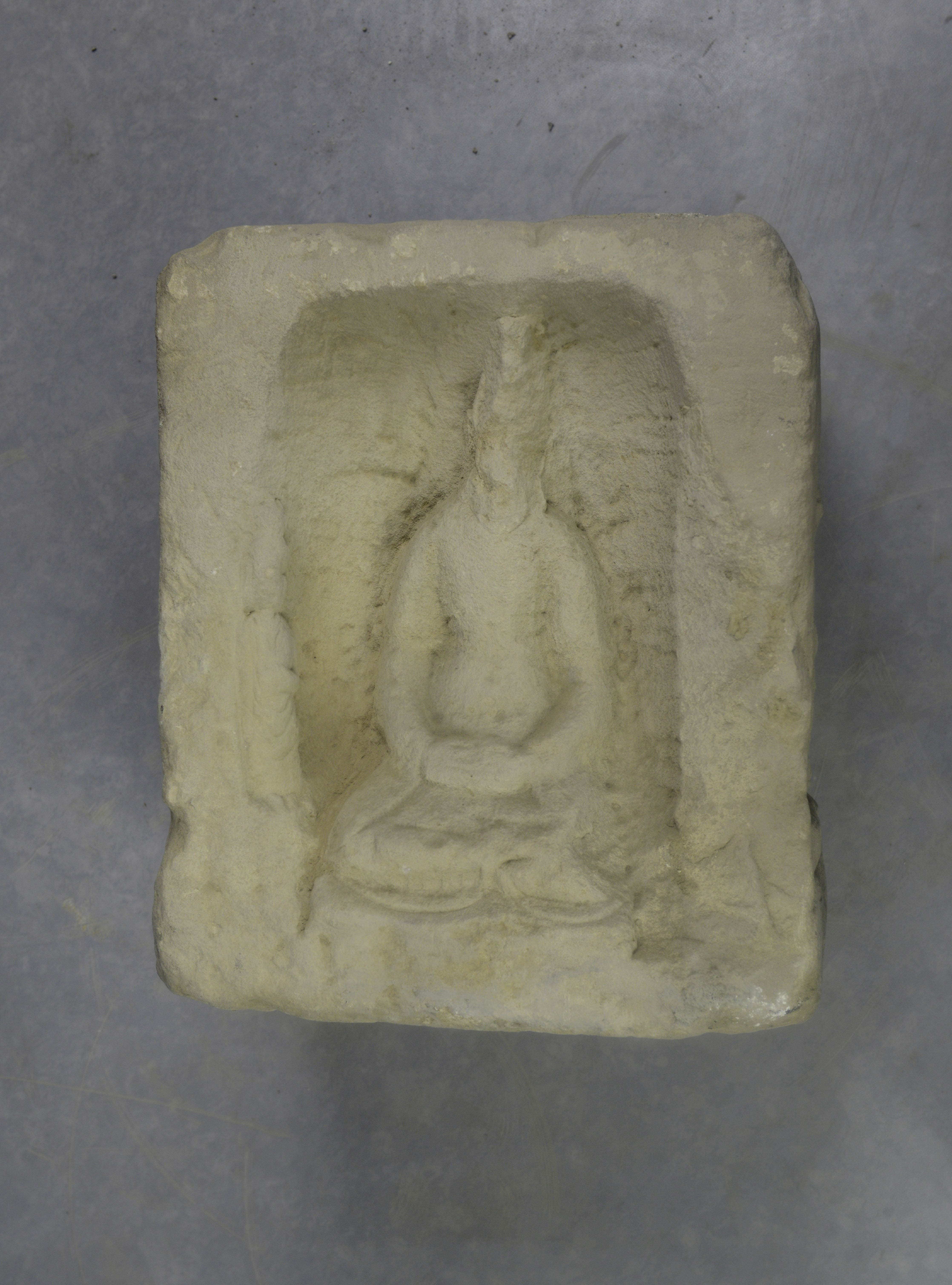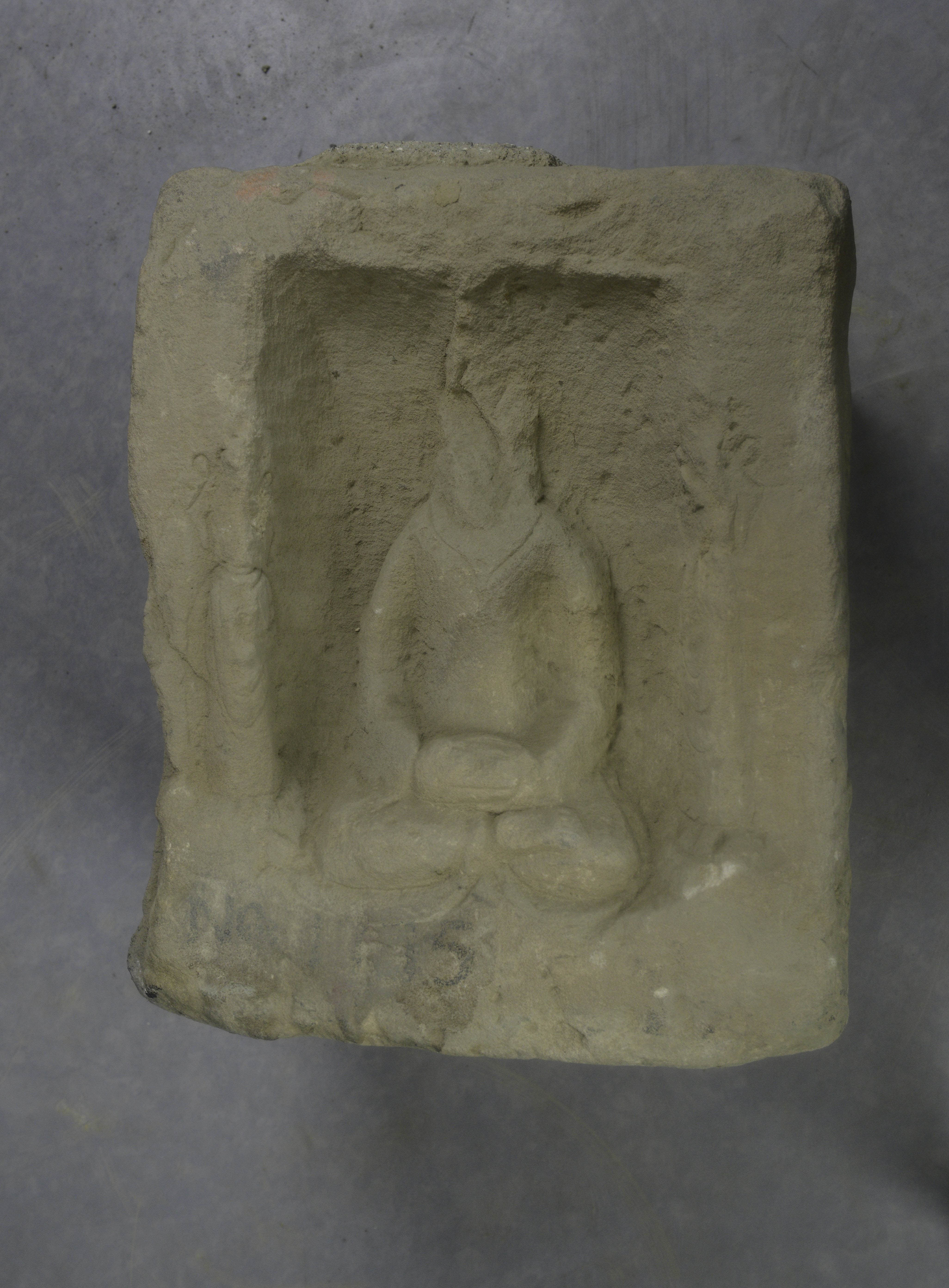 灰黄色细砂岩质。塔身作四面柱状,三壁开拱顶龛,一壁开方龛,内均雕一佛二菩萨造像,佛均结跏趺坐,施禅定印,风化严重,细部漫漶不清。