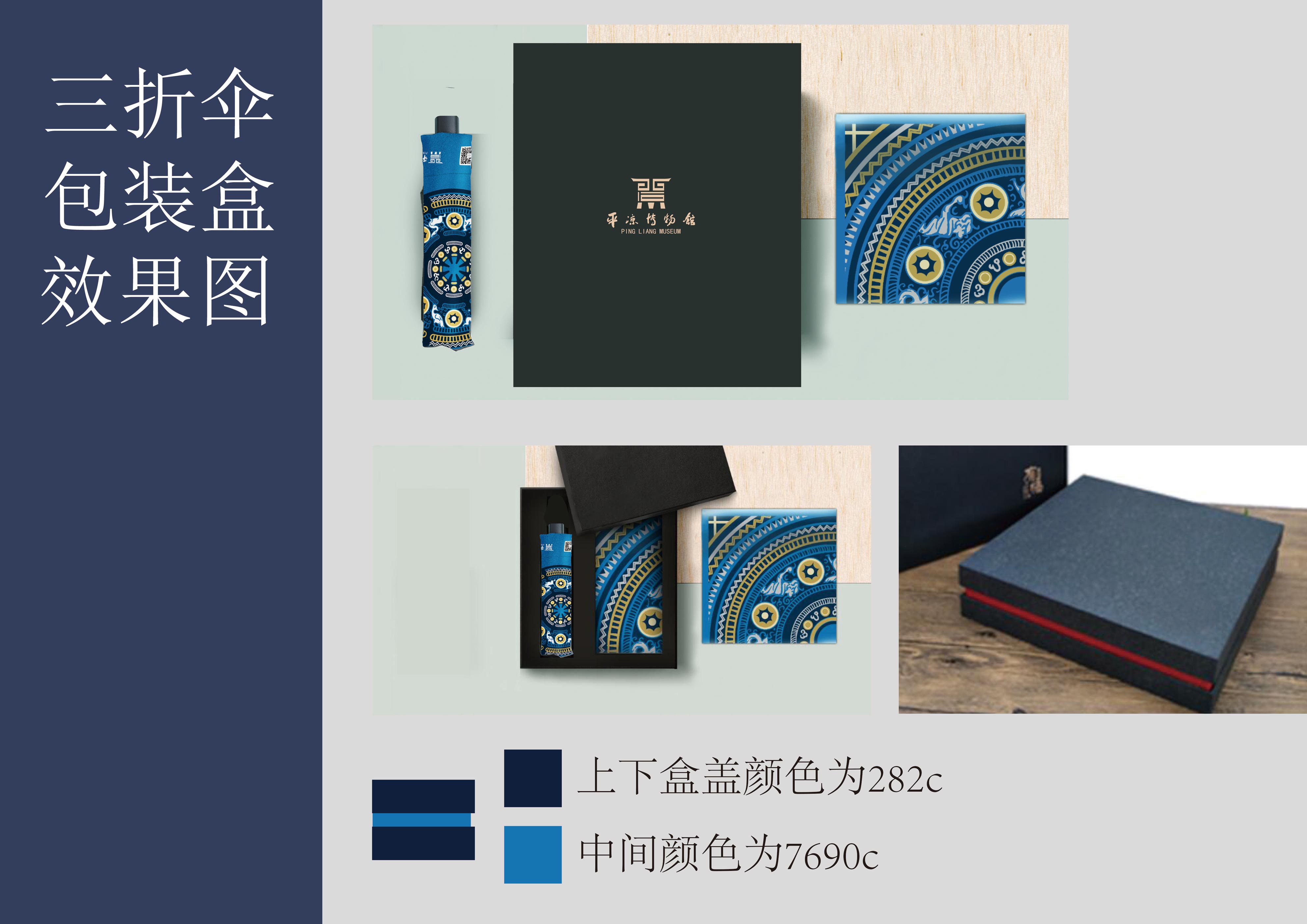 伞丝巾套装由丝巾和晴雨两用四折伞组合而成,外套围边天地盖礼盒,配手提袋。丝巾采用真丝材质,质地轻盈柔软,使用舒服;伞以零透光黑胶布为主要材质,伞架8骨,质量良好,使用轻巧方便。其上纹样均以平凉市博物馆馆藏汉代七乳羽人鸟兽纹铜镜上纹饰为题材稍加变化而成,用蓝黄黑白四色勾勒乳钉、羽人鸟兽、连弧纹等纹饰,寓意吉祥,色彩华丽,采用彩印加丝印工艺。此套装整体实用大气,花纹独特,文化特色明显。